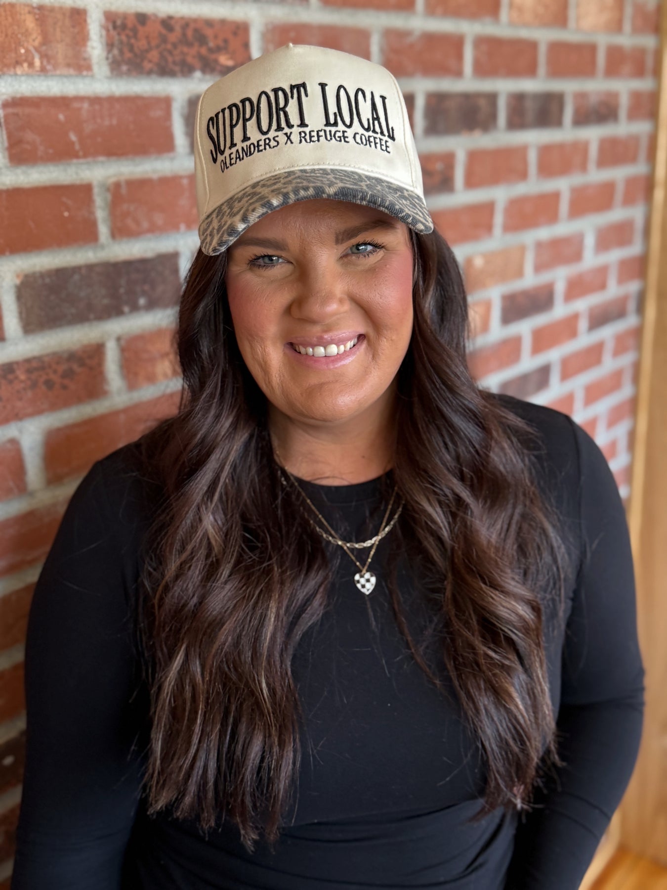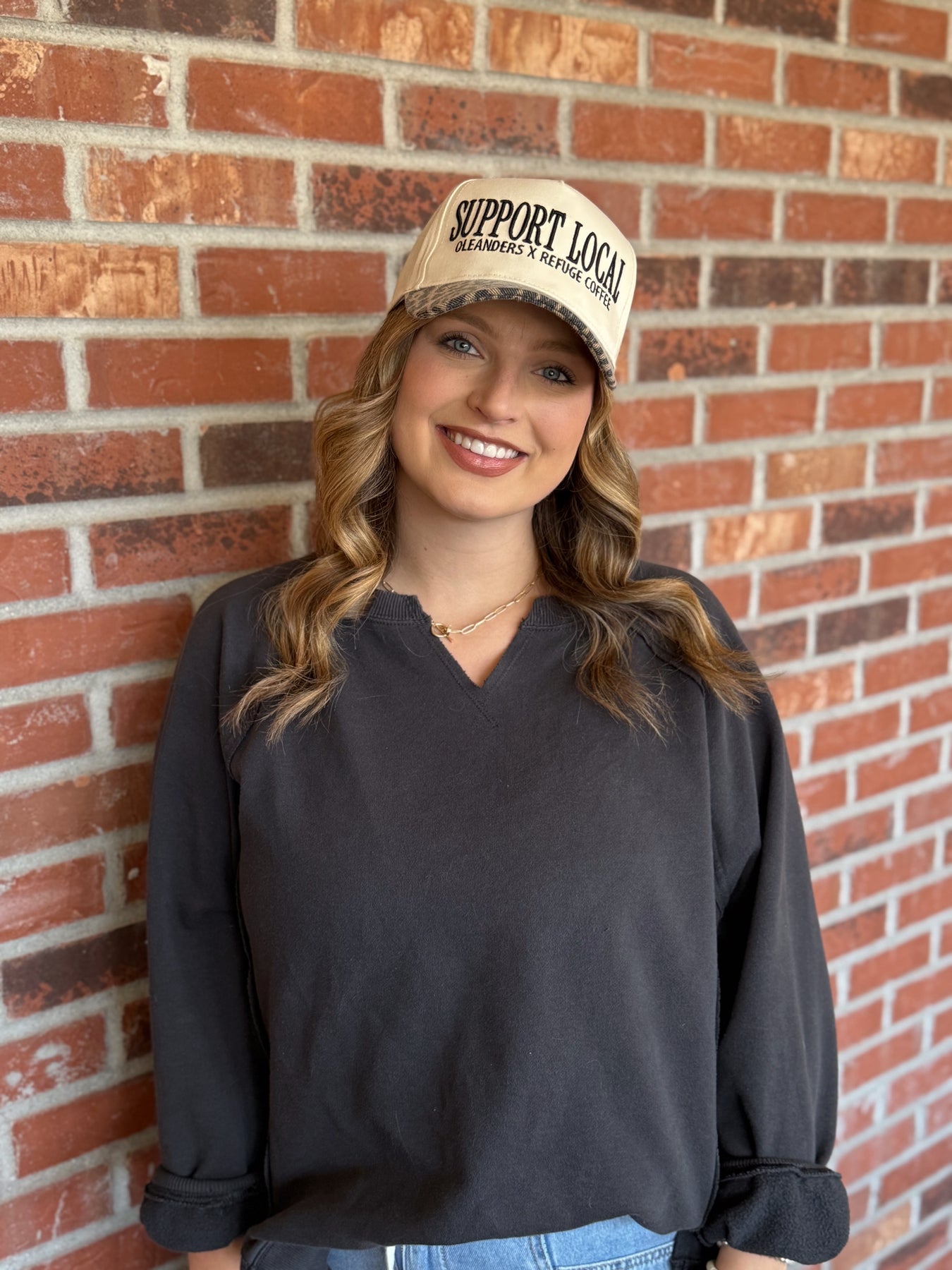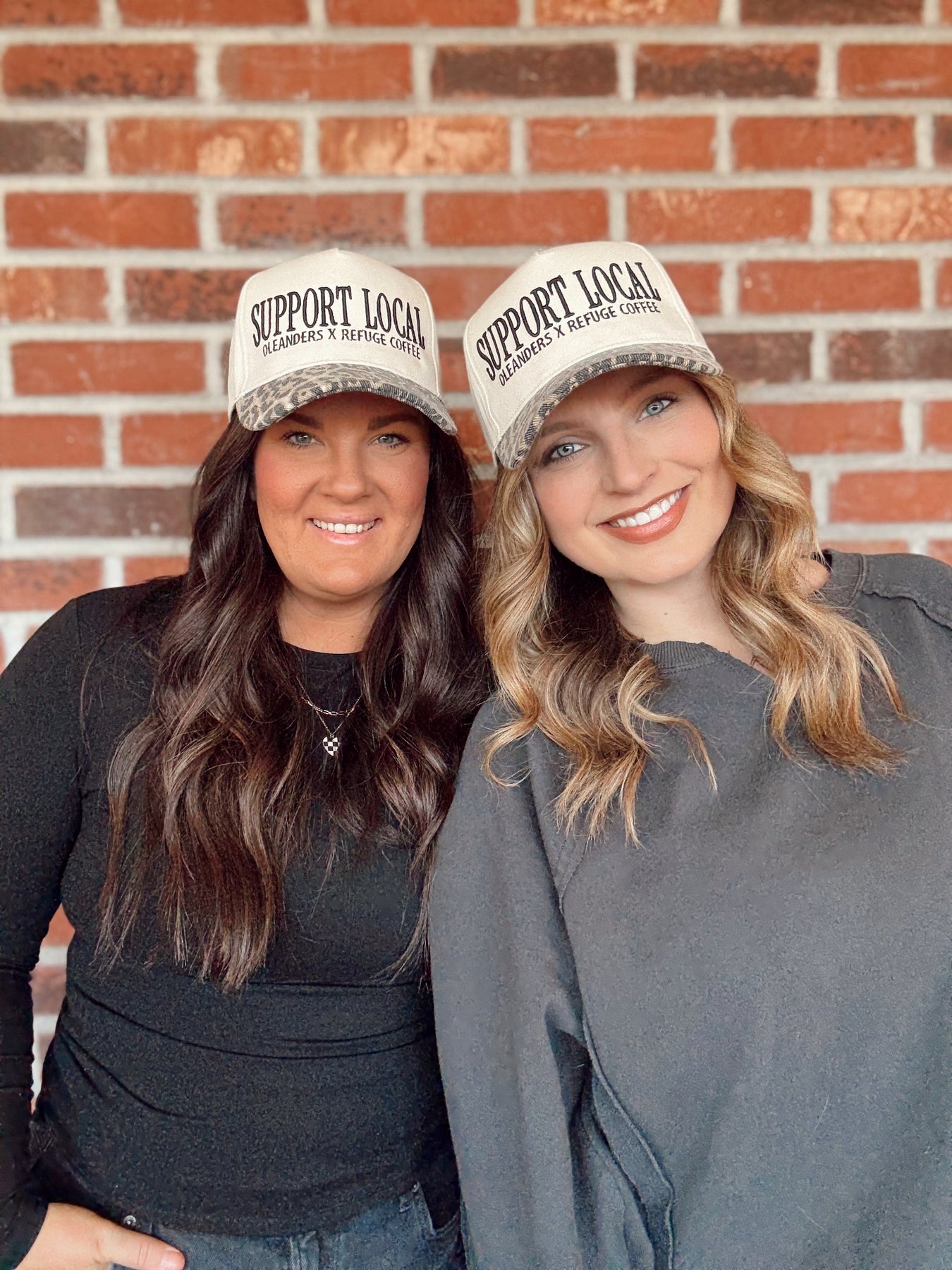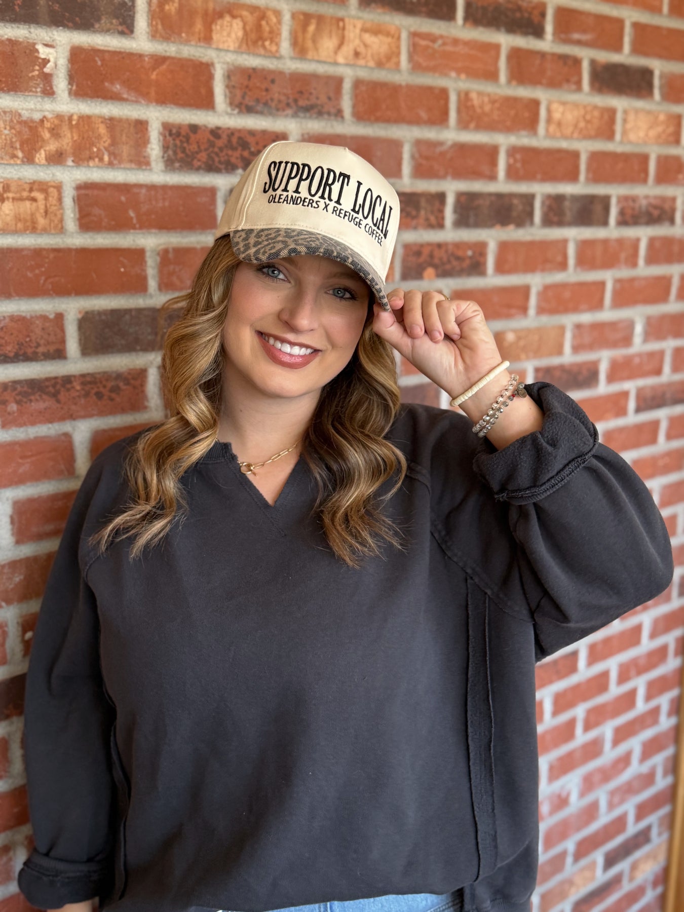 Two small-town favorites, one perfect hat. The Support Local Trucker Hat is a collab between Oleanders Boutique and Refuge Coffee — celebrating community, caffeine, and local love. With its neutral front, bold “Support Local” graphic, and a touch of leopard on the bill, it’s equal parts cozy boutique style and coffee shop cool
