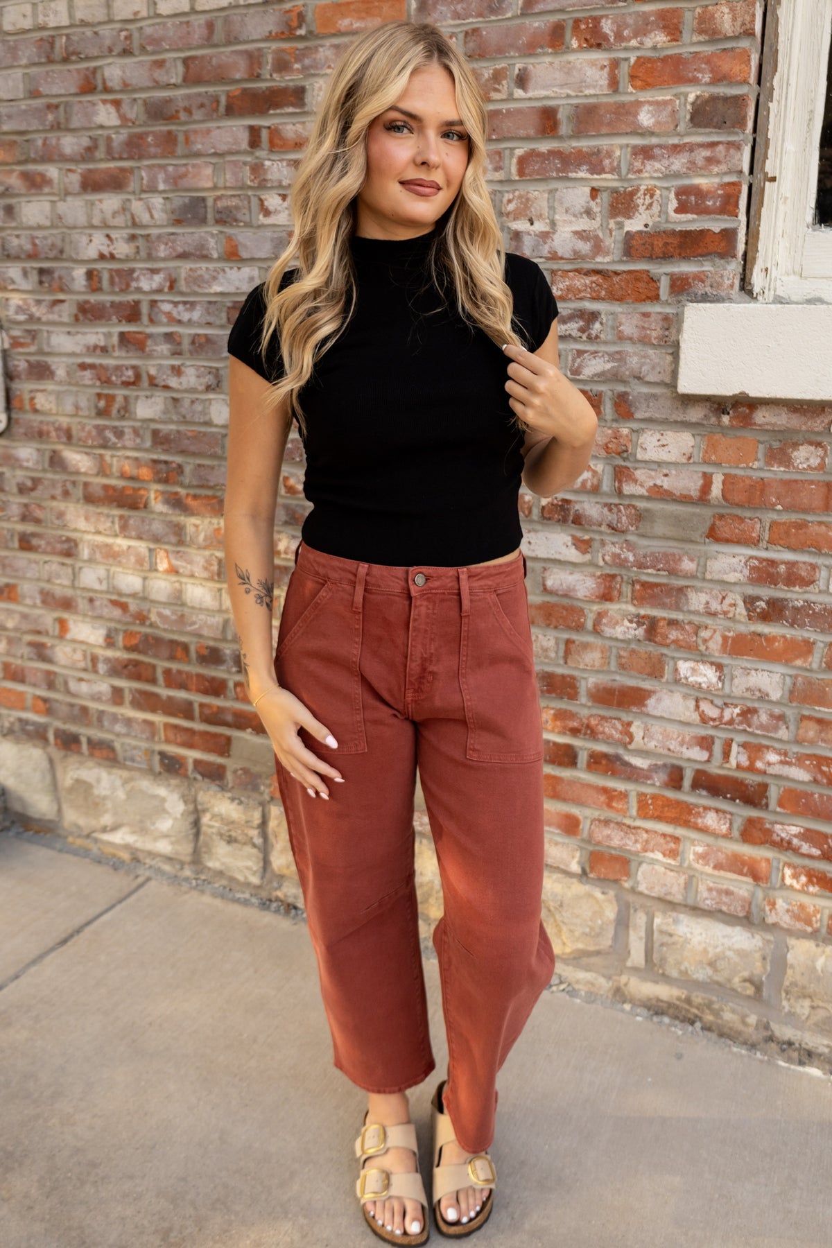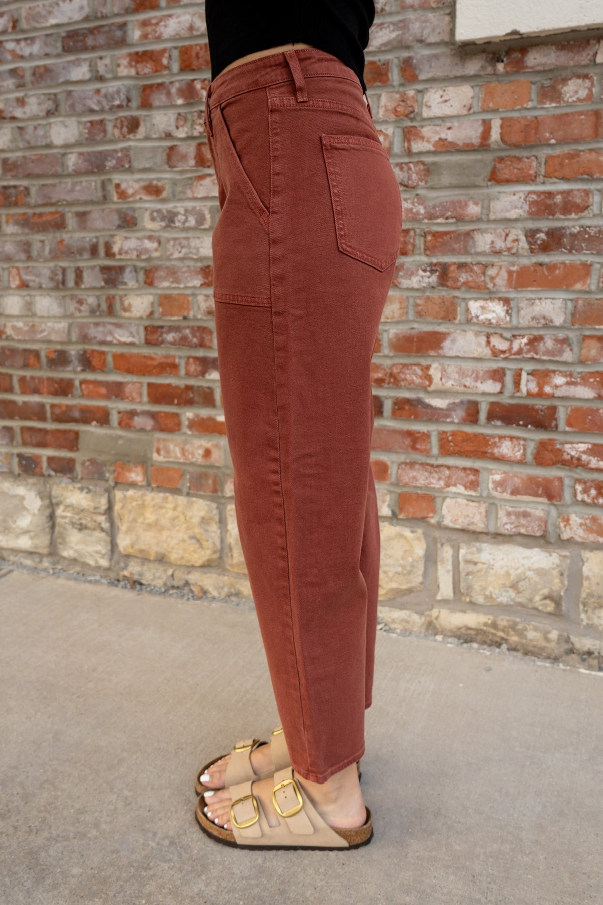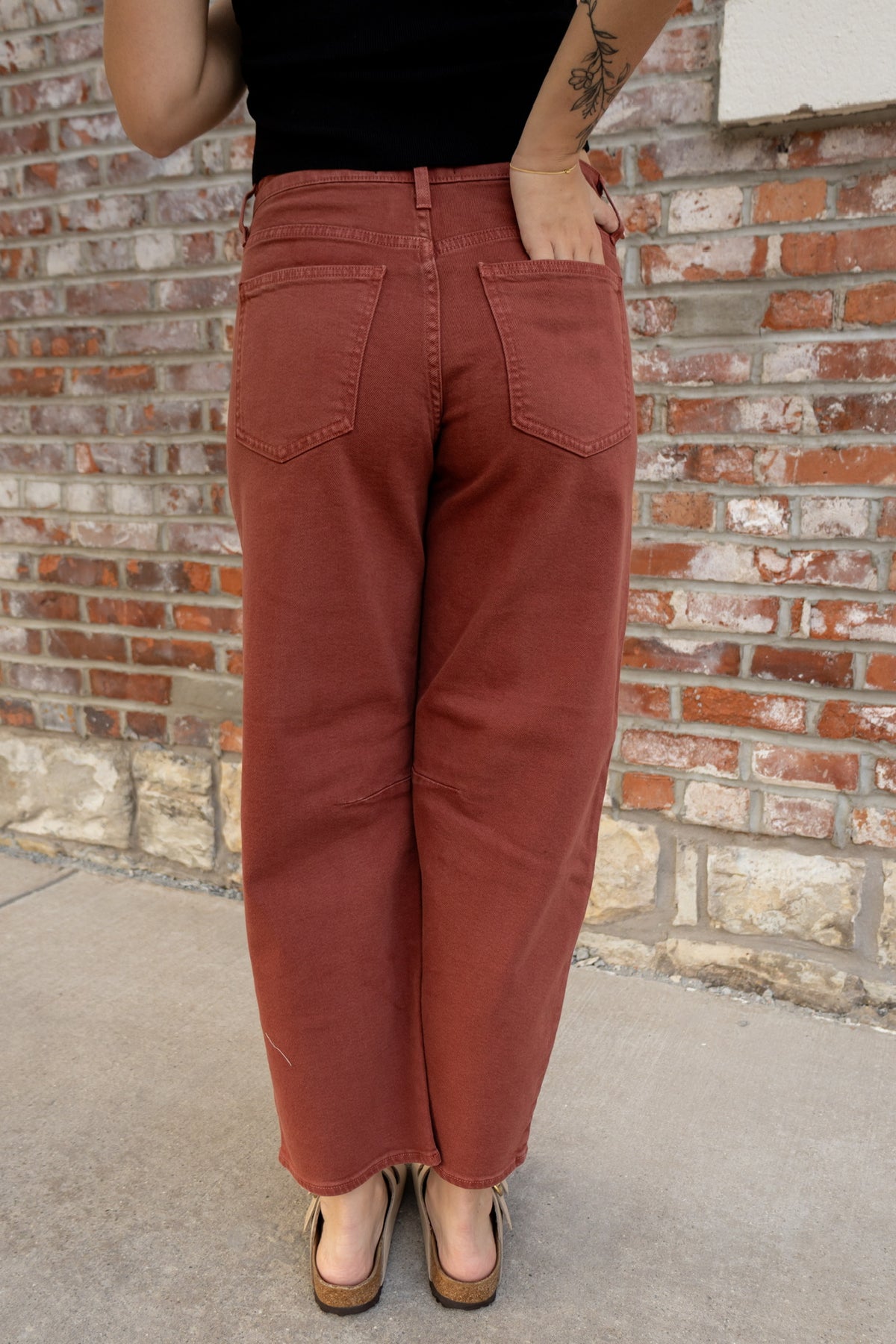 With a chic mid-rise fit, these jeans provide the perfect balance of comfort and tailored elegance, ideal for long-lasting wear throughout the day. Its front patch pockets add a distinctive, utilitarian touch, while the barrel-shaped leg creates a relaxed, slightly tapered fit for a laid-back, on-trend look.