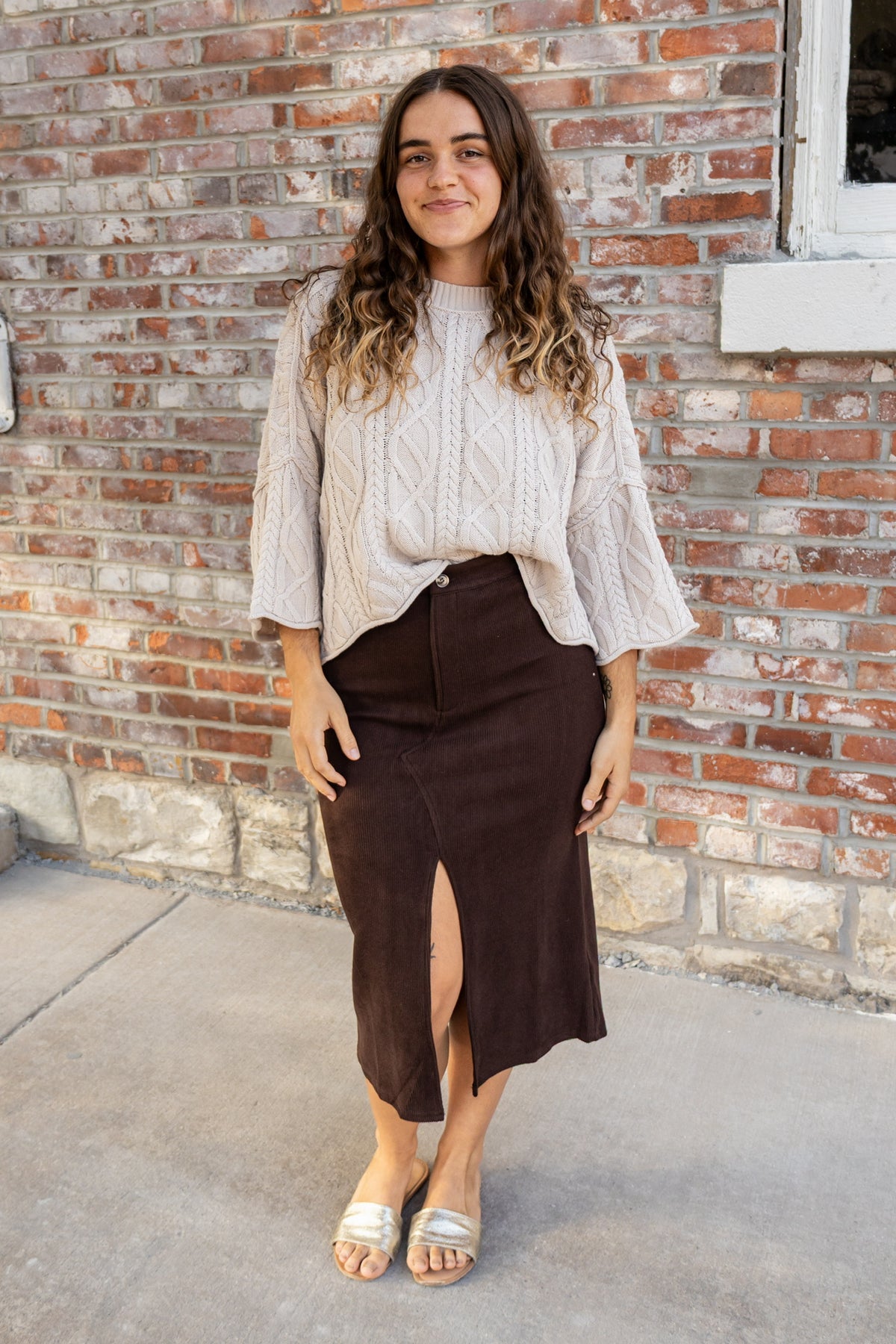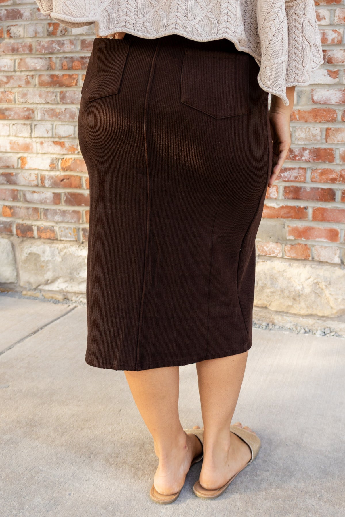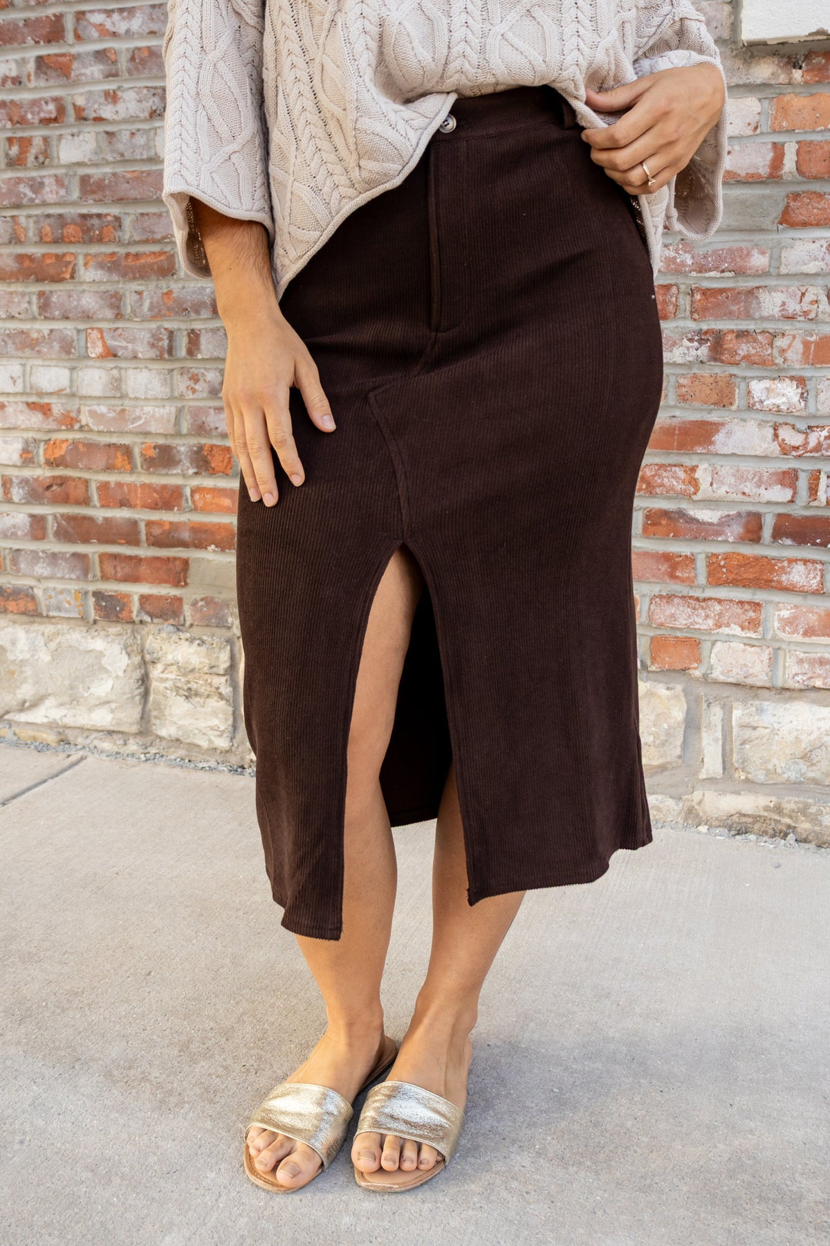 The Corduroy Cowgirl midi skirt blends classic charm with modern ease. Made from soft, stretch corduroy, it features a flattering fit and a front slit for effortless movement. Whether paired with cozy knits, crisp blouses, or casual tees, this versatile skirt brings a touch of western-inspired style to your everyday wardrobe.