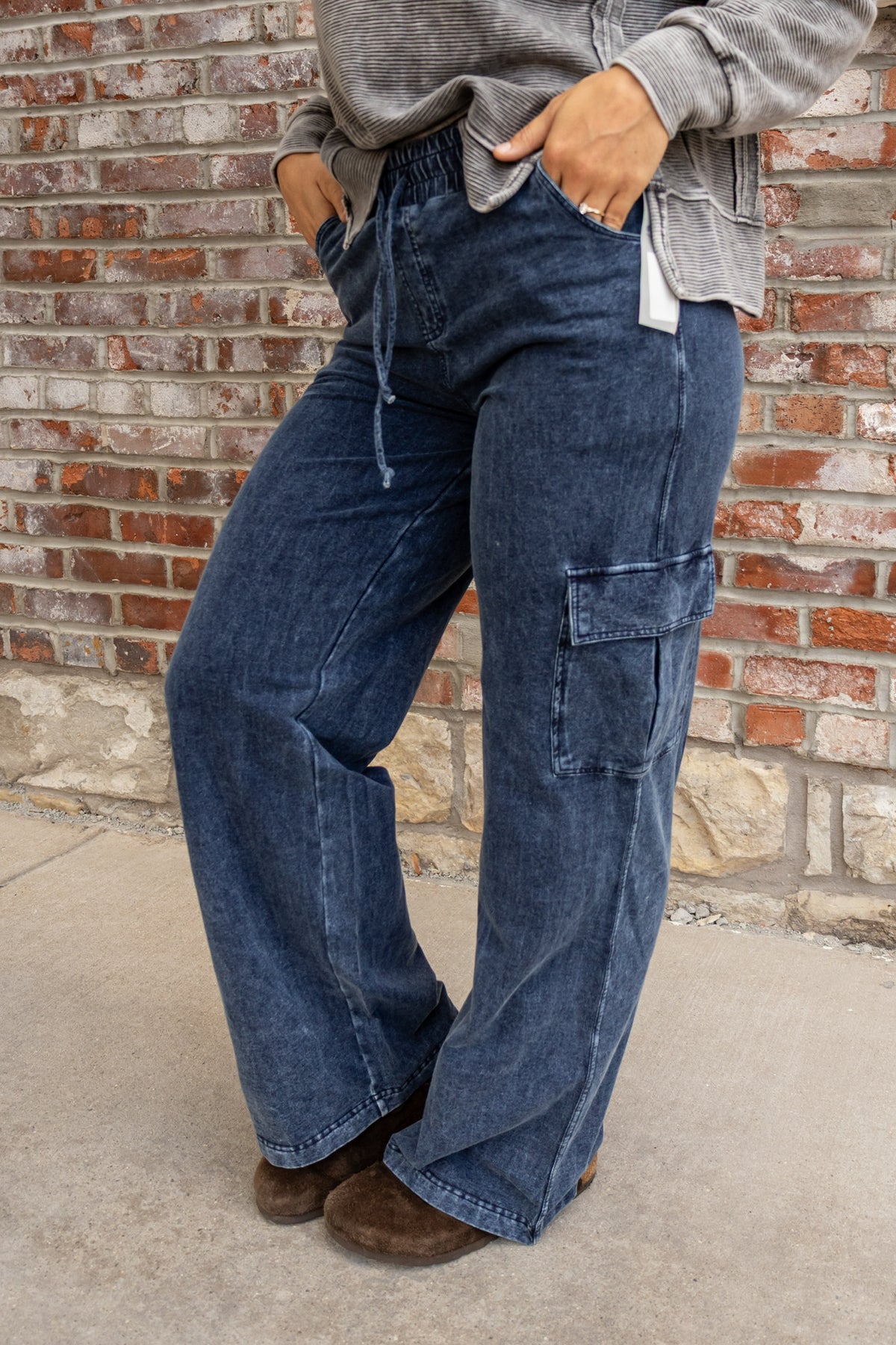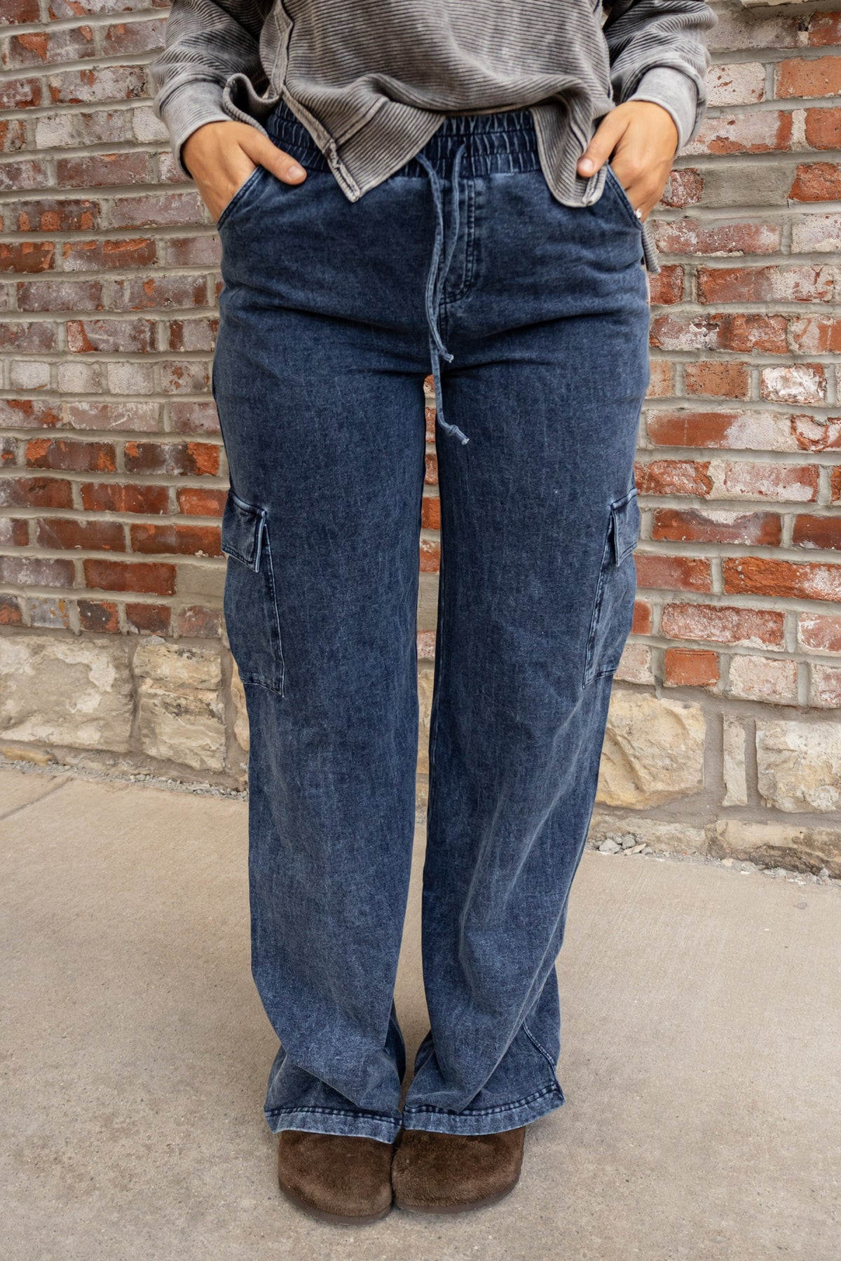 Meet your new laid-back favorite: Lounge Denim Days. These mineral wash denim cargo pants bring effortless comfort with a wide-leg silhouette and an elastic waistband for the perfect fit. Crafted from soft cotton, they feature roomy pockets for everyday essentials, making them ideal for lounging, running errands, or casual weekend vibes.