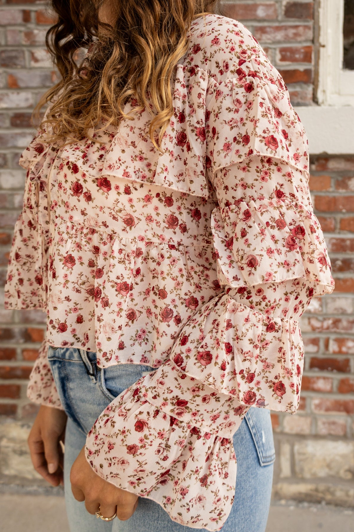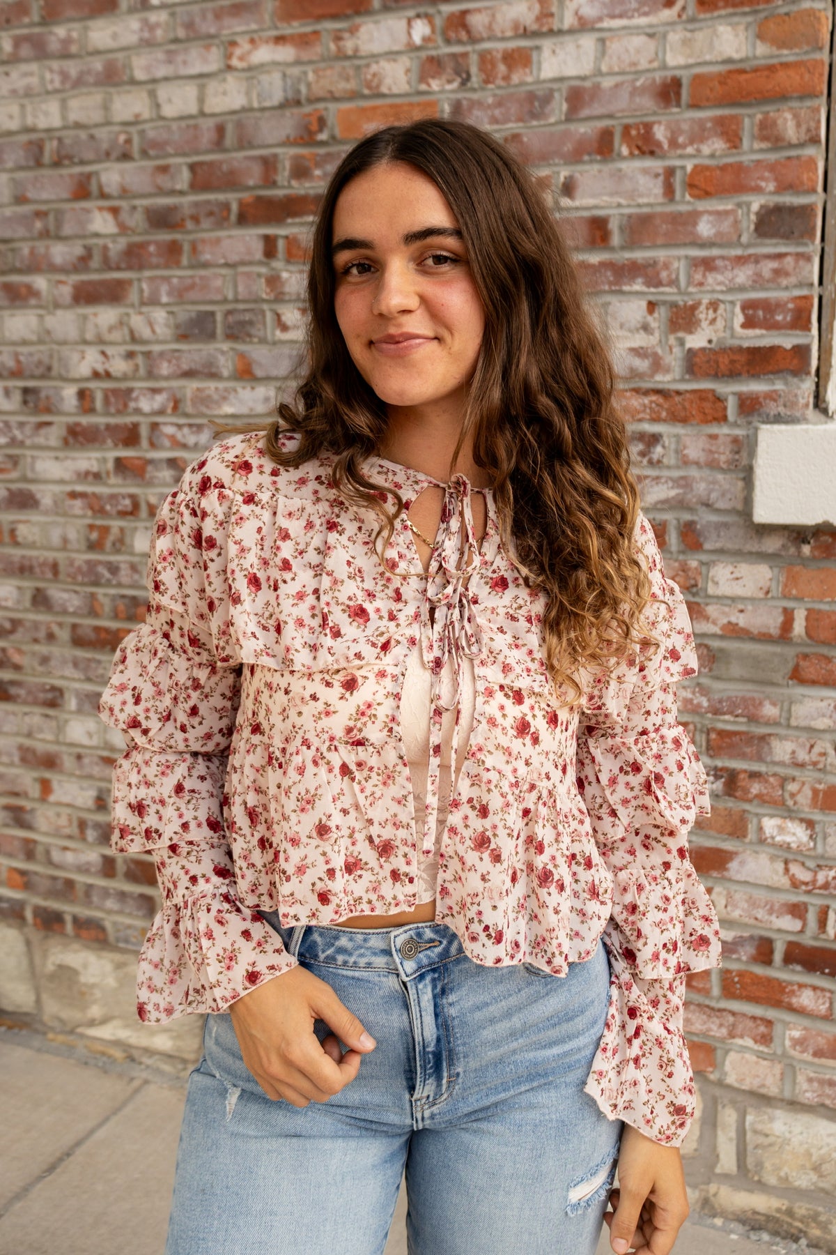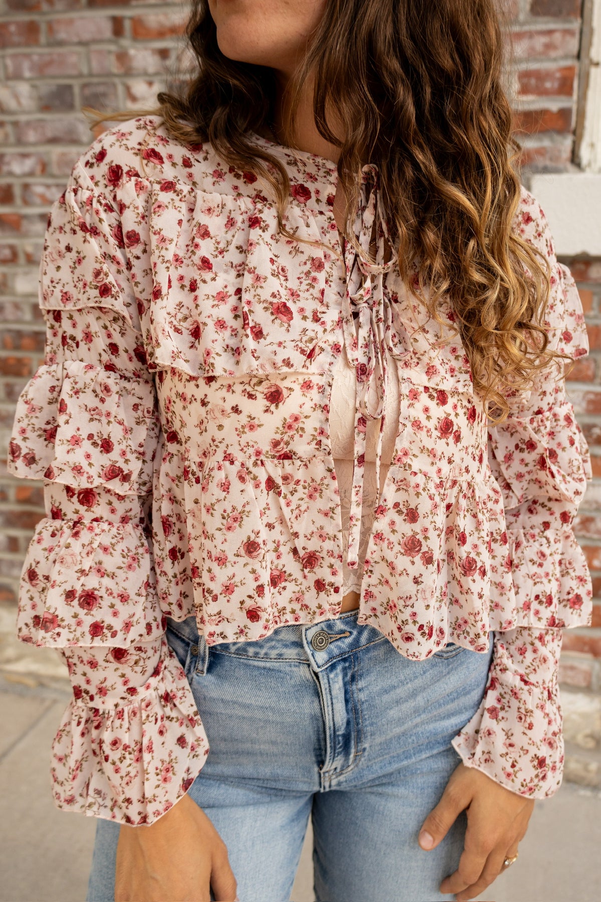 The Rose Ruffles blouse is a romantic, feminine statement piece. Featuring a delicate floral print, long sleeves, and tiered ruffle details, it adds movement and charm to any look. Front ties at the neckline offer a flirty, adjustable touch, making this blouse perfect for pairing with jeans, skirts, or layered under jackets for a polished, effortless style.