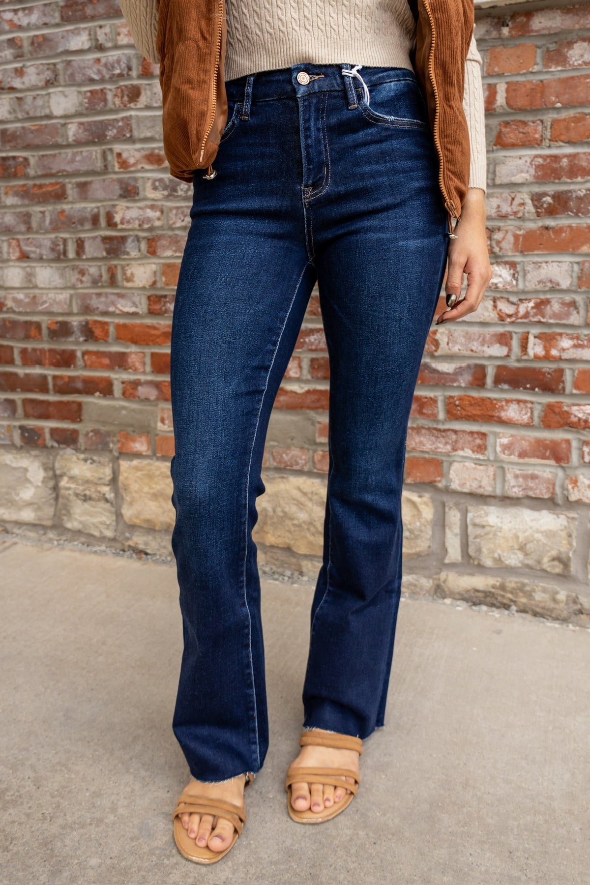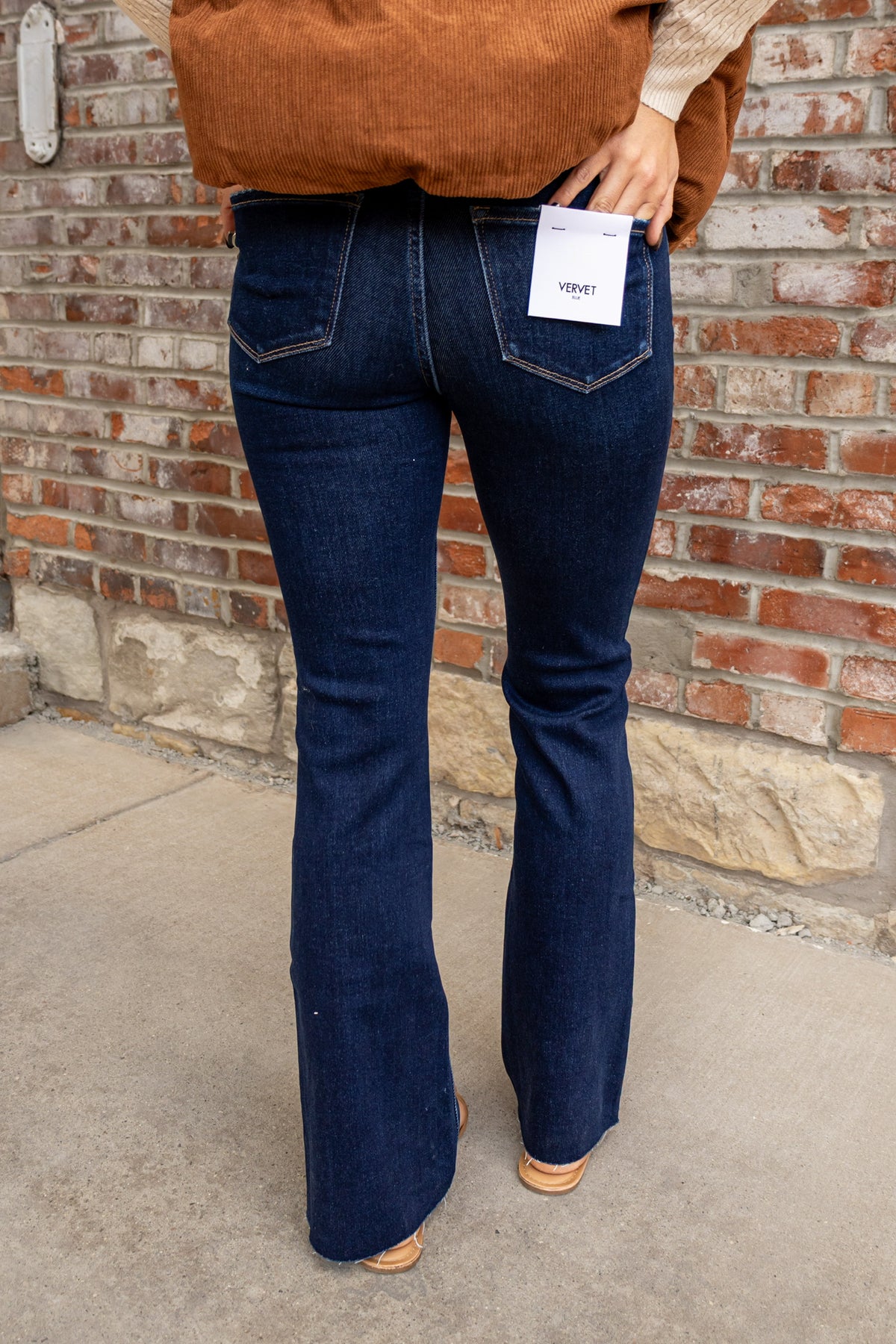 The Uplifted Gleam jeans by Vervet offer a sleek, flattering silhouette with a modern twist. Crafted in a dark wash with a high-rise fit, bootcut leg, and raw hem, they elongate the legs while adding subtle edge to your look. Perfect for pairing with heels, boots, or casual sneakers, these versatile jeans bring effortless style to any outfit.
