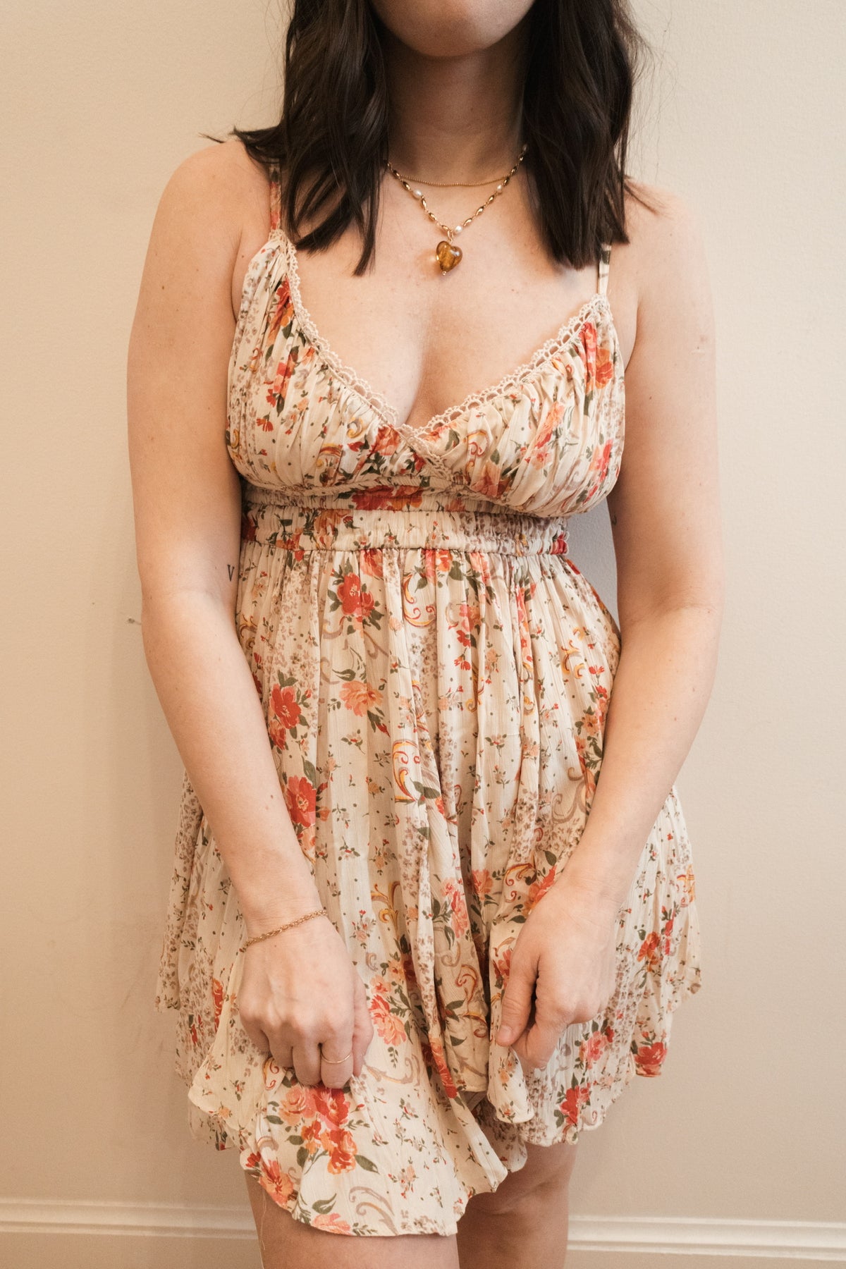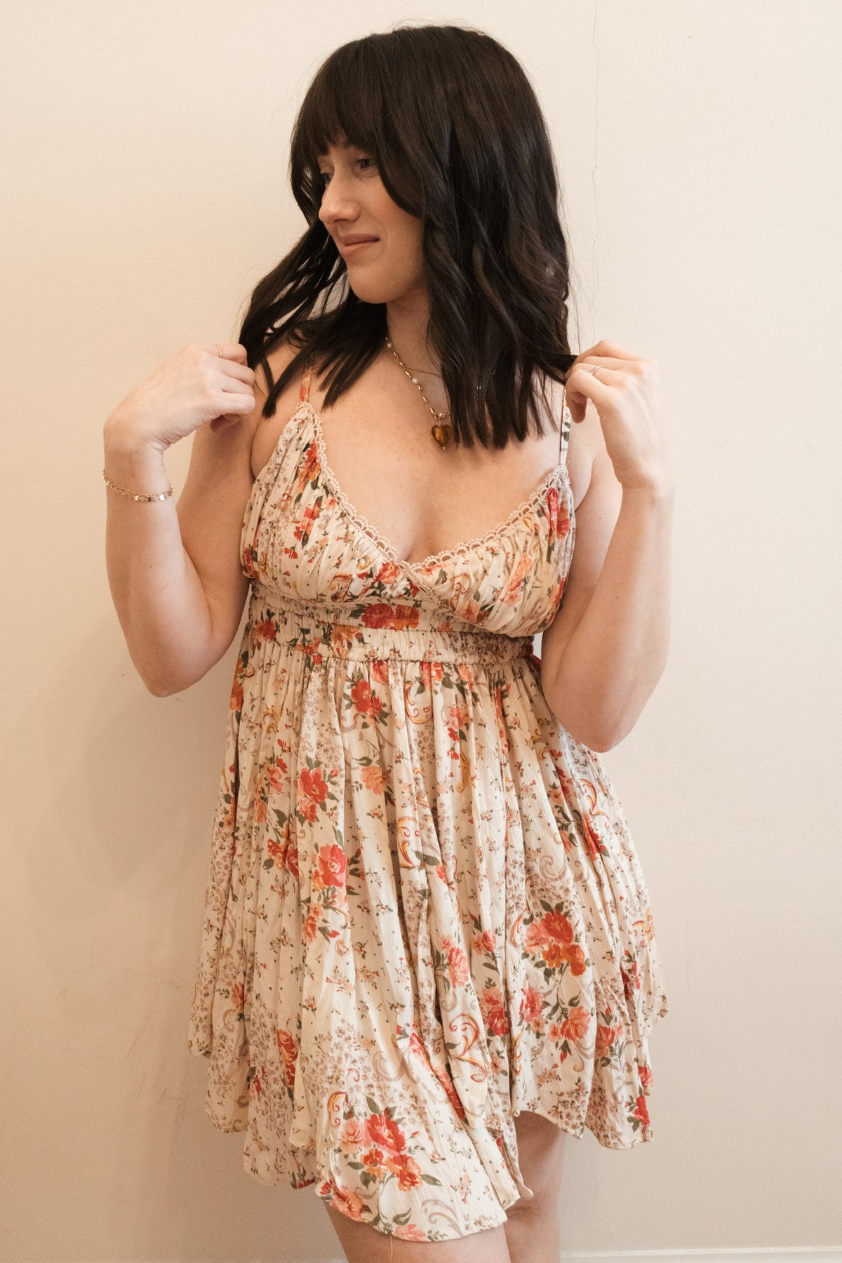 The Blush Meadow Lace Dress is a delicate blend of romance and ease. Set on an ivory base with soft olive and pink florals, it features a feminine V-neckline detailed with lace, adjustable spaghetti straps, and a smocked waistband for a flattering, comfortable fit. Flowing gently to a midi length, this dress is perfect for garden parties, brunches, or any day you want a soft, effortlessly charming look.