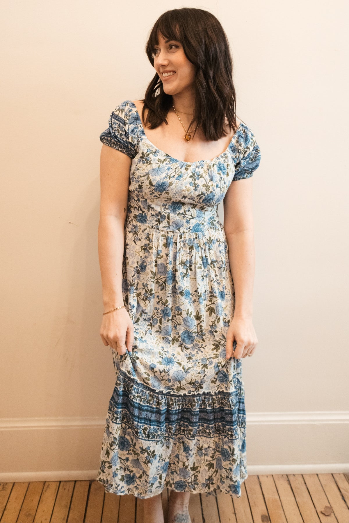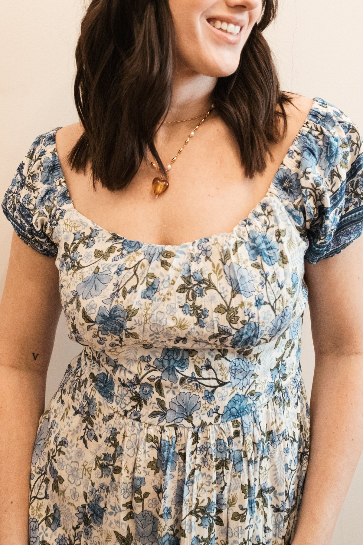 The Periwinkle Grove Maxi Dress captures a calm, effortless beauty with its soft blend of ivory, olive, and periwinkle hues. A gently smocked bodice offers a flattering, comfortable fit, while cap sleeves add a touch of feminine charm. Flowing into a graceful full-length skirt, this dress is perfect for garden gatherings, weekend outings, or anytime you want an easy, polished look that feels as lovely as it looks.