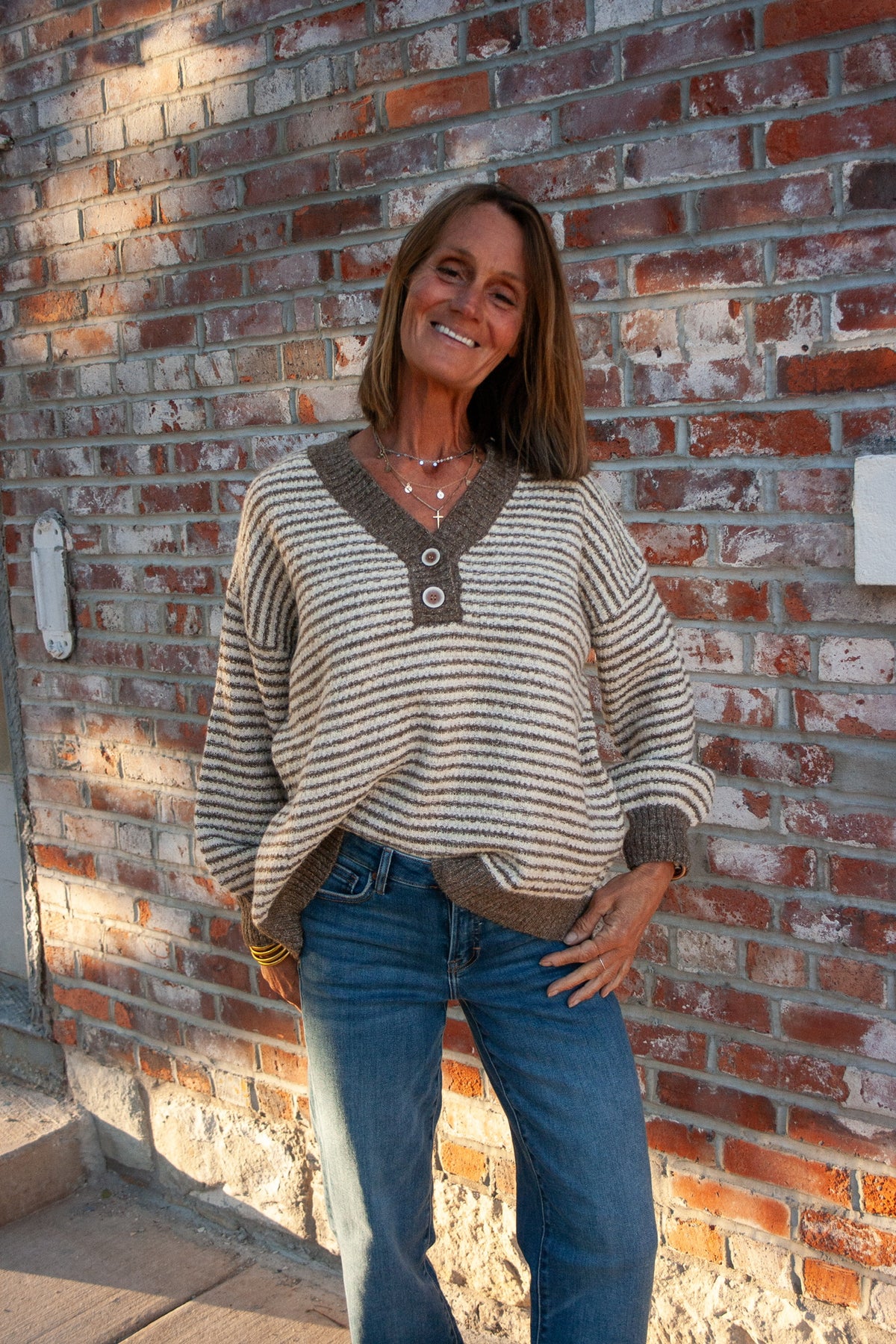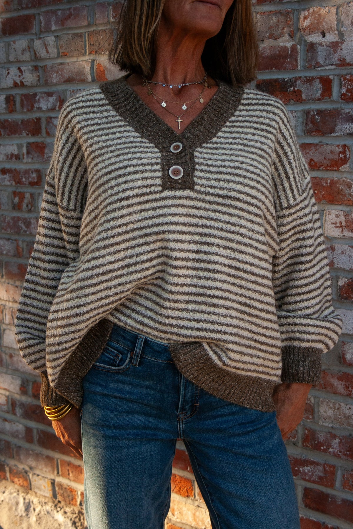 Add some sparkle to your wardrobe with our Banana Splits v neck striped sweater! The soft pink and yellow stripes, paired with the charming brown trim and subtle sparkles, make for a unique and eye-catching sweater. With a comfortable v neck and 2 button detail, this sweater will be your new favorite!