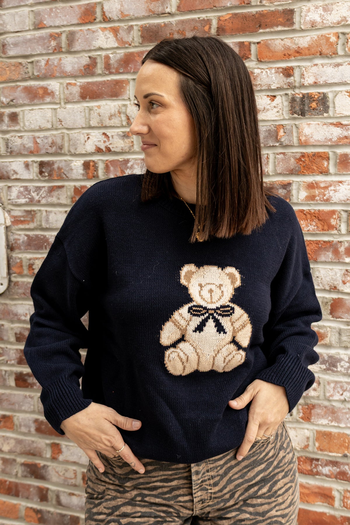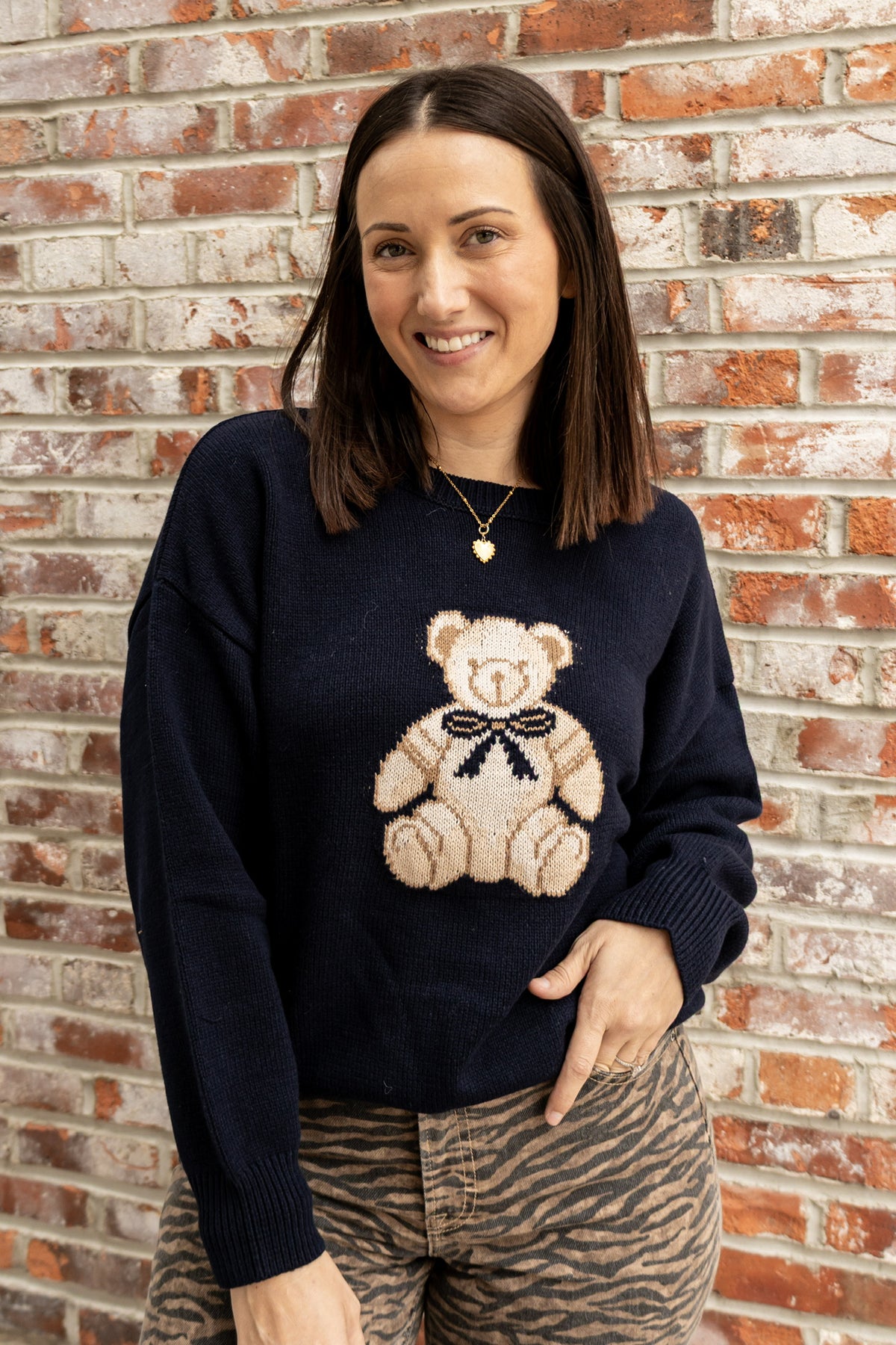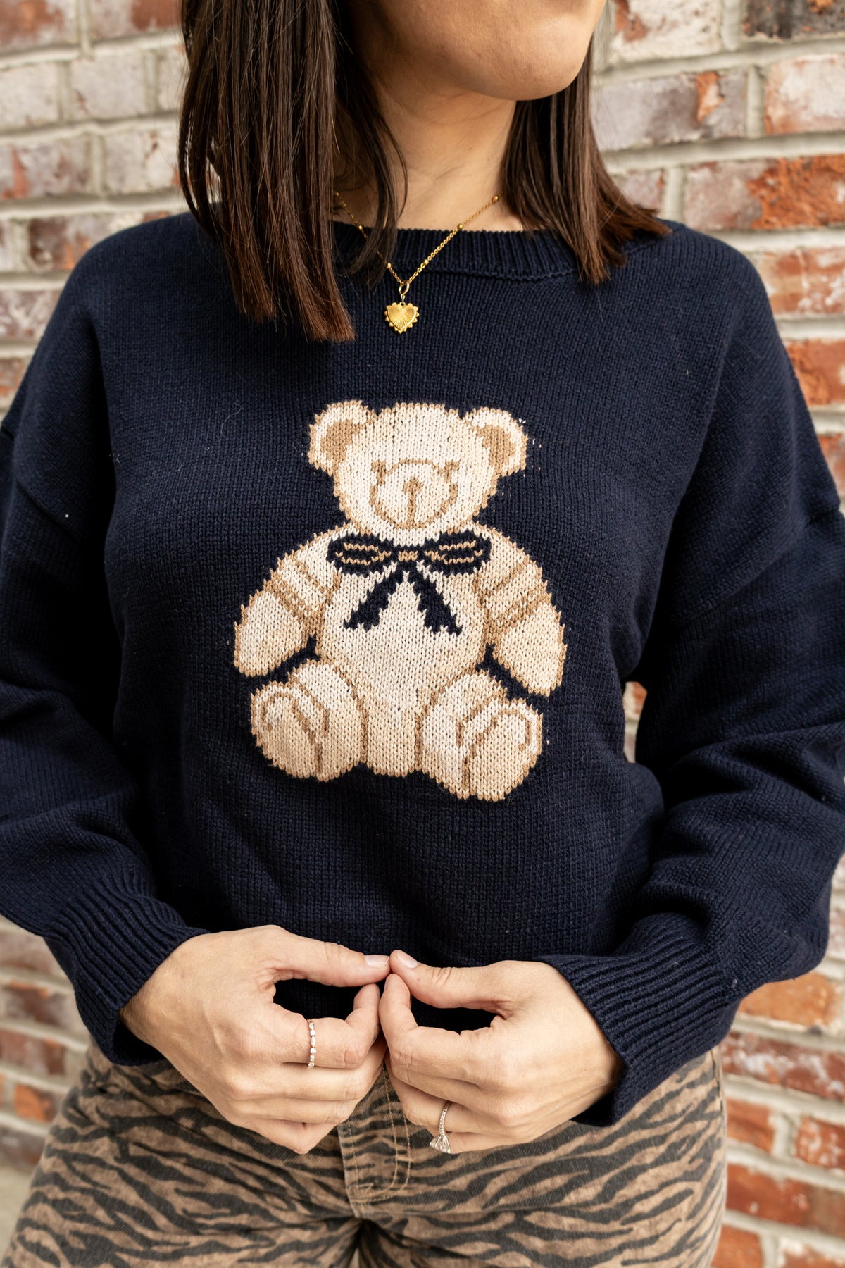 Stay cozy and stylish with the Beary Sweet navy blue crew neck sweater. Crafted from a soft cotton blend, its wider fit ensures comfort without compromising on shape. The charming bear graphic adds a playful touch, making it perfect for casual days or layering. Embrace warmth and cuteness in one versatile piece.