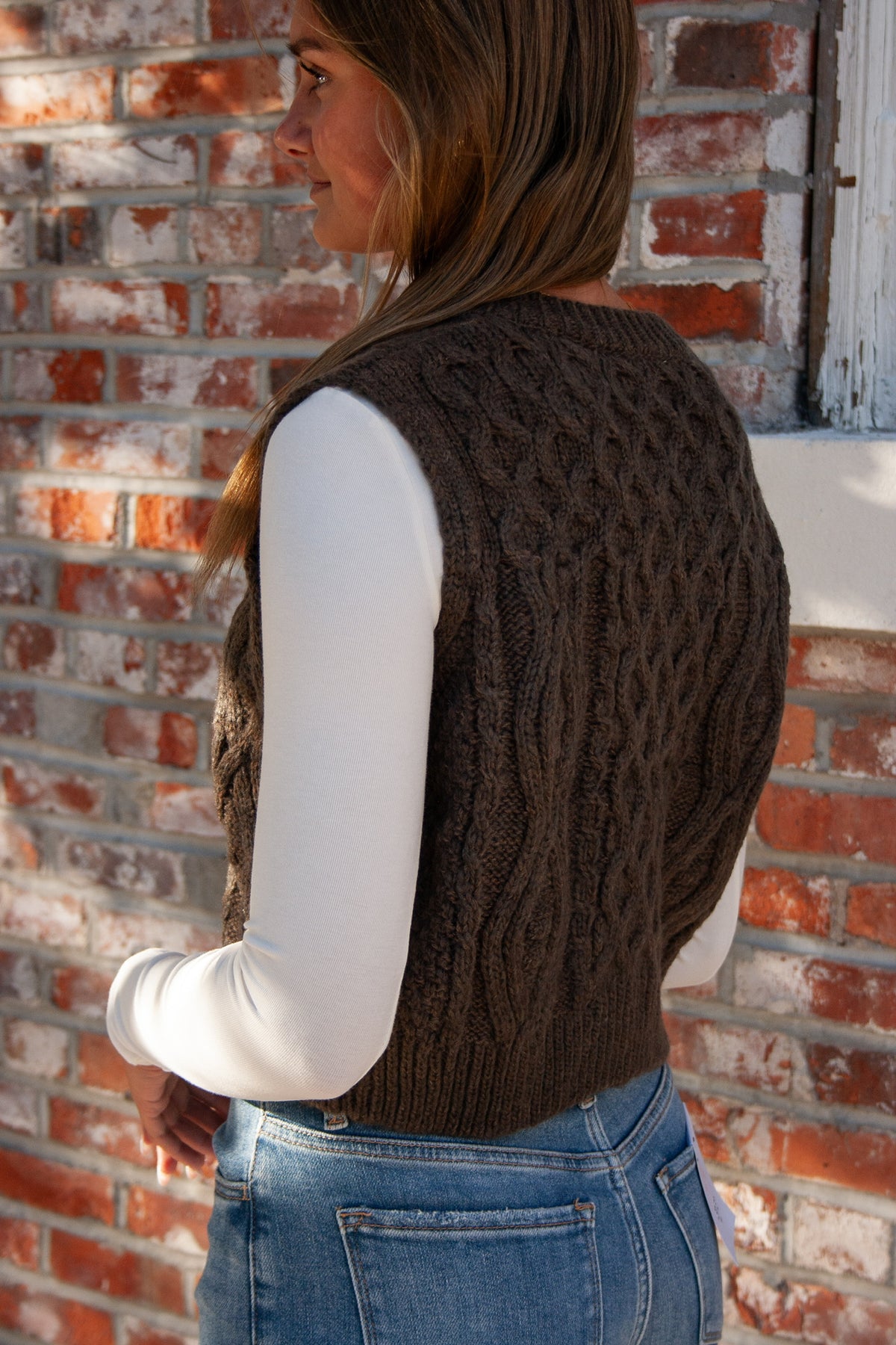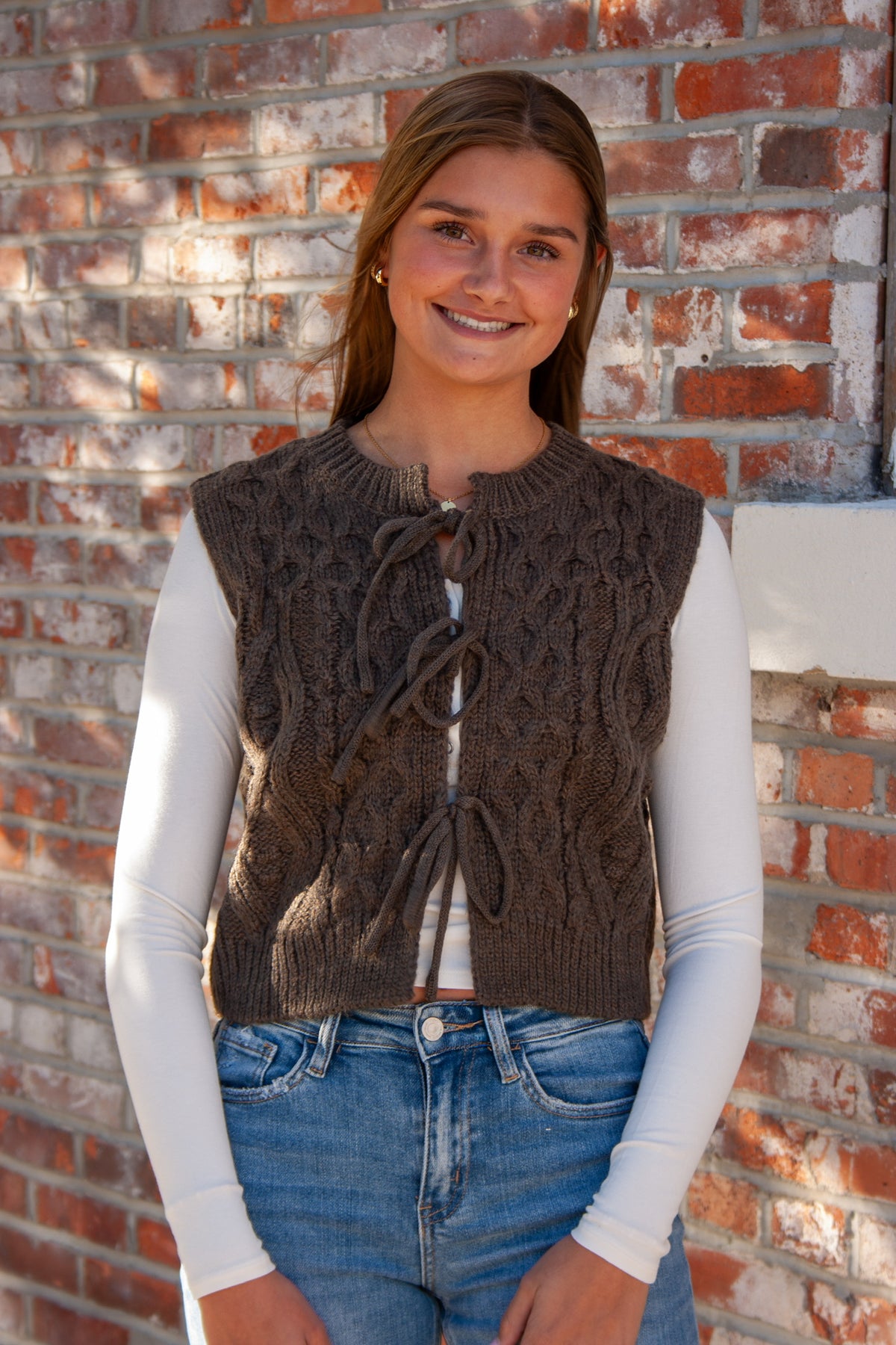 The Cable Colab brings classic knitwear into a fresh, modern silhouette. Crafted in a soft, cozy cable knit, this vest features a flattering tie-front closure that adds a playful, adjustable touch. Its relaxed fit and timeless texture make it perfect for layering over blouses, tees, or dresses, creating effortless, chic ensembles from season to season.