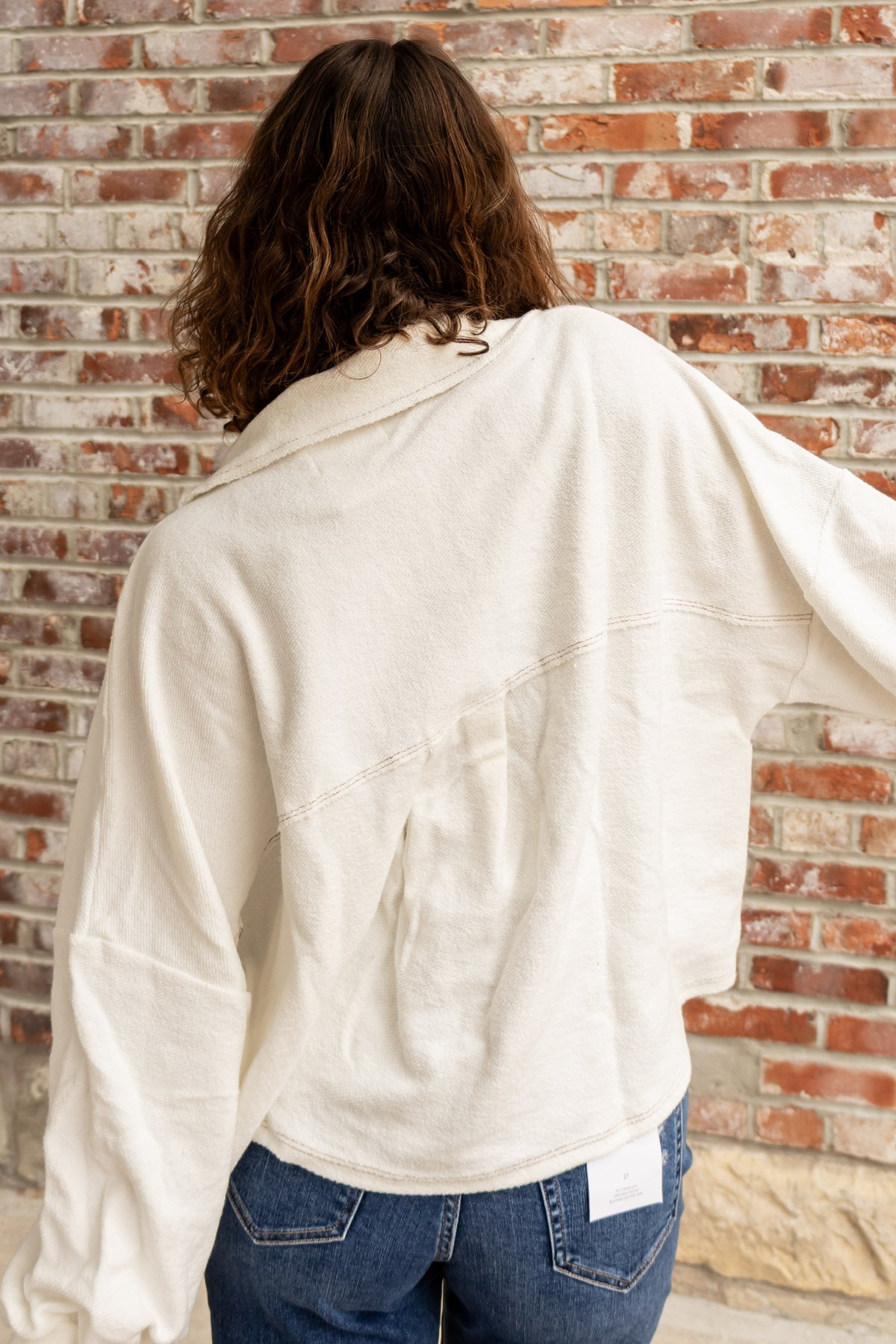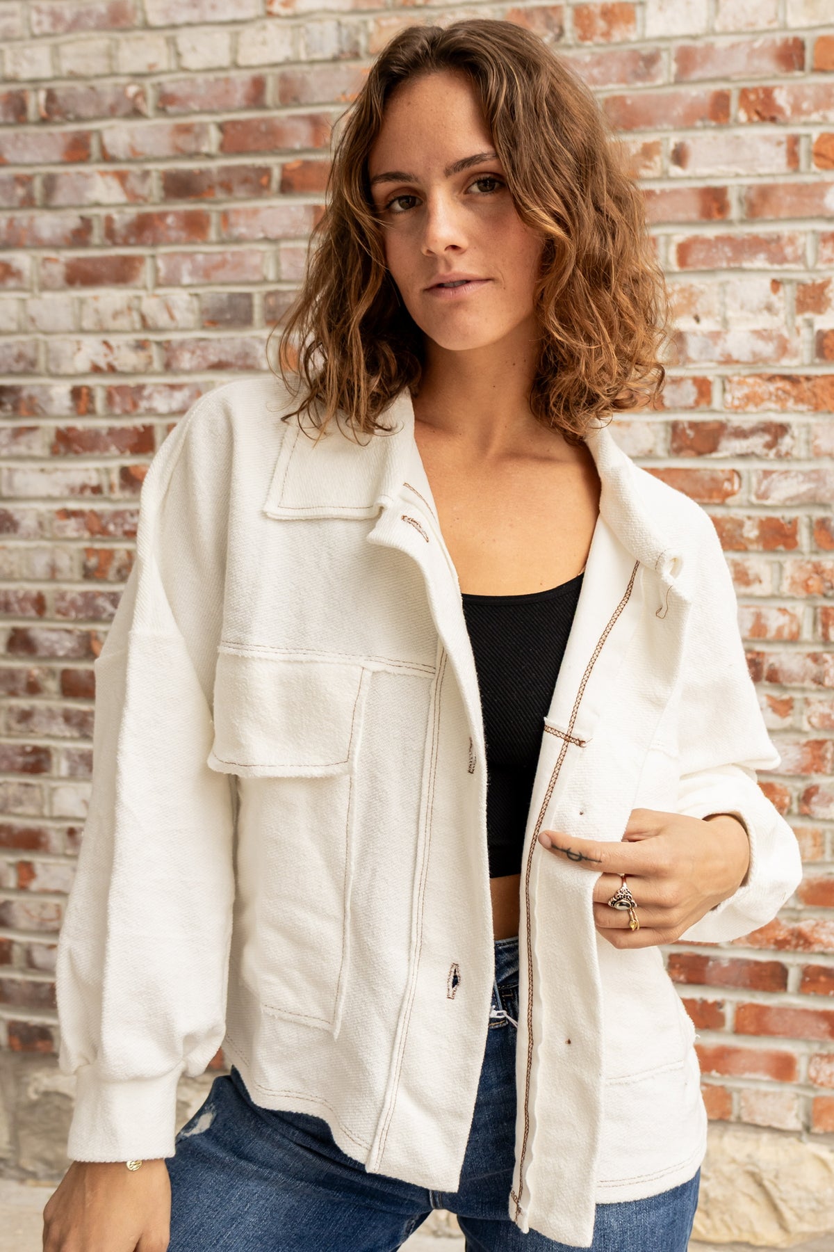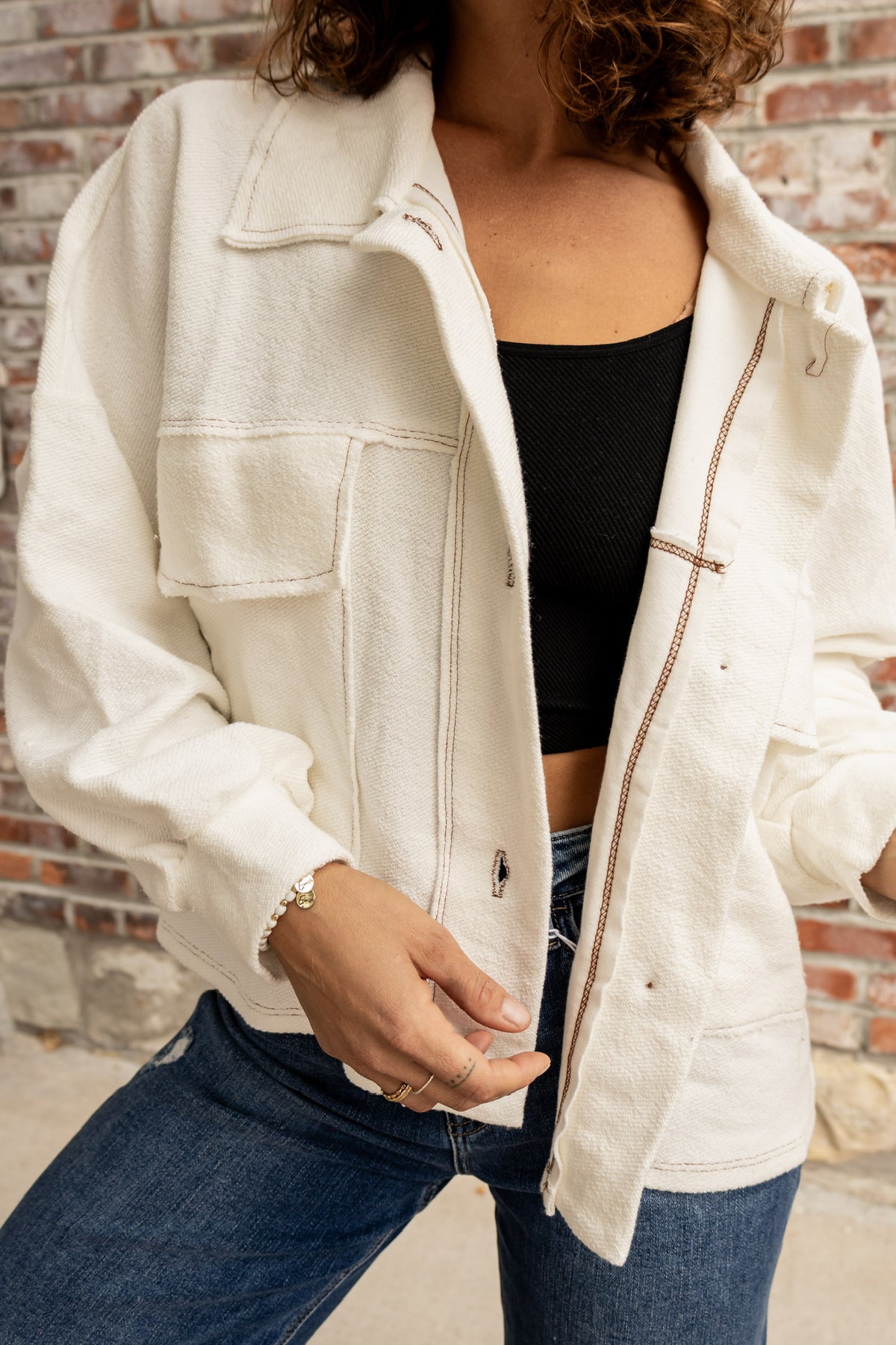 Effortlessly cool and endlessly versatile, the Casual Comfort jacket top is your new go-to for layering in style. Crafted in a soft solid cream fabric, this long sleeve button-down features a classic collared neckline and a flattering cropped cut that hits just right. Thoughtfully detailed with bold brown contrast stitching, it adds a subtle edge to an otherwise minimalist design. Whether you're dressing it up with high-waisted trousers or keeping it casual with denim, this piece blends structure and ease for an everyday staple with elevated flair.