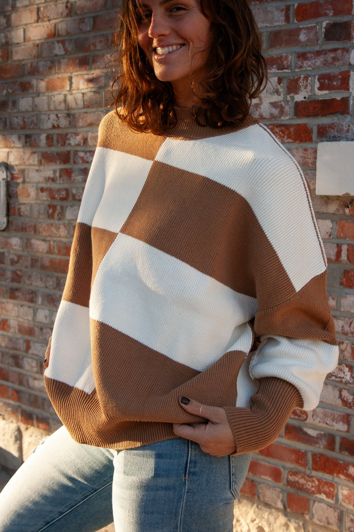 Introducing Check Yourself, the must-have sweater of the season! Featuring a trendy color block design and classic checkered pattern, this thick knit sweater is perfect for staying cozy and stylish. The dolman sleeves and mock neck add a touch of sophistication, while the tan and white color combo is versatile and on-trend. Get ready to rock your slightly oversized look and turn heads wherever you go!