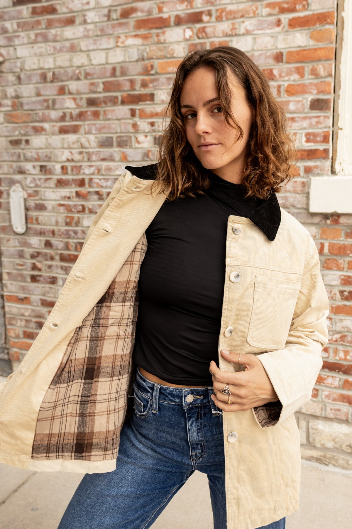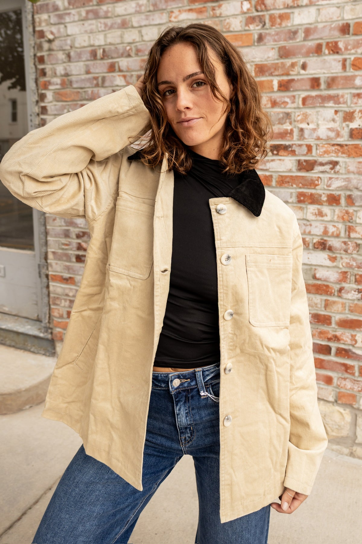 Effortless utility meets refined detail in the Chore Coat. Crafted from soft beige corduroy, this button-down coat is a modern take on a timeless workwear staple. The textured fabric offers warmth and depth, while the contrasting black collar adds a sharp, elevated edge. Functional yet understated, it's designed with a relaxed fit and classic button front—perfect for layering through shifting seasons. Durable, comfortable, and undeniably cool, the Chore Coat is your new everyday essential.