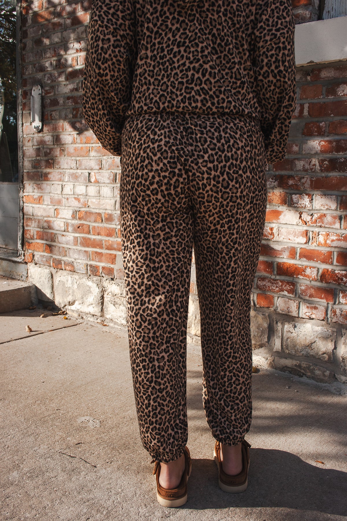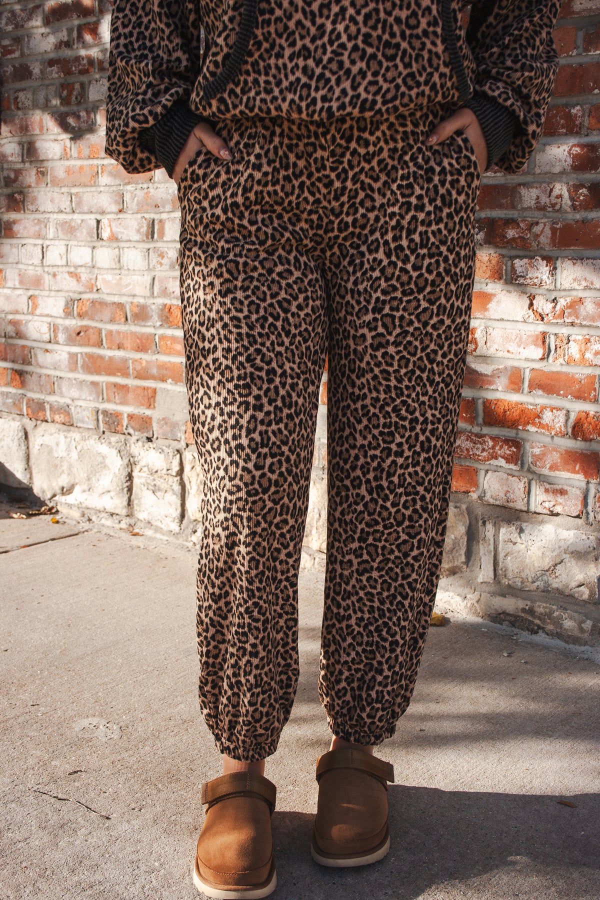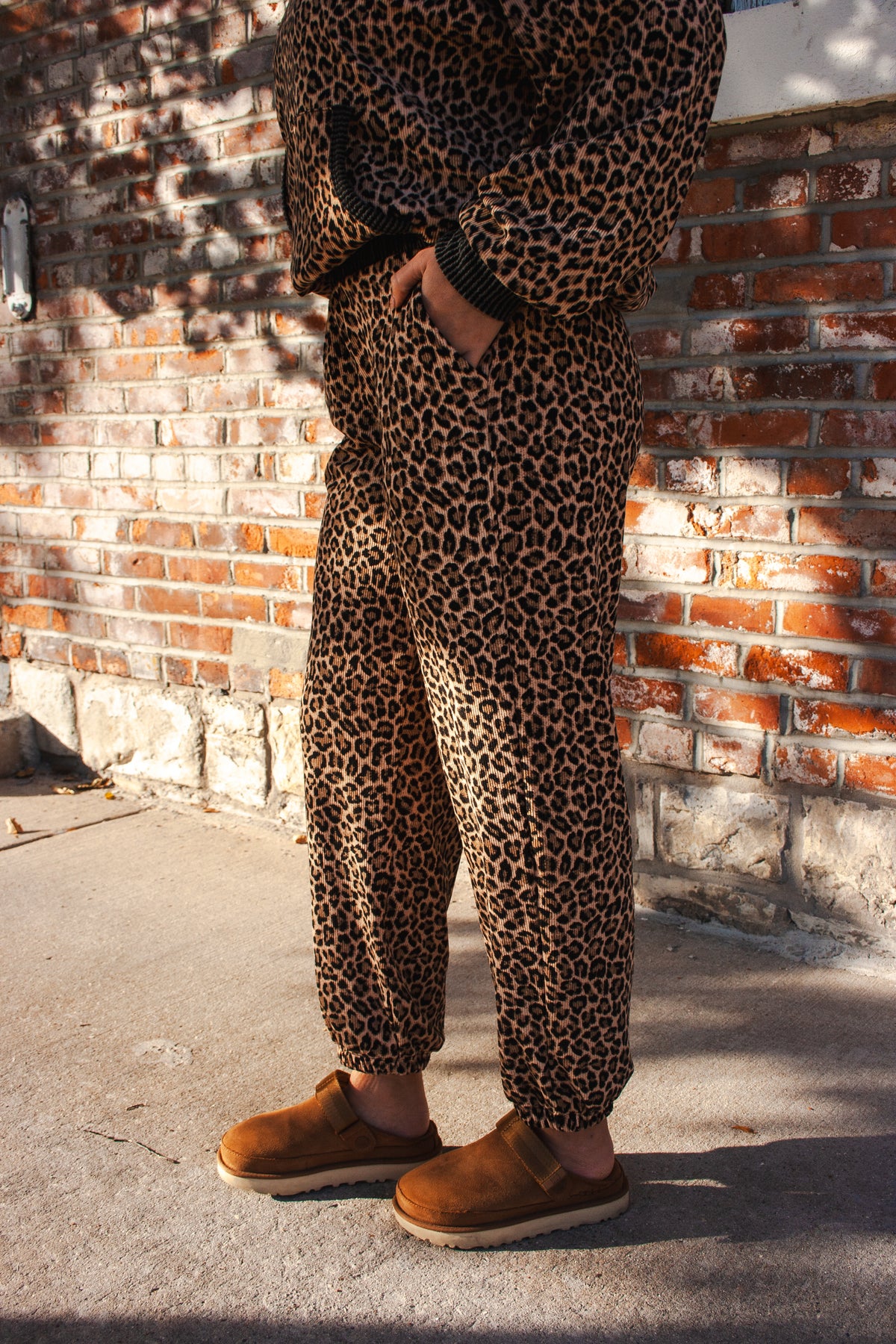 Step into comfort with a splash of fierce fun in these Cozy Leopard Bottoms. The ribbed leopard print fabric adds texture and personality, while the grey waist trim gives a cool contrast and a comfy fit. Perfect for lounging or casual outings, these jogger-style pants blend playful style with easygoing comfort.