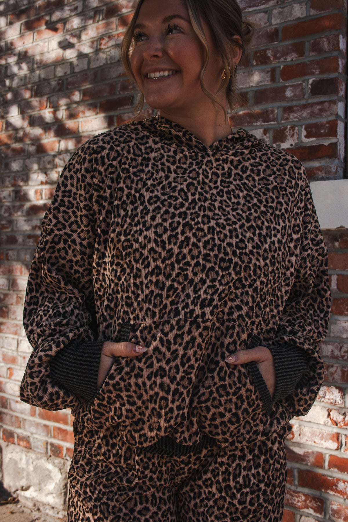 Embrace your wild side with the Cozy Leopard Top! This playful hoodie features bold leopard print softened by dark grey ribbed trim around the arms, waist, and front pocket for a snug, flattering fit. Made from soft, stretchy fabric, it keeps you comfy whether lounging or out on an adventure. Perfect for adding a fun, fierce touch to your casual wardrobe.