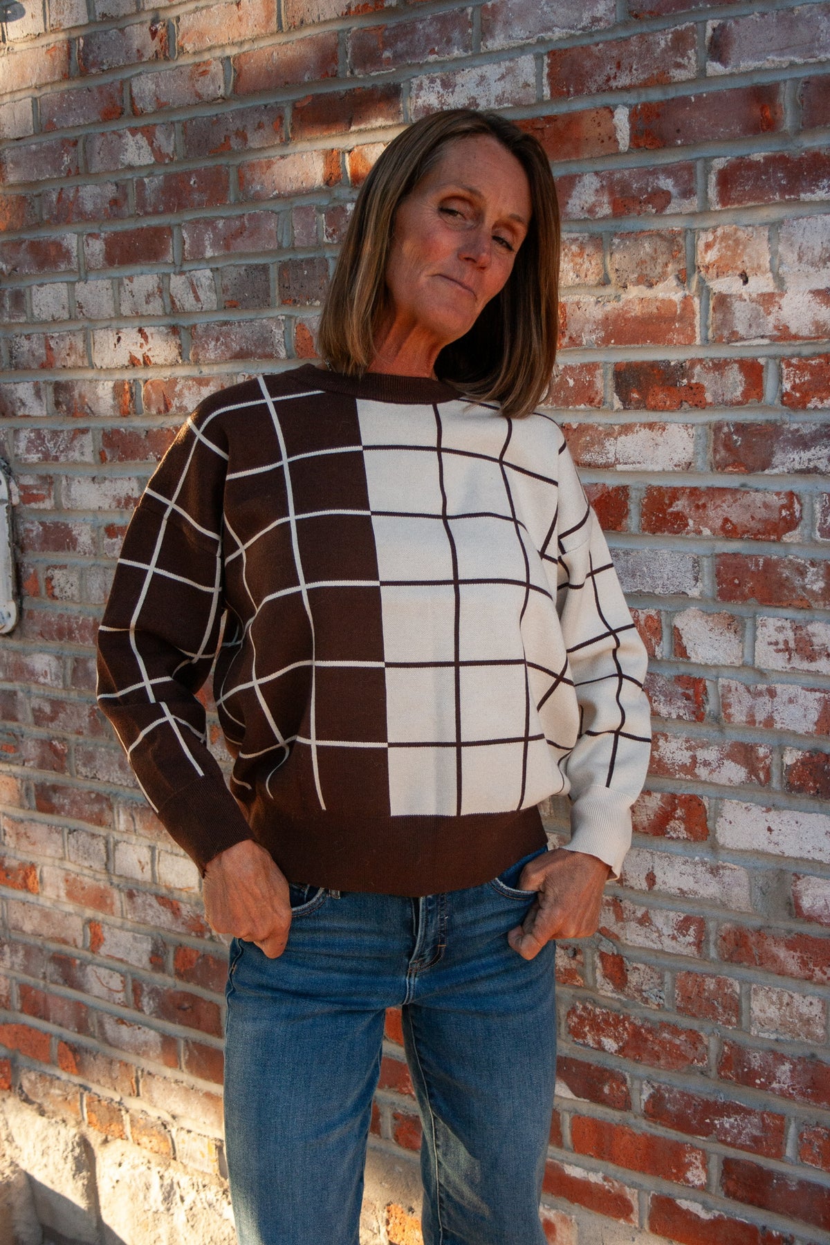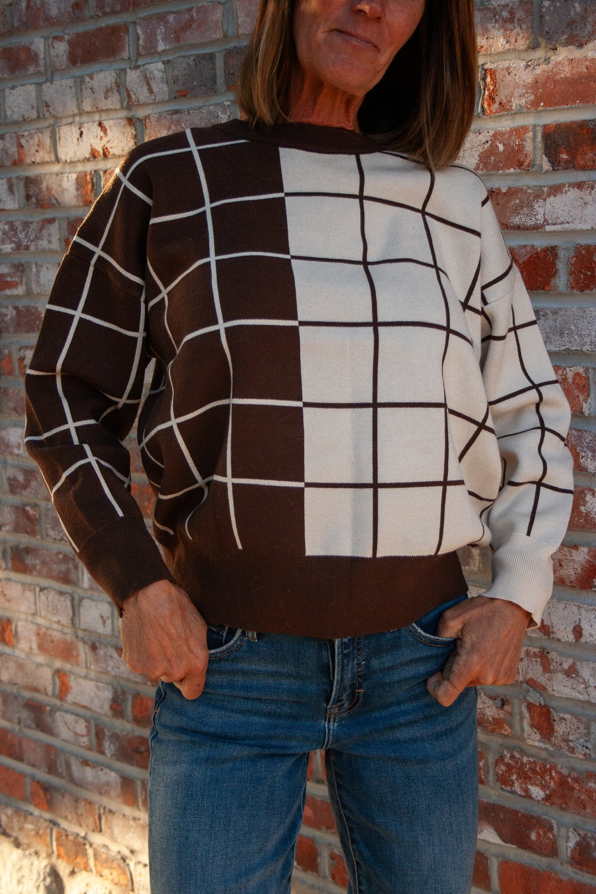 Experience luxurious comfort and style with our Dark Chocolate casual sweater. The checkered contrast of dark brown and tan adds a touch of sophistication to your everyday look. Stay warm and trendy with this must-have wardrobe essential.