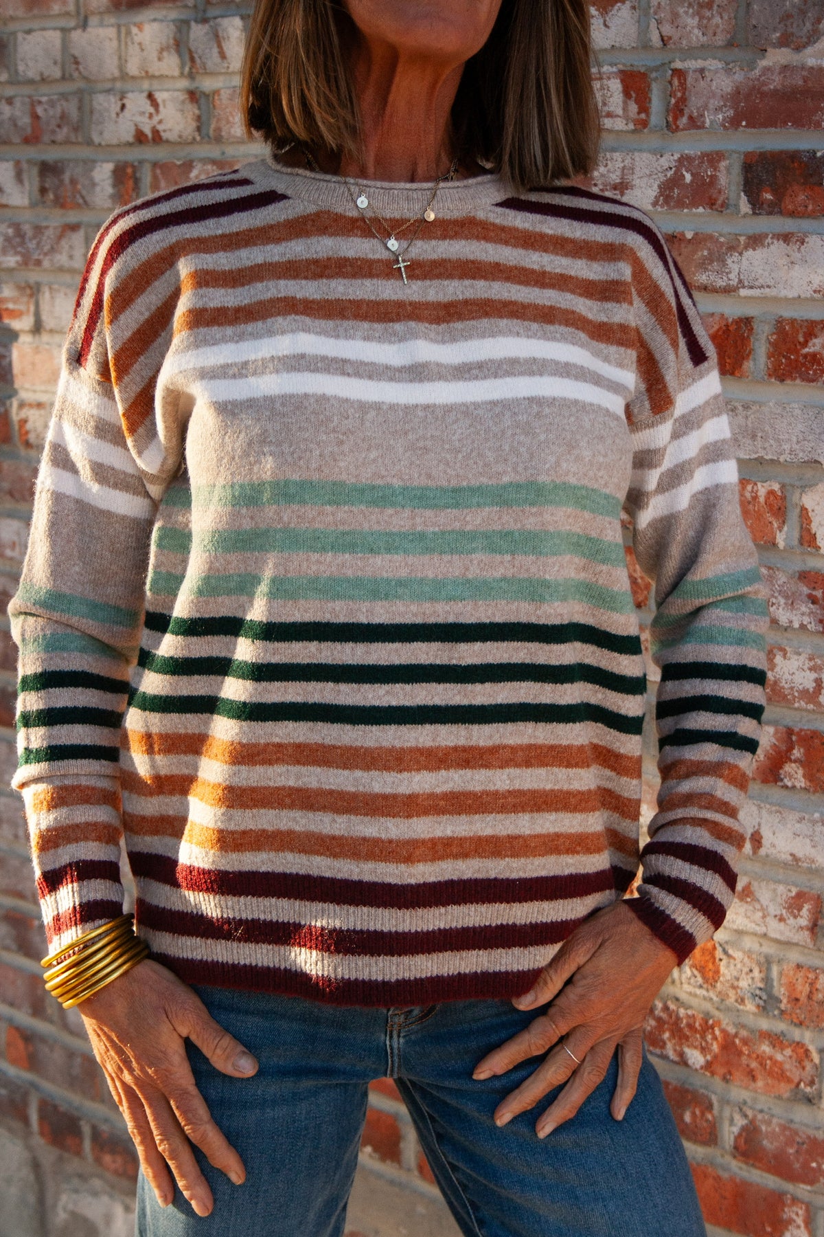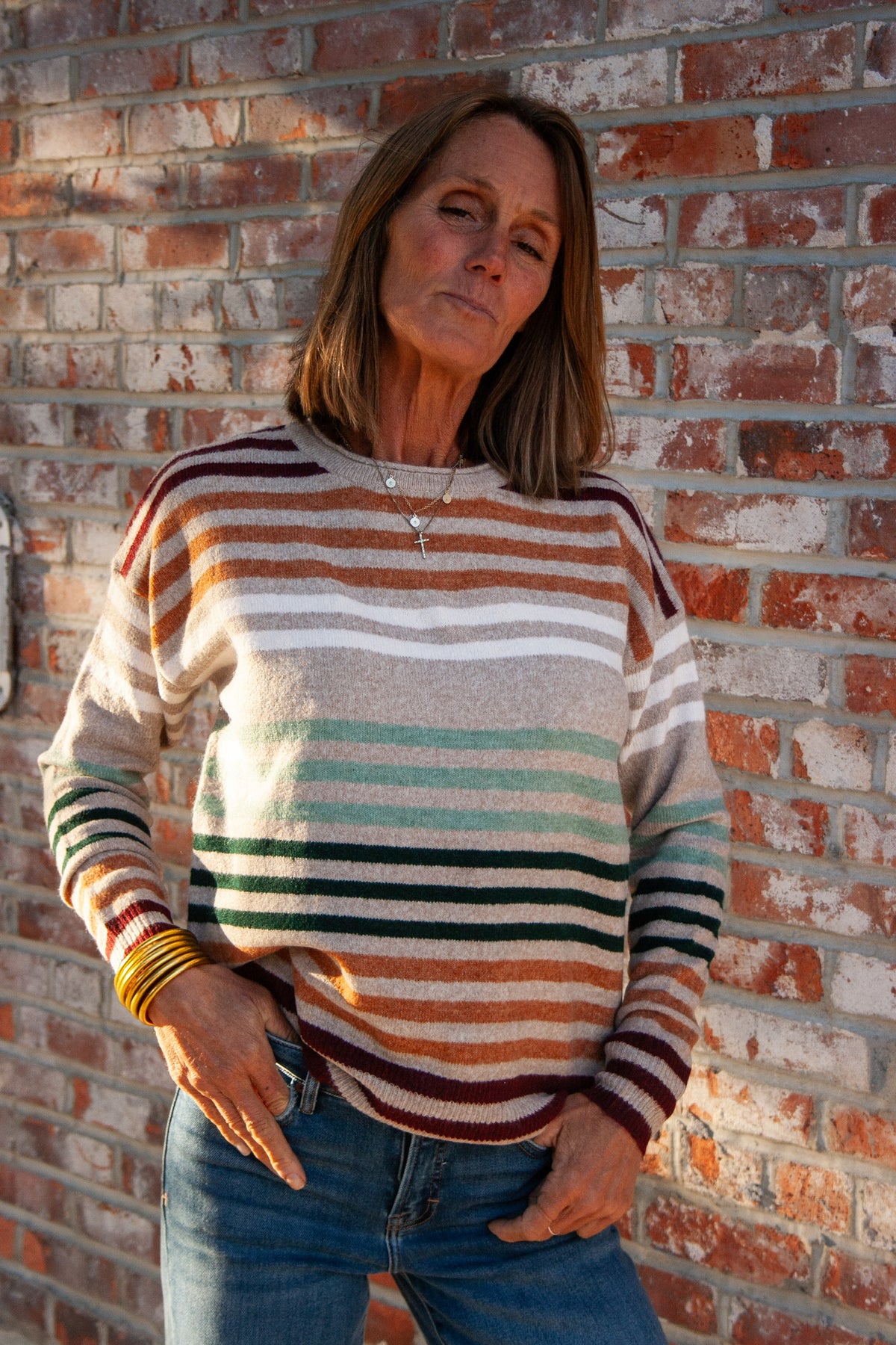 Vibrant, cozy, and full of seasonal charm, Fall Frenzy captures the spirit of autumn in every stripe. This crewneck pullover features a rich blend of multi-colored hues woven into a soft, textured knit that’s as comfortable as it is eye-catching. With its relaxed silhouette and effortless warmth, it’s the perfect statement piece for crisp days and cozy nights alike.