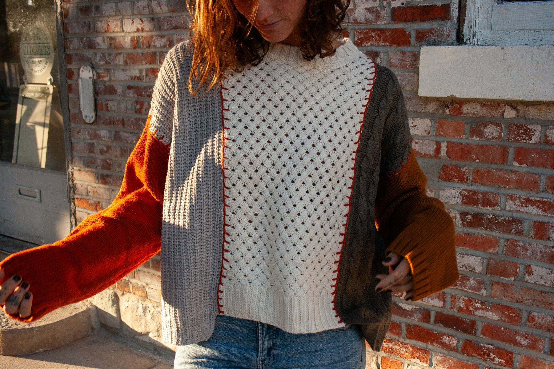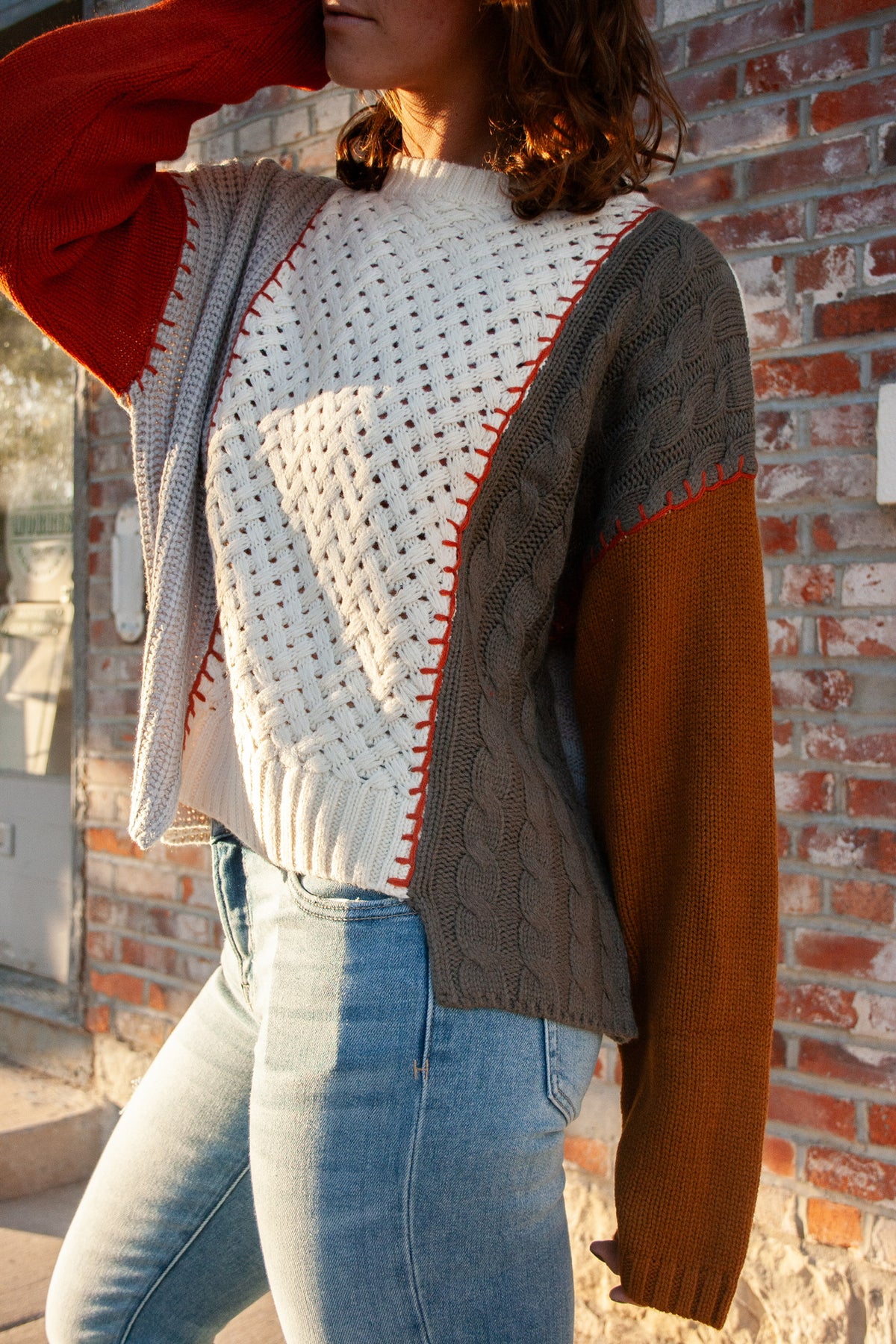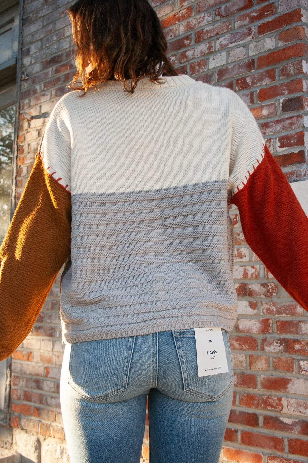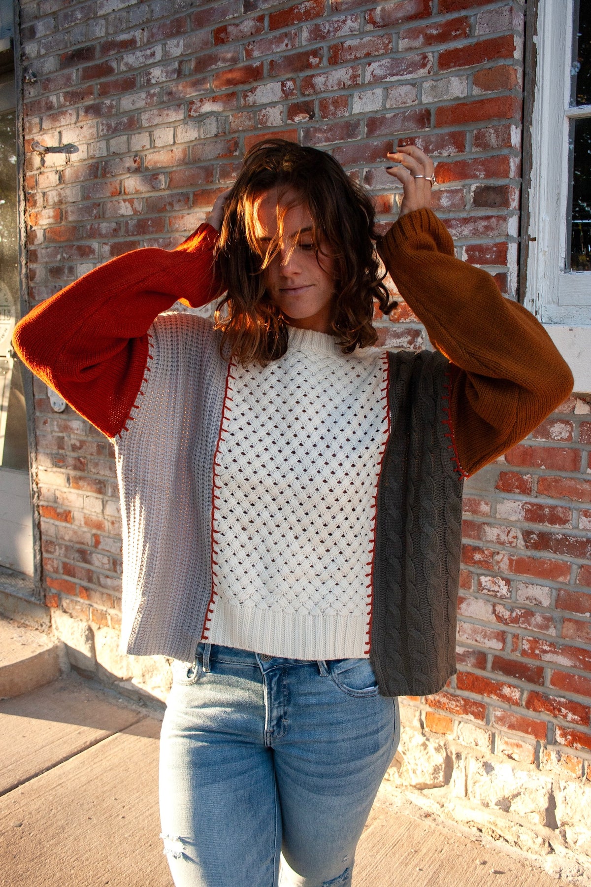 Get ready for fall with our Fallin For Color Block sweater! With its unique knit details and warm color palette of cream, rust, greys, and brown with rust stitching, this sweater will keep you stylish and cozy all season long. Don't miss out on this must-have piece!