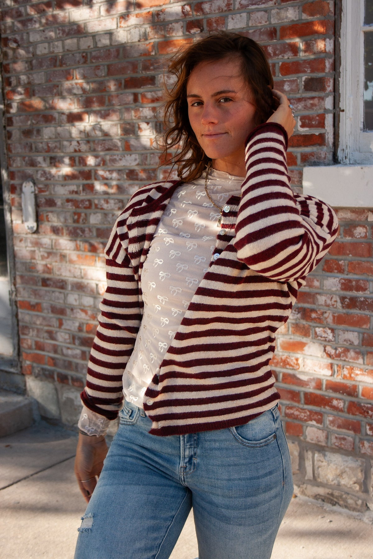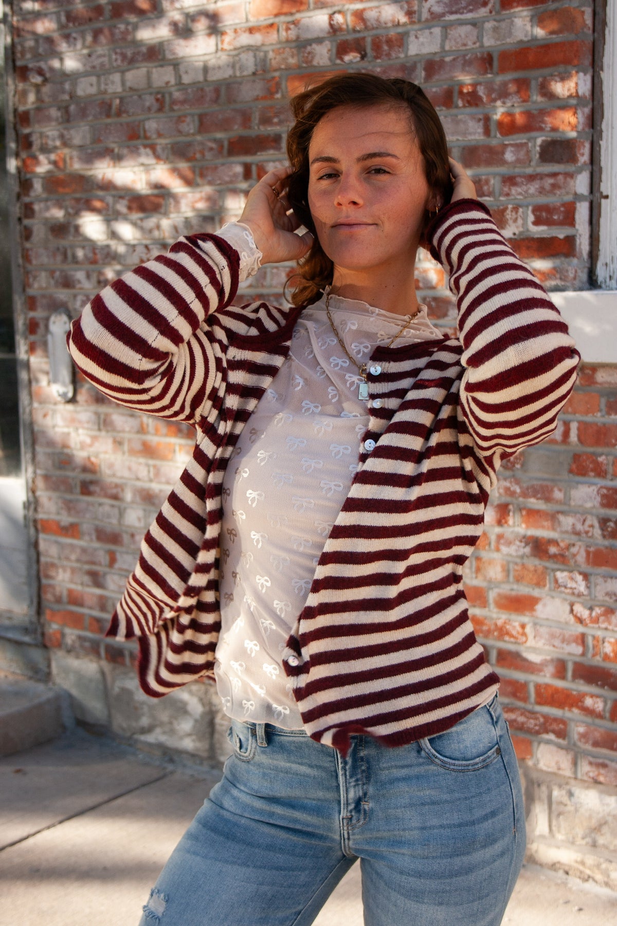 Classic stripes meet modern ease in The Cranberry Stripe Cardigan. Crafted in forest green and cream with an oversized fit and subtle button down, this crewneck sweater brings warmth, texture, and relaxed sophistication to any look.