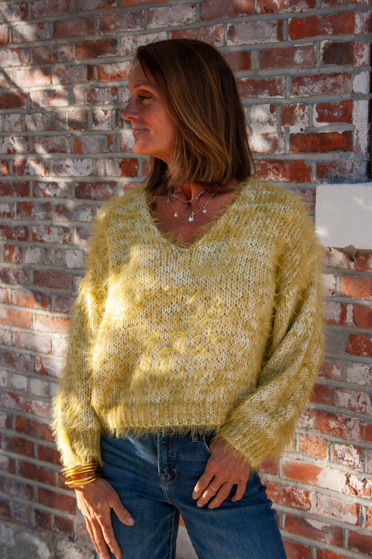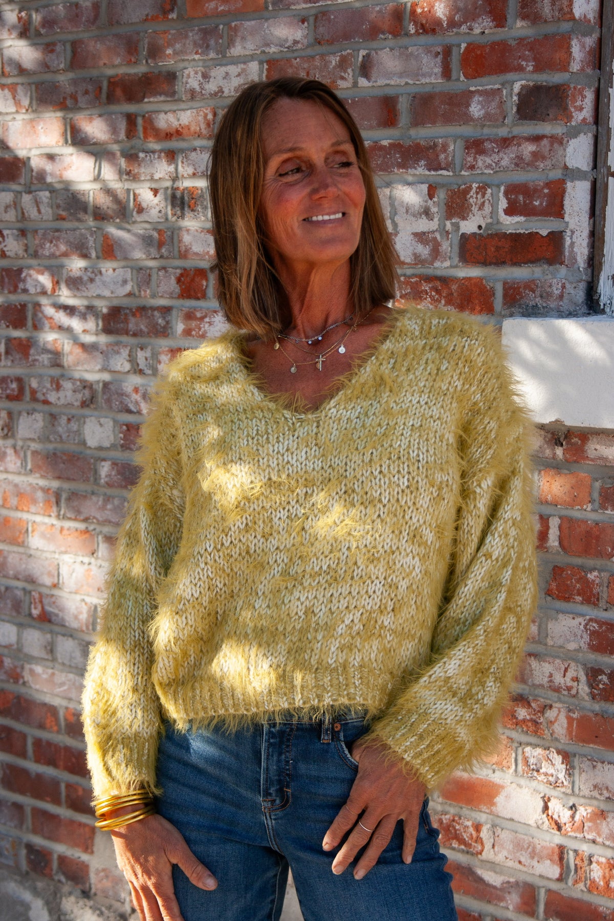 The Lush Lime sweater blends soft knitted fabric with vibrant lime green feather accents for a fun yet refreshing touch. Its comfortable fit makes it an ideal choice for cozy days, bringing a bright and unique style to your wardrobe.