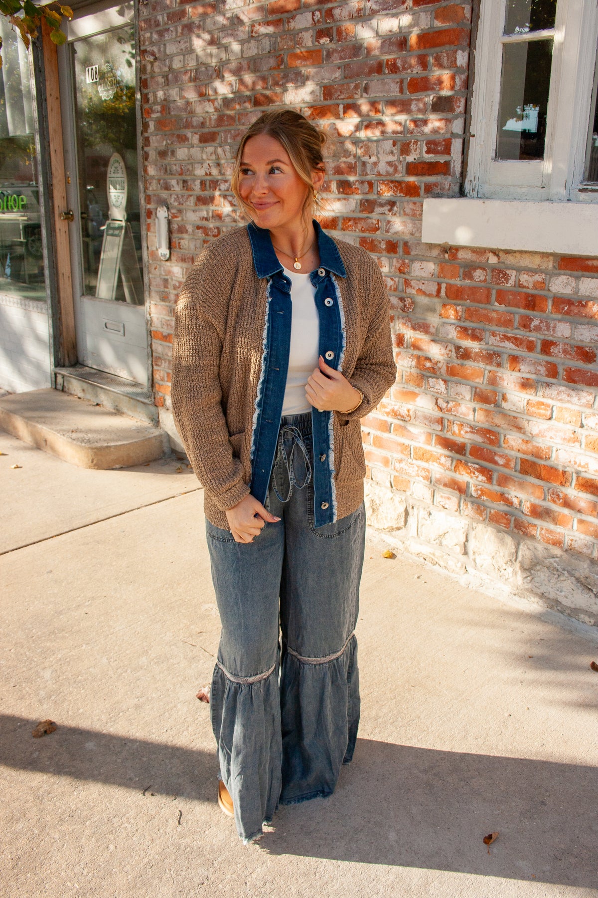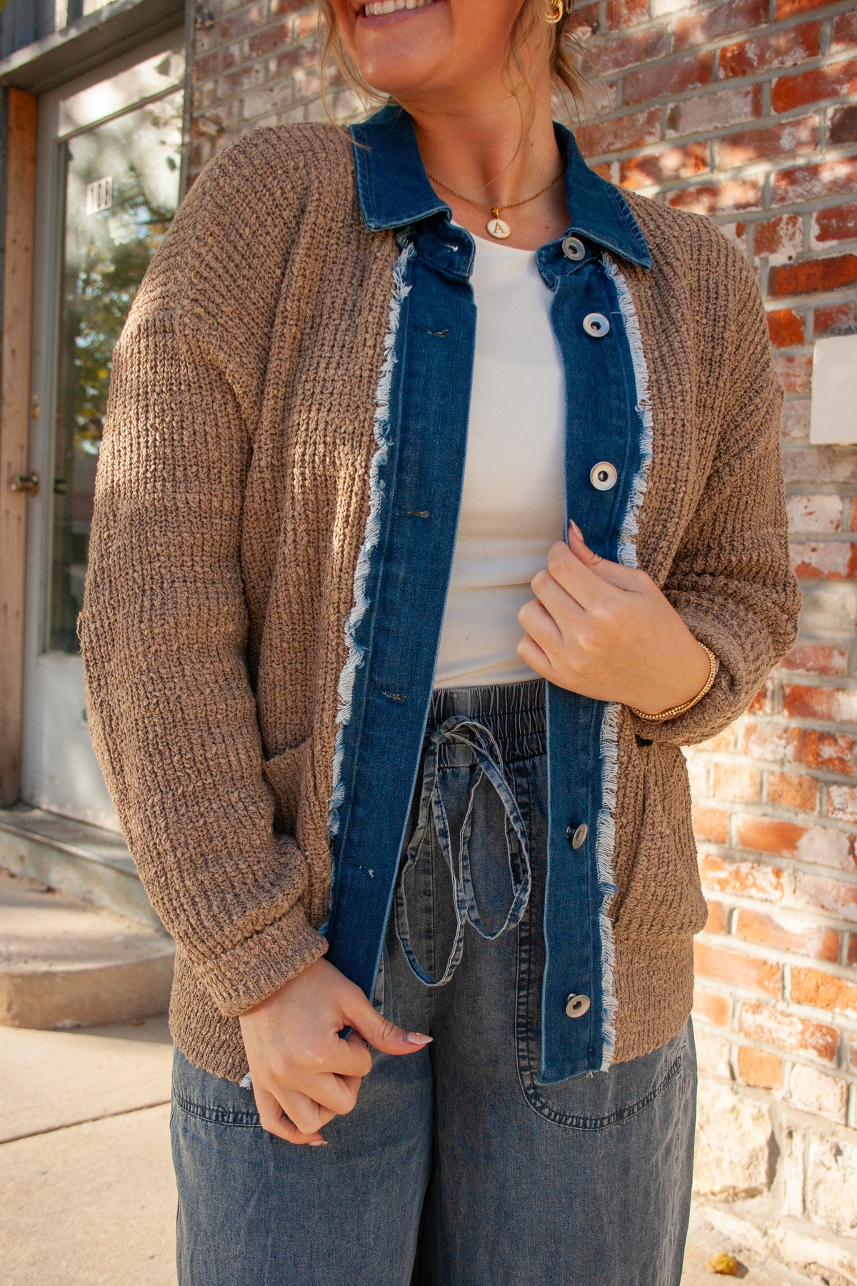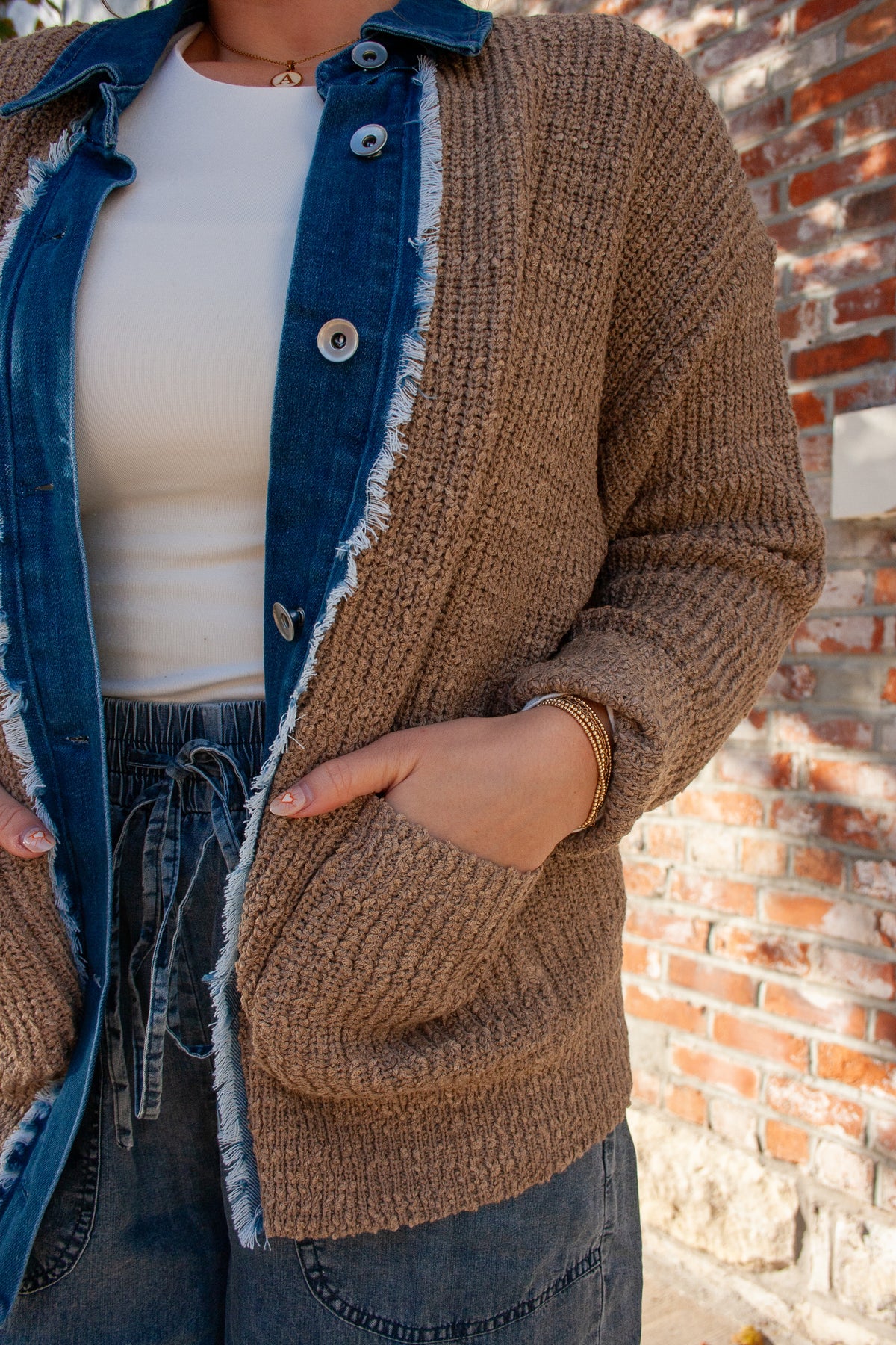 Effortlessly blending casual and chic, Mocha Denim Duo is a long sleeve button-down sweater that pairs a soft mocha knit with a denim front panel and collar. The contrast of cozy knit and structured denim adds unexpected style, while the relaxed fit ensures all-day comfort. Perfect for layering over jeans or skirts, this versatile piece brings a modern, fashion-forward edge to your everyday wardrobe.