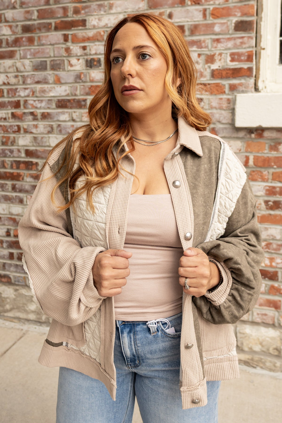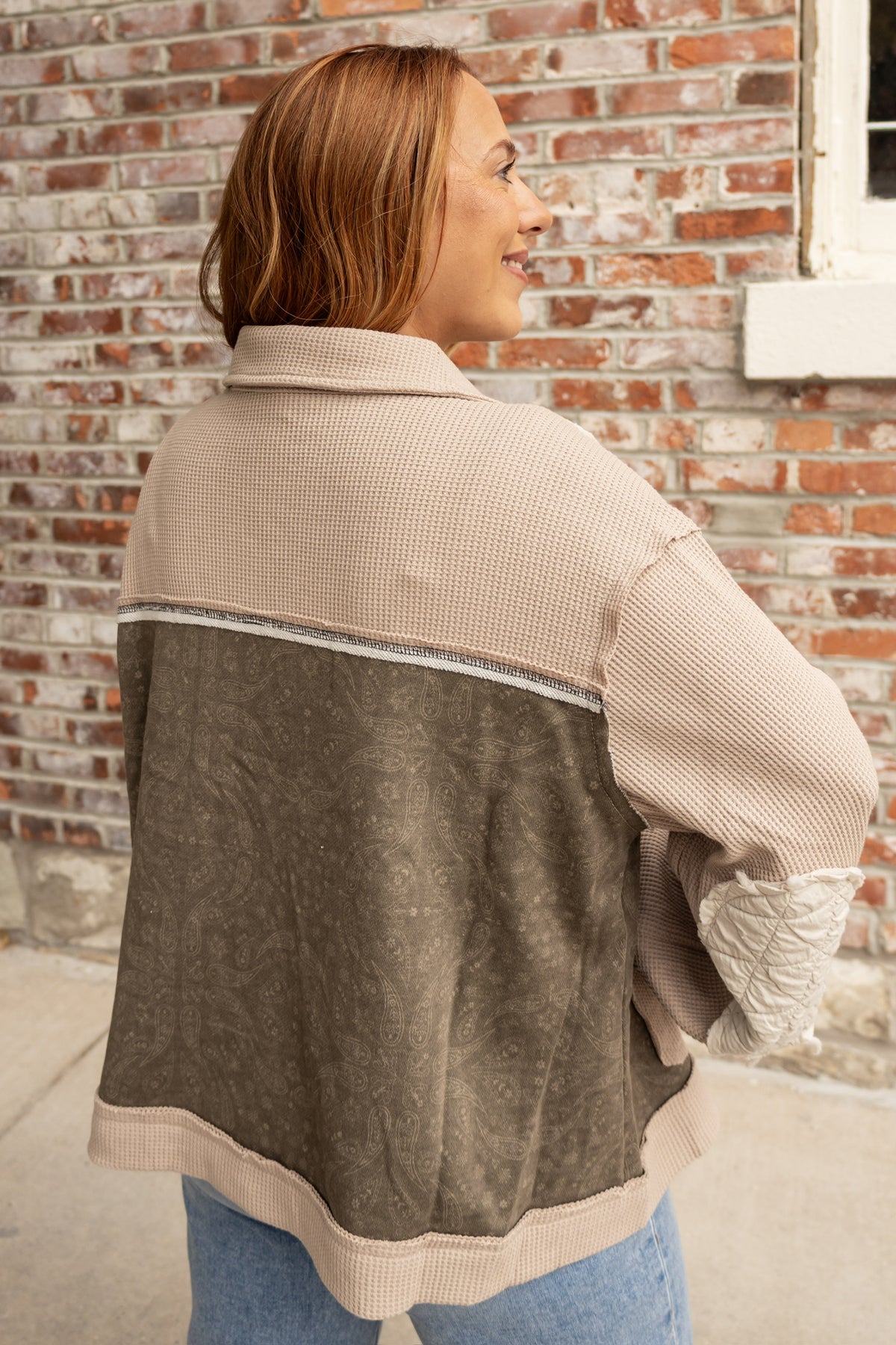 The Quilted Paisley shacket combines multiple textures for a distinctive look, featuring waffle knit, quilted fabric, and a paisley pattern on olive panels. Designed with a classic collar and detailed front pockets, this button-up offers both style and practicality. Perfect for layering, it adds a unique touch to any outfit while keeping you comfortable and on trend.