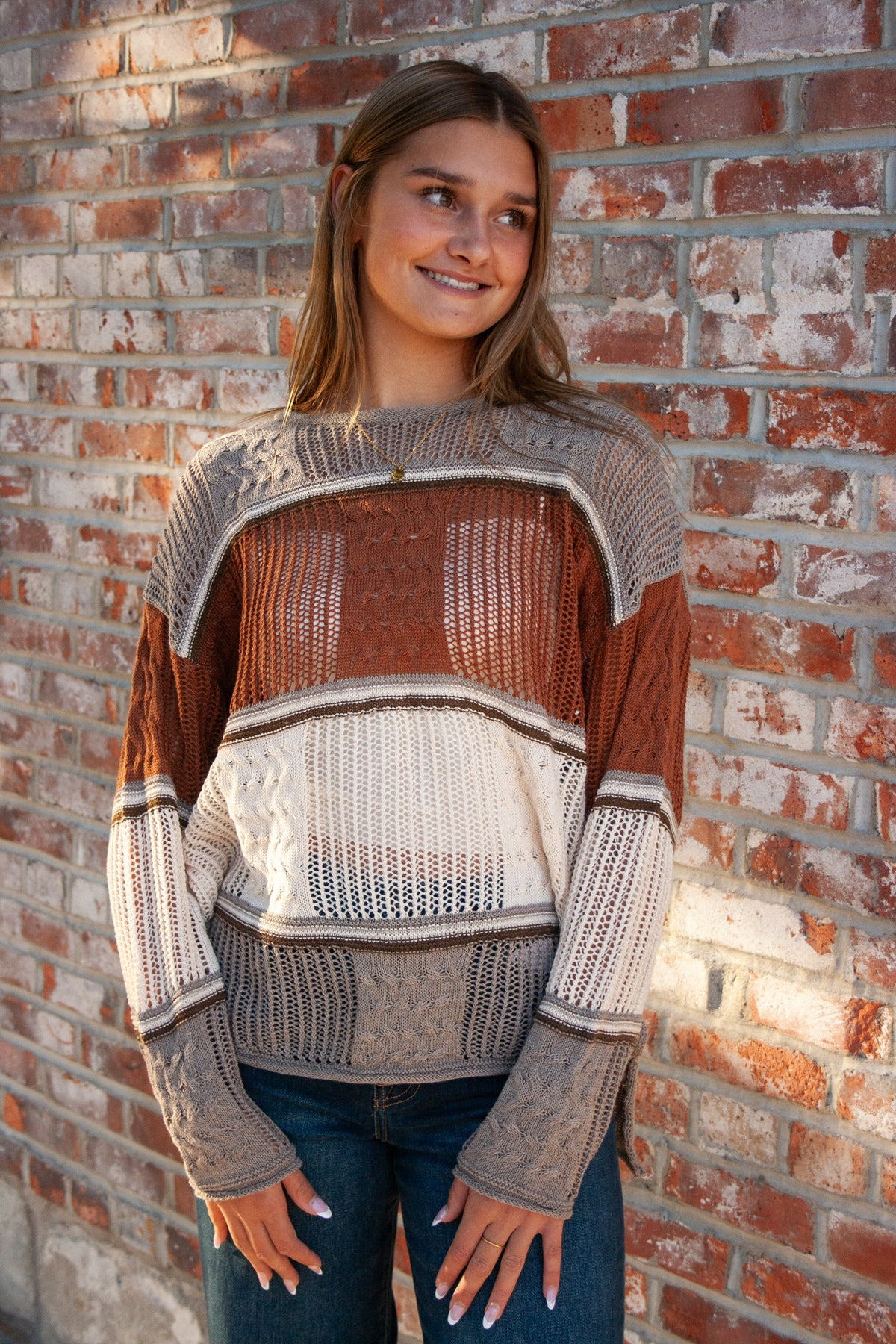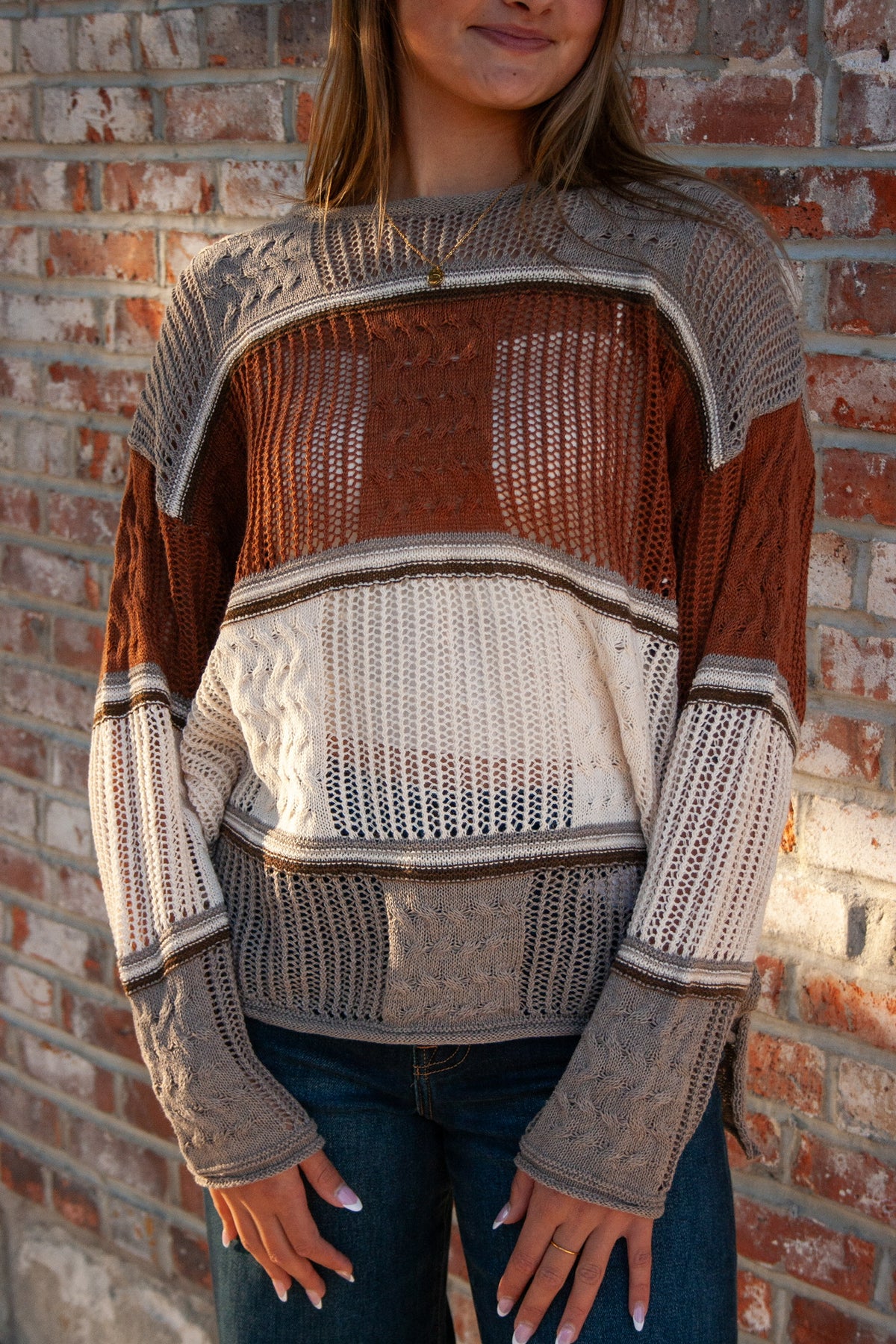Experience the cozy comfort of our Simple & Stitched sweater! Made with a thin, open-style knit that's perfect for fall, it comes in a variety of warm hues. The round neck and different knit details add extra charm, while the striped design and slit sides create an oversized look that's both trendy and comfortable.