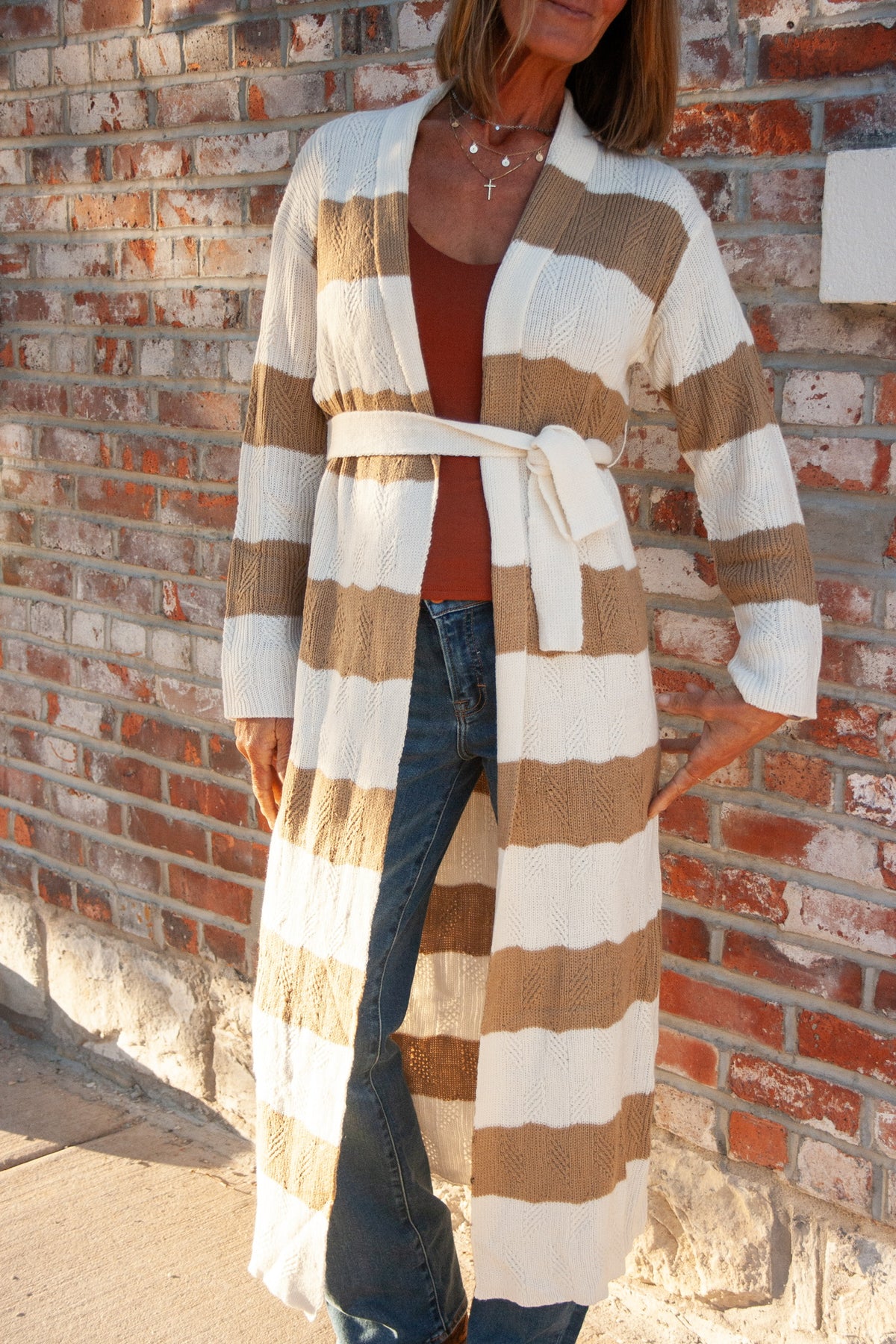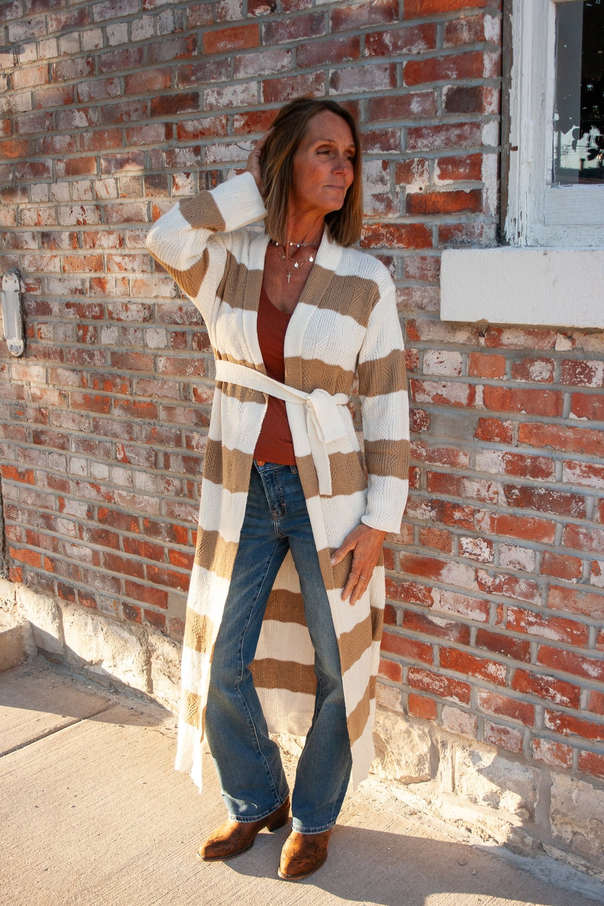 The Stripes & Ties long knit duster is a perfect blend of style and comfort. Featuring a thinner open knit design with elegant stripes, it provides lightweight warmth without bulk. The included belt allows you to customize your look, whether you prefer a cinched waist or a relaxed fit. This versatile piece effortlessly enhances any