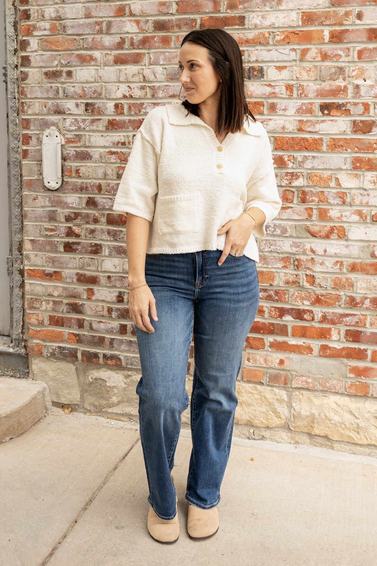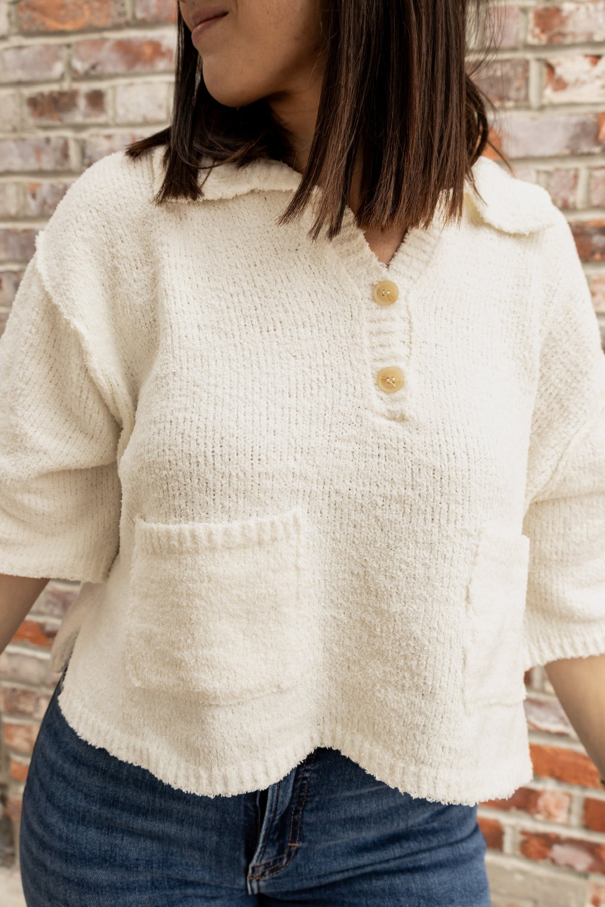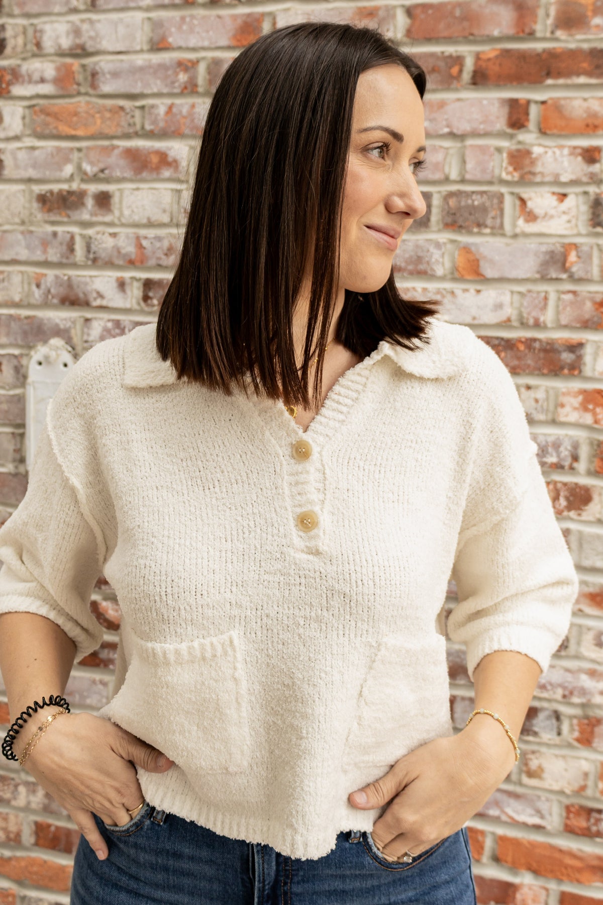 Stay cozy and charming in the Winter White sweater top! Its playful notched V-neck and cozy collar add a touch of fun, while the front pockets bring practical warmth to chilly days. Perfectly knit for comfort, this sweater combines style and snug vibes effortlessly.