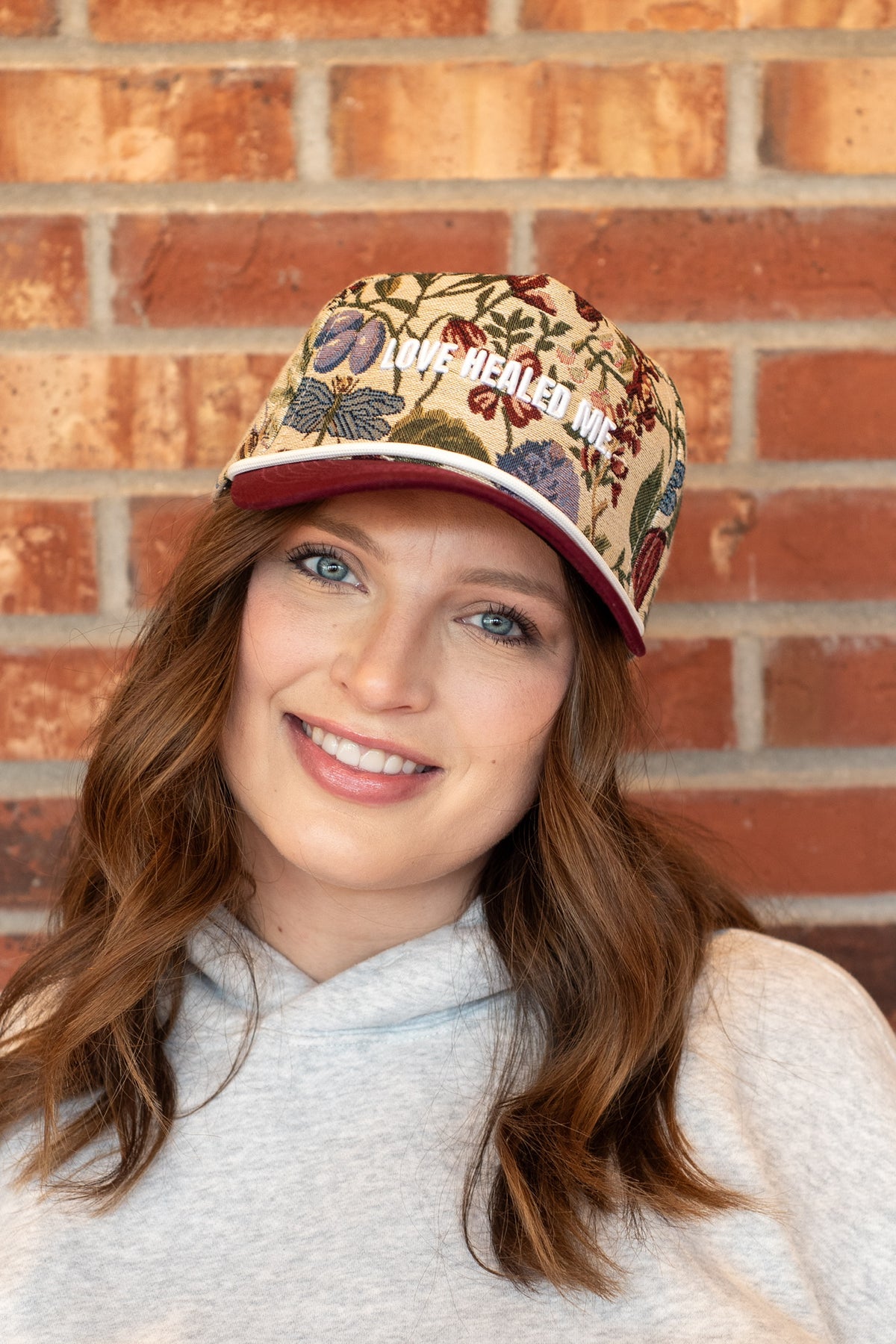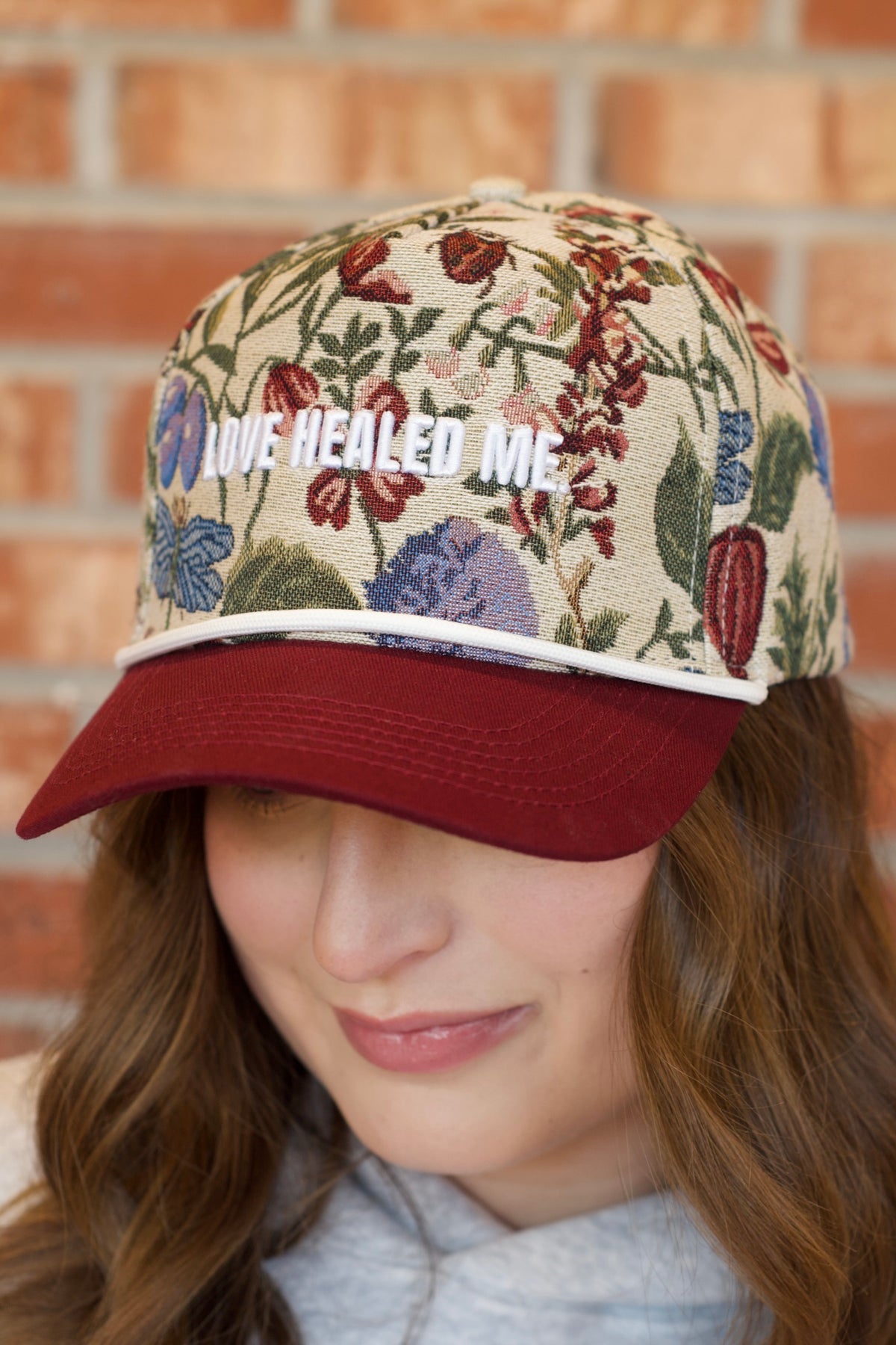 Corded trucker hat that says "love healed me"