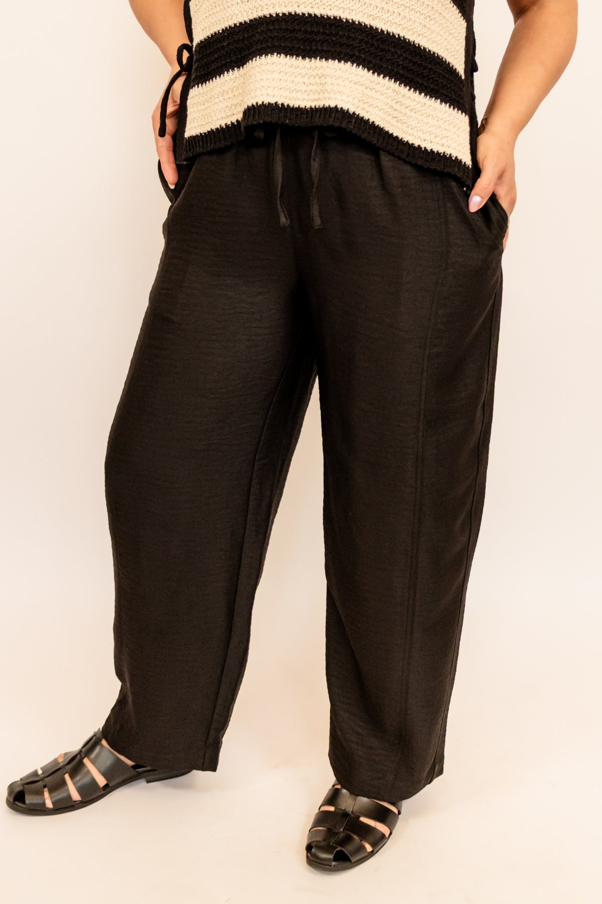 Where comfort meets elevated style, these black lounge pants feature a relaxed silhouette and an adjustable front tie waist for a perfect fit. Soft, drapey fabric gives you that all-day comfort feel, while the sleek black finish makes them easy to dress up or down. Pair them with a fitted tank and sneakers for an effortless daytime look, or style with a blouse and heels for a chic, put-together vibe. From lounging at home to stepping out, these pants do both!
