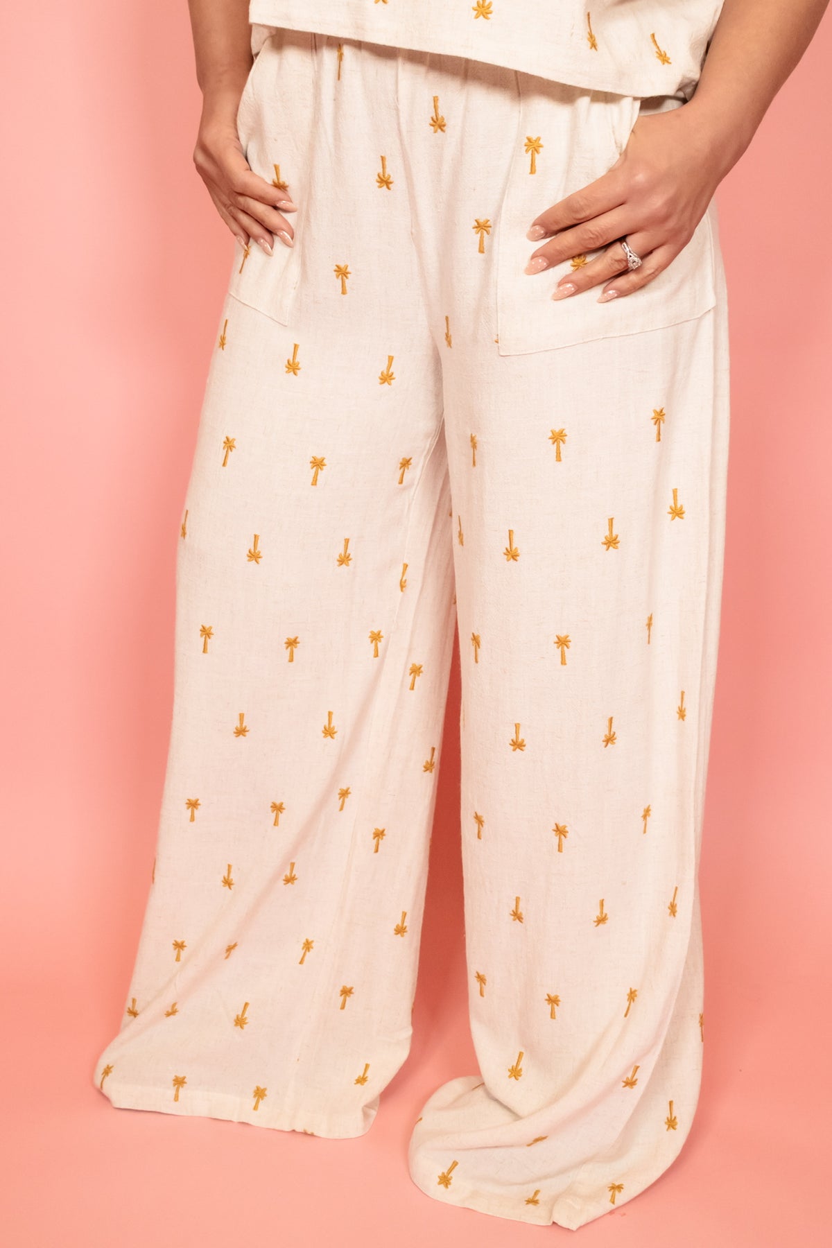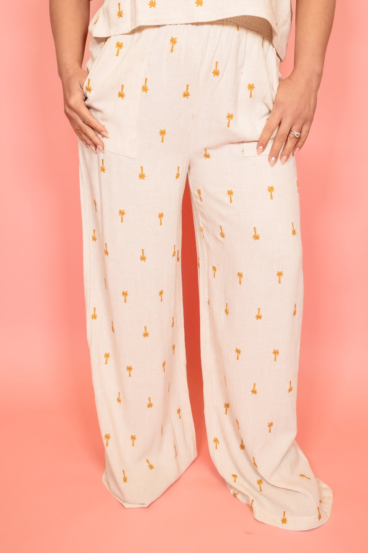 Designed for comfort with effortless style, the Palm Paradise Wide Leg Pant features a soft lightweight fabric, elastic waistband, relaxed wide leg silhouette, and functional side pockets. The allover mini palm print adds a fun tropical feel perfect for spring and summer days. Looks amazing on its own or paired with the matching Palm Paradise Smocked Hem Top for a complete set moment. Sold separately for versatile wear.