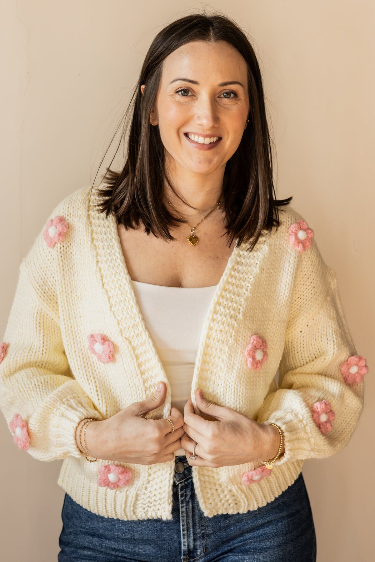 Wrap yourself in cozy comfort with this charming chunky knit cardigan. Crafted in soft cream with delicate pink flowers crocheted throughout, it brings a gentle, botanical touch to your everyday wardrobe. The substantial knit provides warmth and texture, while the floral details add a whimsical, handmade quality. Perfect for layering on cool days or wearing as a statement piece, this cardigan effortlessly blends comfort with understated elegance.