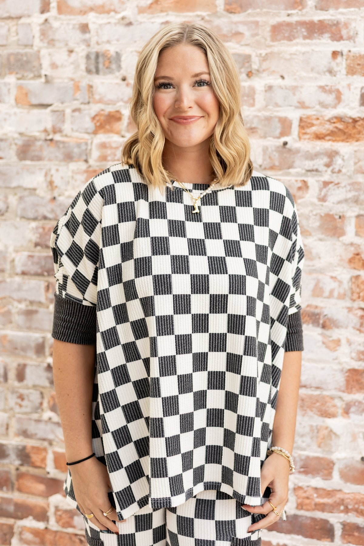 The Fast Lane Top combines comfort and style with its oversized black and white checkered design. Made from ribbed fabric, it features split sides and slightly longer short sleeves accented with a trendy black edge. This top offers a relaxed fit that’s perfect for making a fashionable statement while staying comfortable all day.