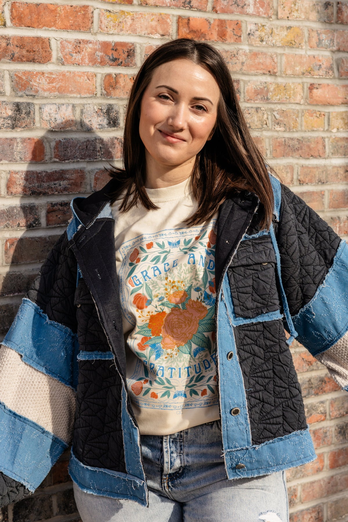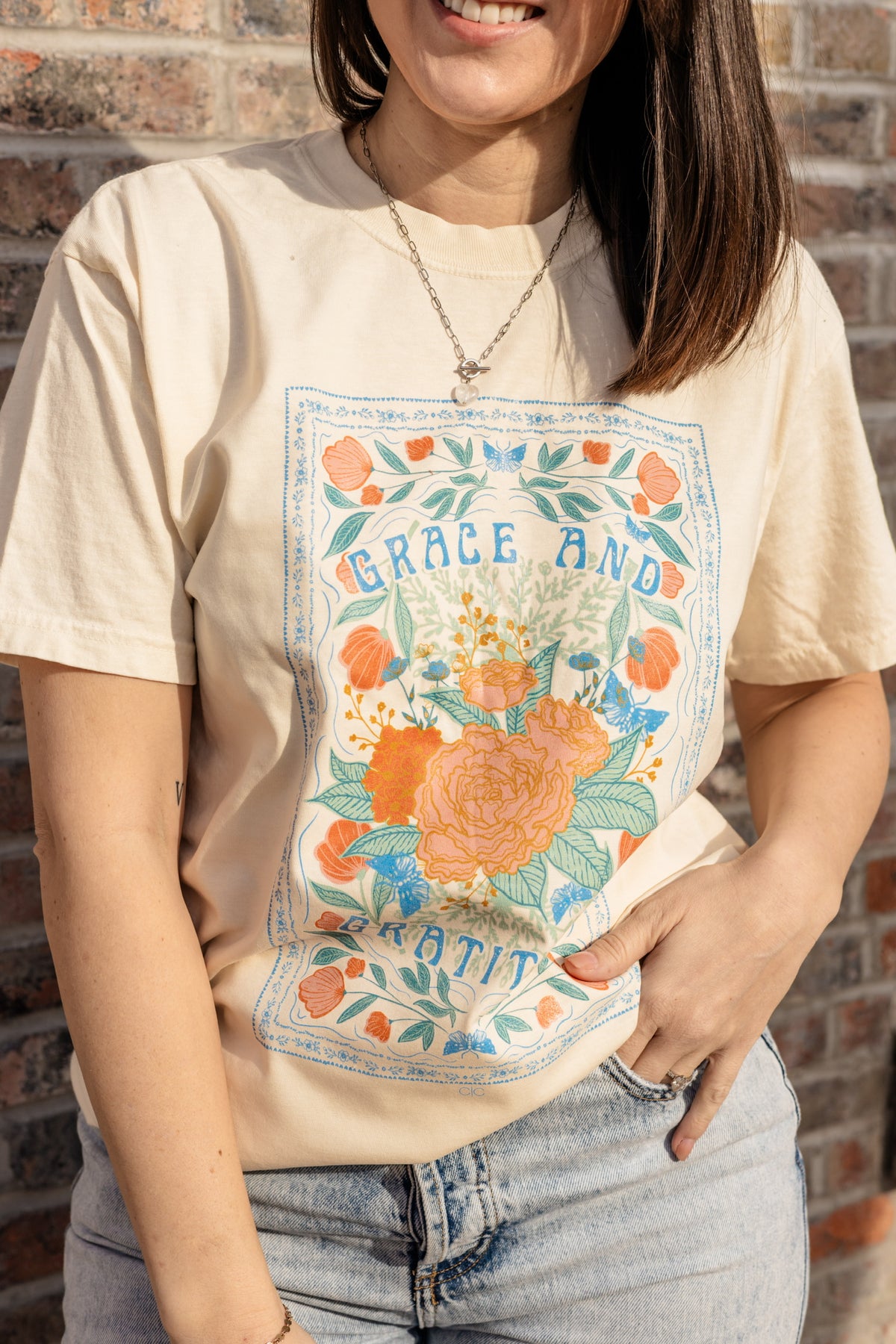 Carry a message of thankfulness wherever you go with our Grace And Gratitude Graphic Tee. This short sleeve crewneck features a beautifully designed stamp-inspired graphic, symbolizing the timeless charm of sending love, grace, and gratitude from the heart.
