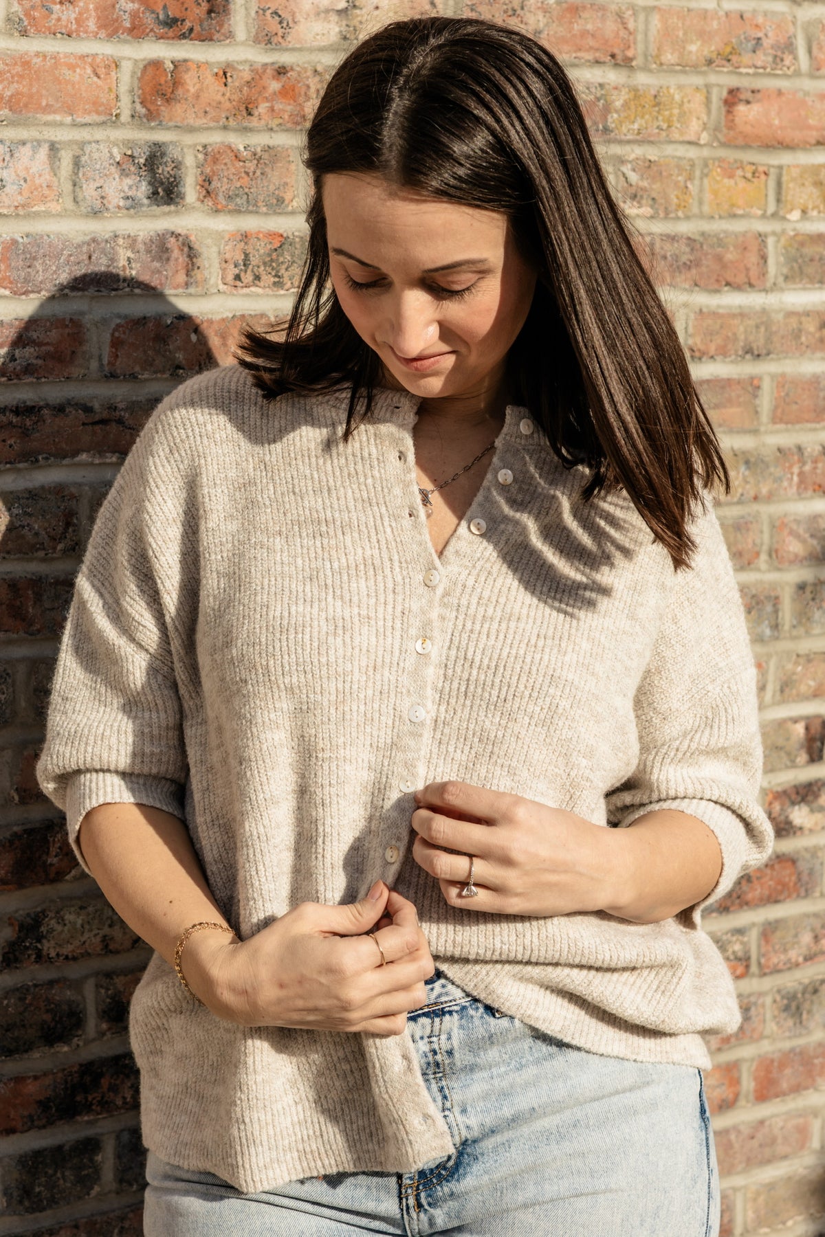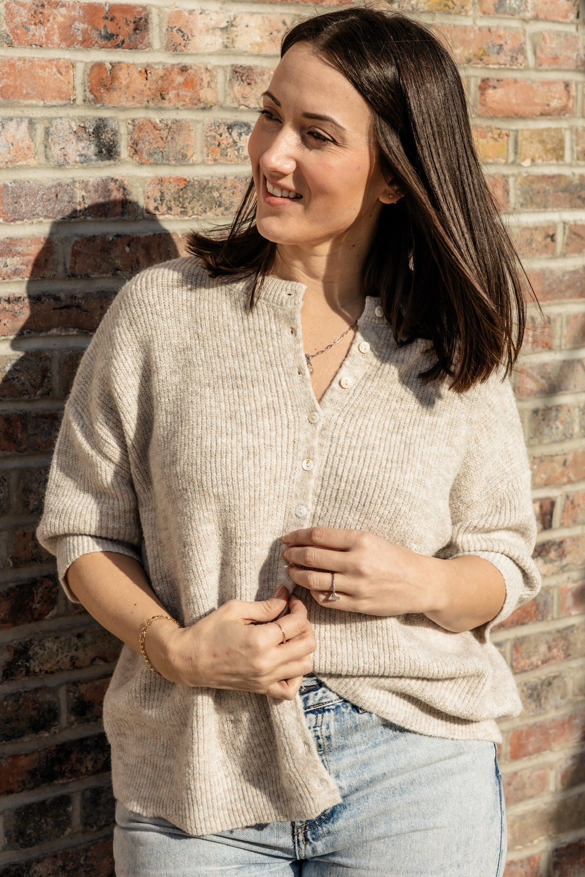 The Oat & Honey Cardigan features a soft oatmeal hue in a timeless ribbed knit with a flattering button-down front. Designed for easy layering and everyday wear, its cozy texture and neutral tone make it a versatile staple you’ll reach for again and again. Style it buttoned up for a clean, classic look or worn open for relaxed, effortless charm.