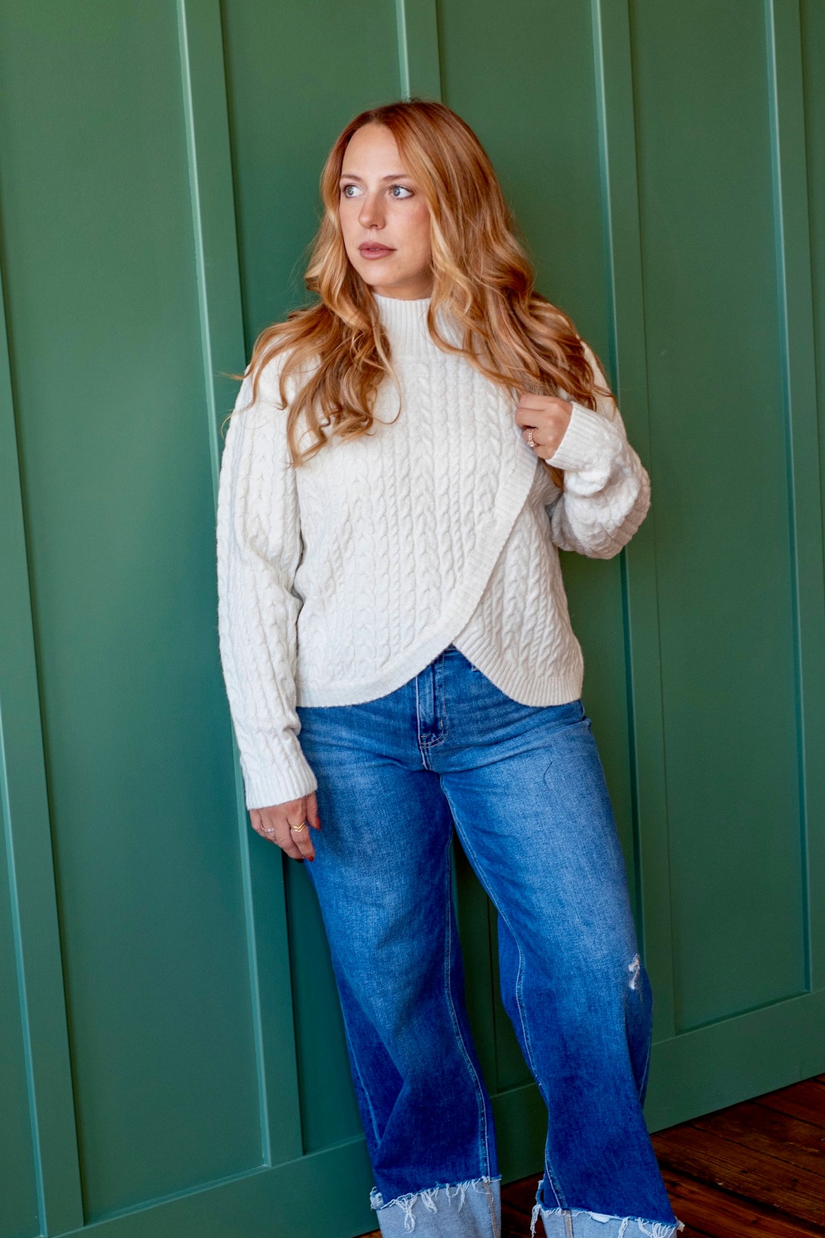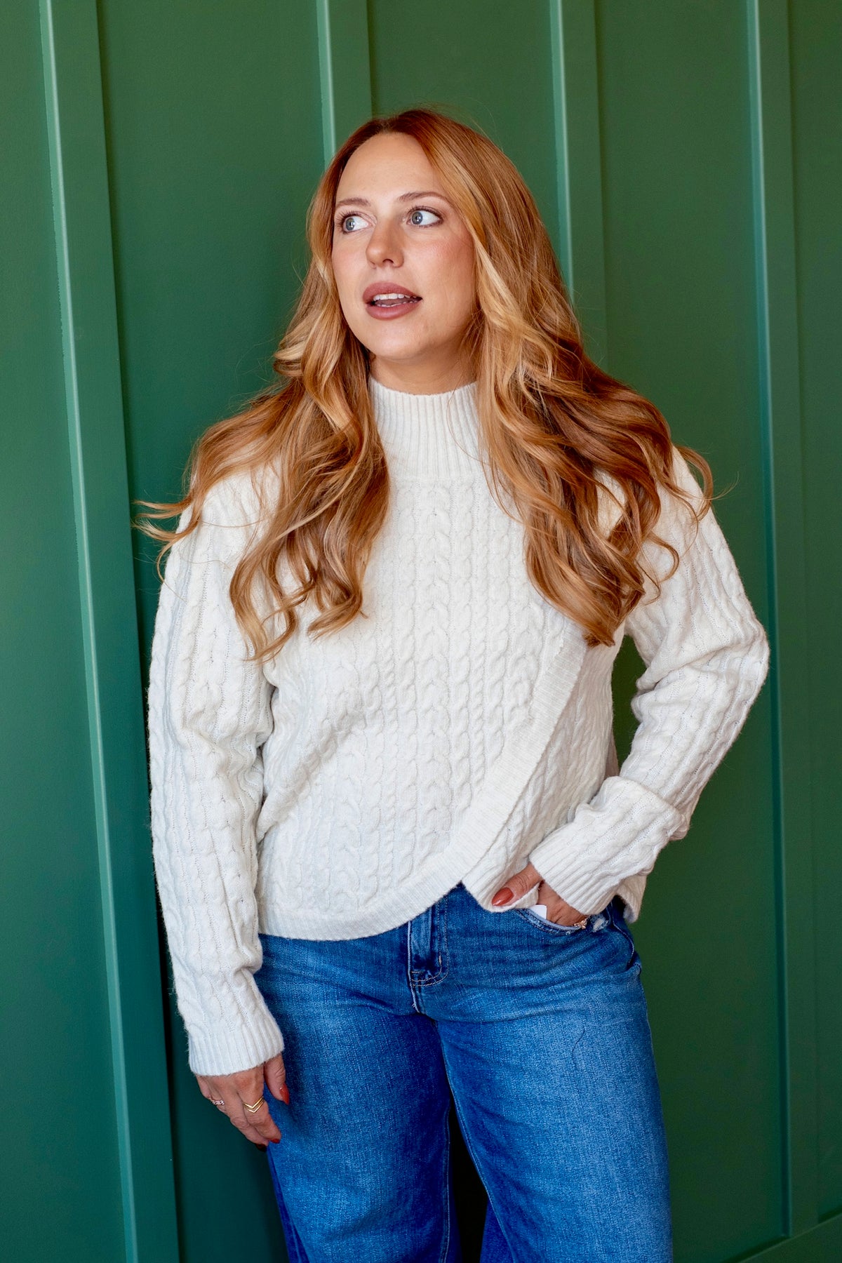 Elegant and cozy, the Cable Crossover sweater is a fresh take on a classic knit. Crafted in a soft cream hue, it features a flattering crossover front and a chic mock neck, while the timeless cable knit adds texture and dimension. Perfect for layering or wearing on its own, it’s a versatile piece that combines comfort with understated sophistication.