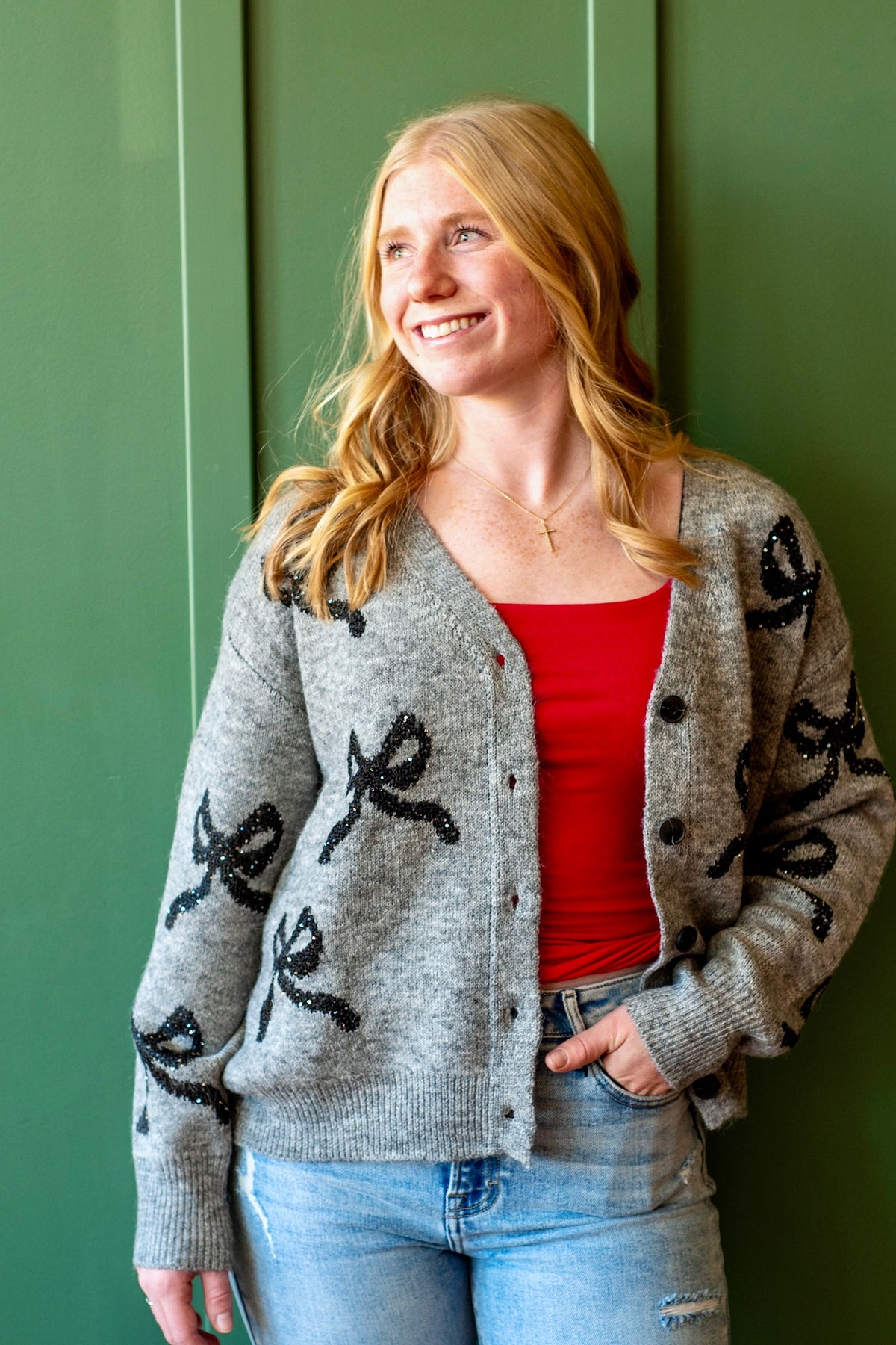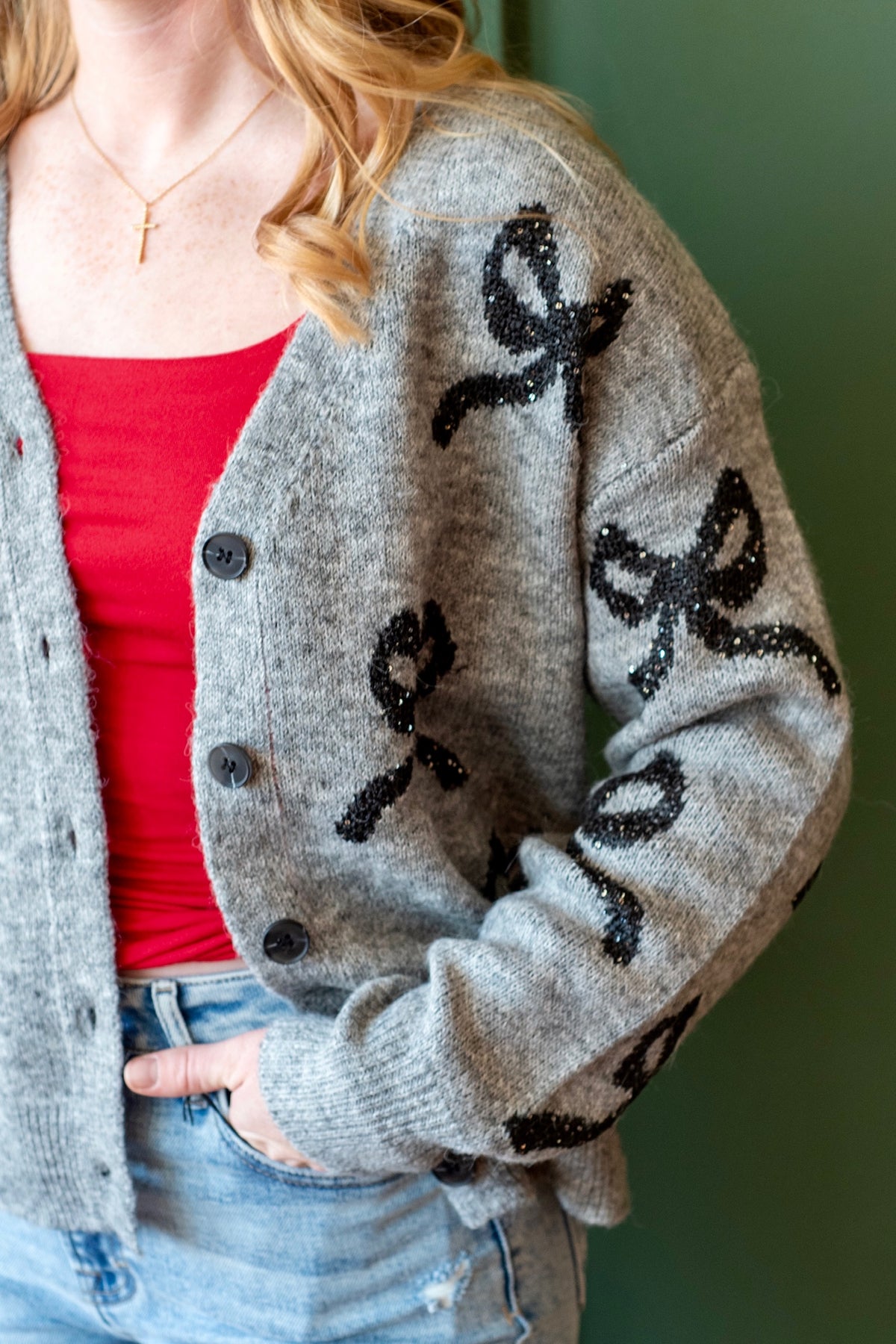 Chic with a touch of sparkle, the Glamorous Bows cardigan is the statement sweater your wardrobe’s been waiting for. This soft grey button-down is adorned with black sequin bows that catch the light just right, adding playful glam to a classic silhouette. Perfect for dressing up denim or layering over a sleek dress, it’s cozy meets captivating.