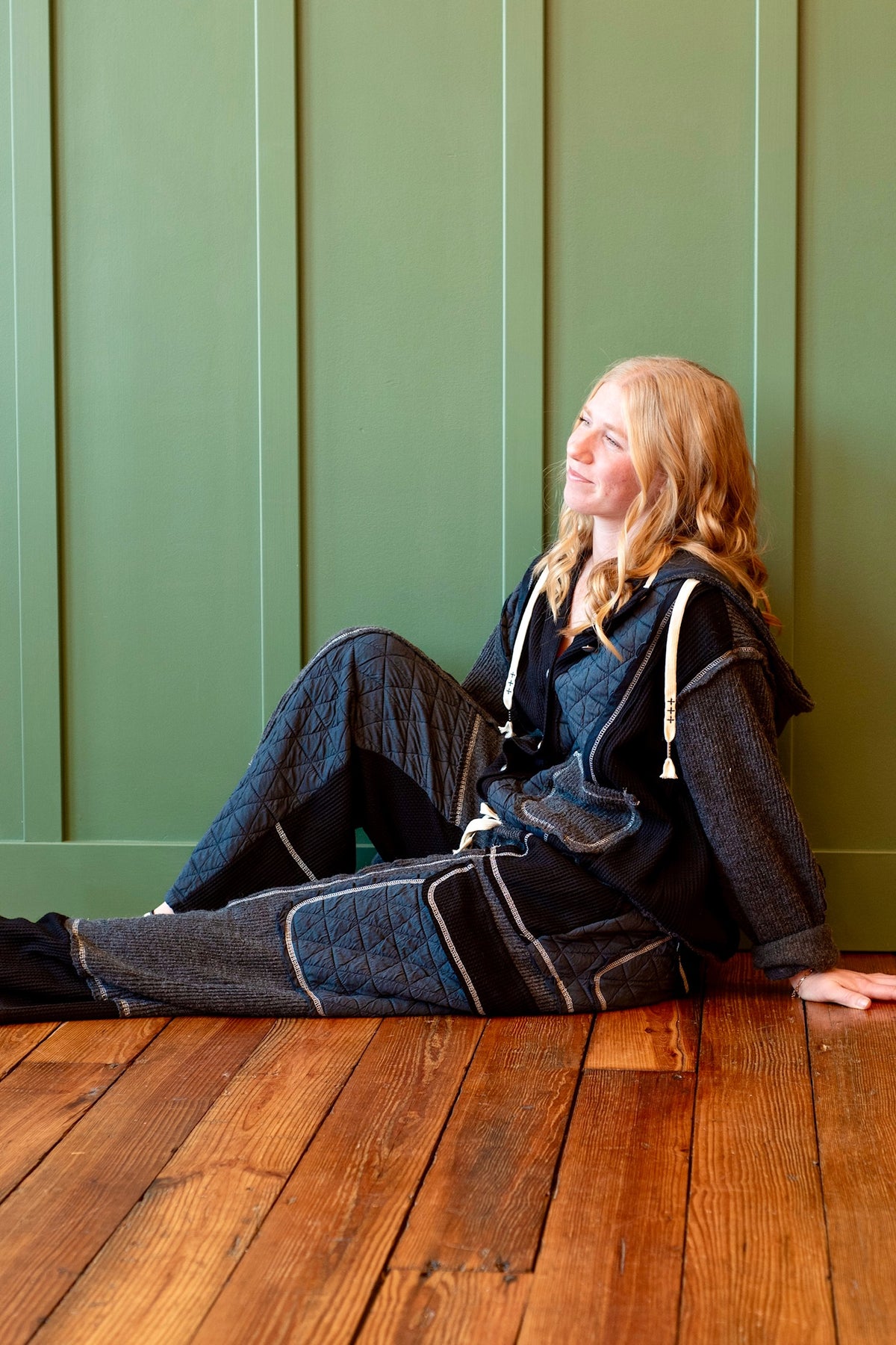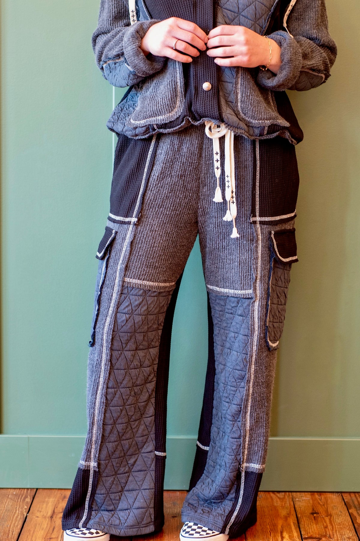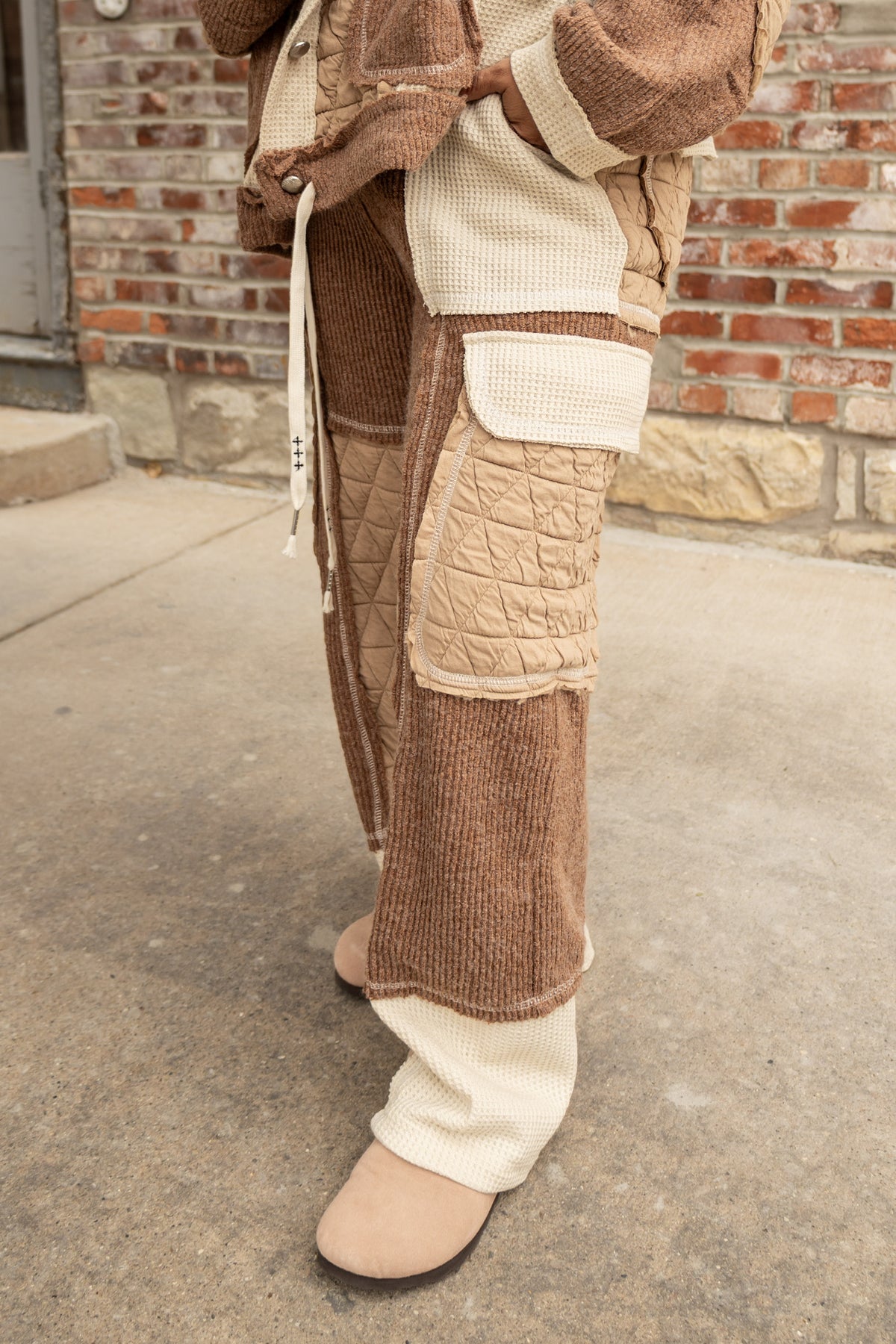 Experience ultimate comfort with the Keeping Cozy Pants, designed in a relaxed fit for effortless wear. Crafted from unique patchwork materials featuring waffle, ribbed, and quilted textures, these pants bring trendy style to your casual wardrobe. The adjustable tie waist ensures a perfect fit, making them ideal for lounging or running errands in comfort