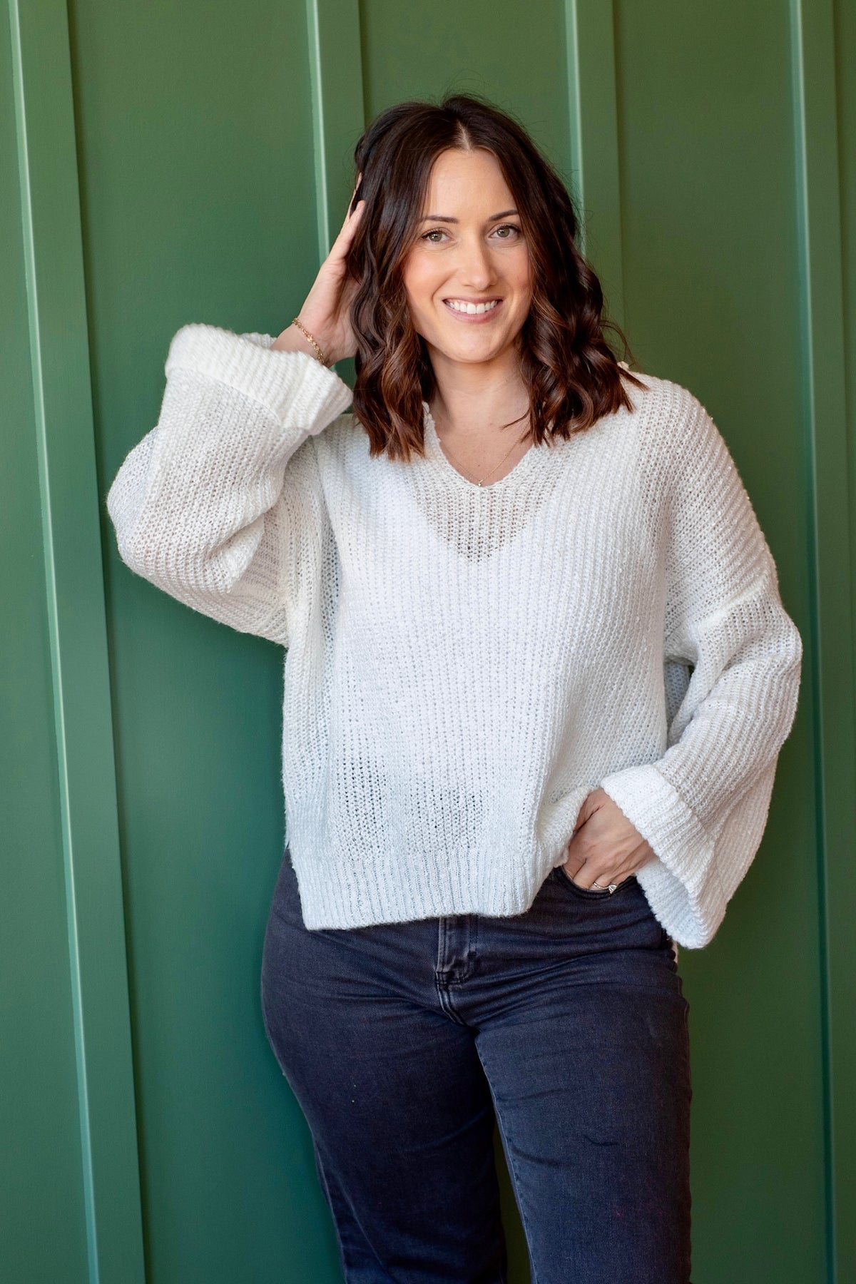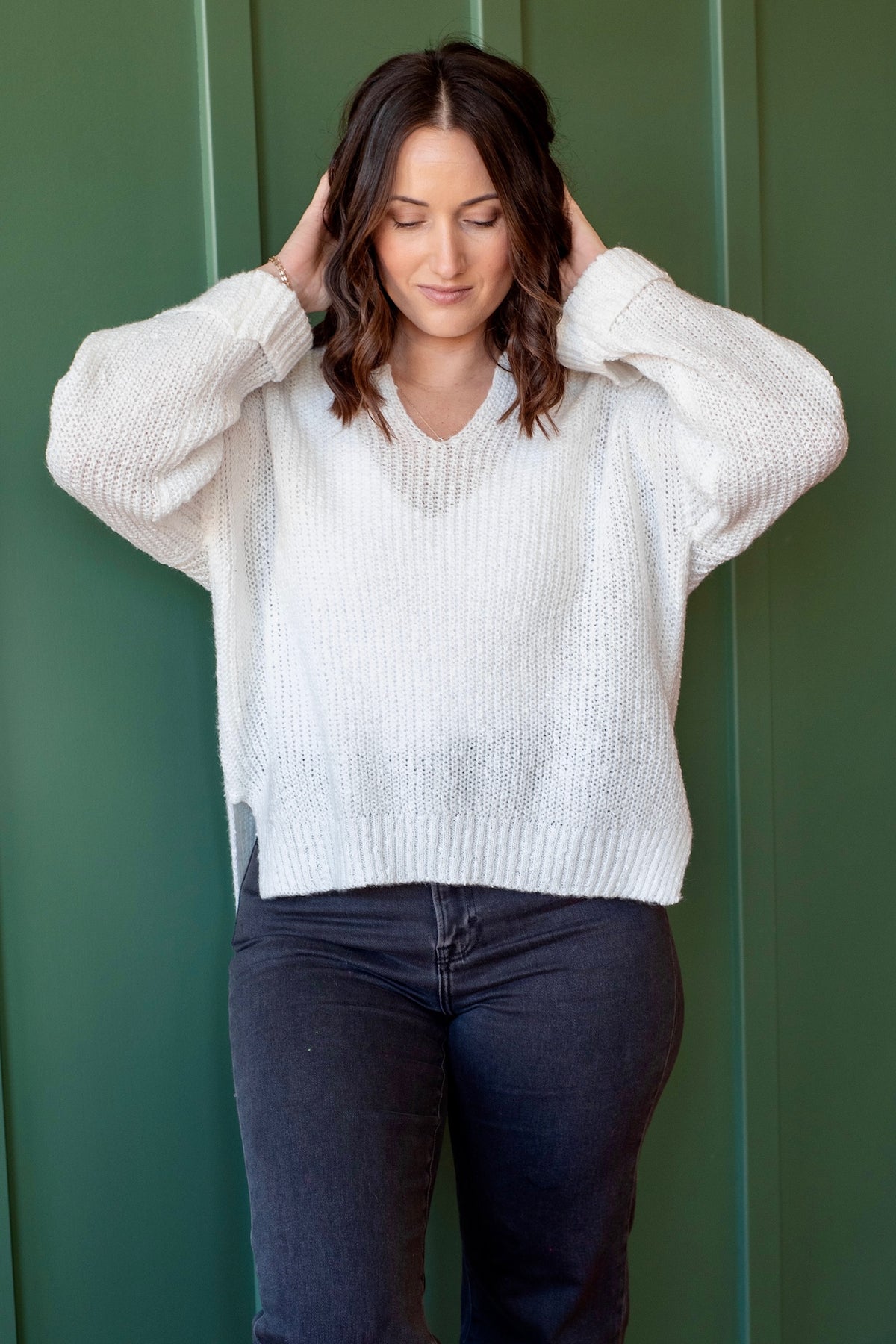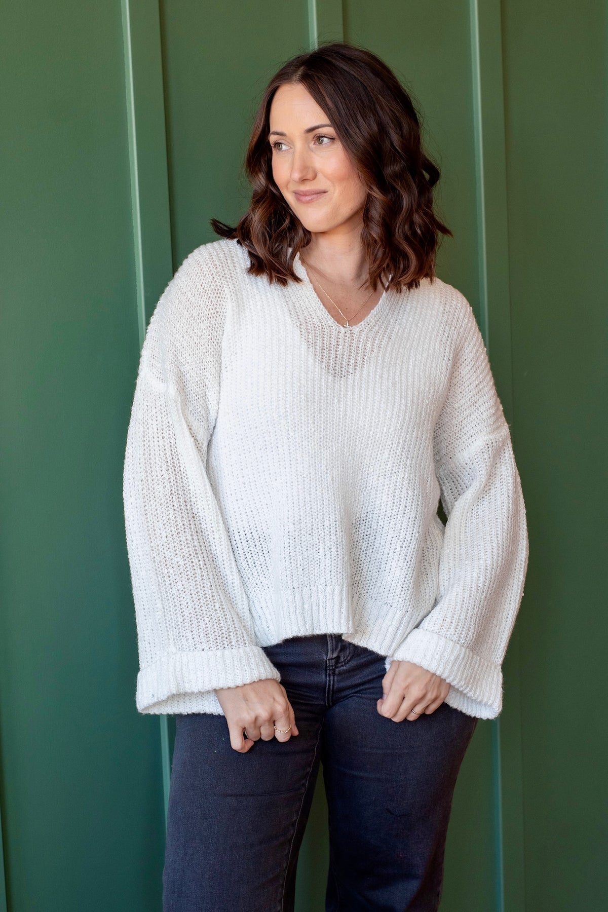 Embrace the warmth and comfort of our Marshmallow sweater! Featuring a ribbed notch neck design and a loose fit, this white sweater is perfect for cozy winter days. Wrap yourself in softness and style with our must-have Marshmallow sweater.