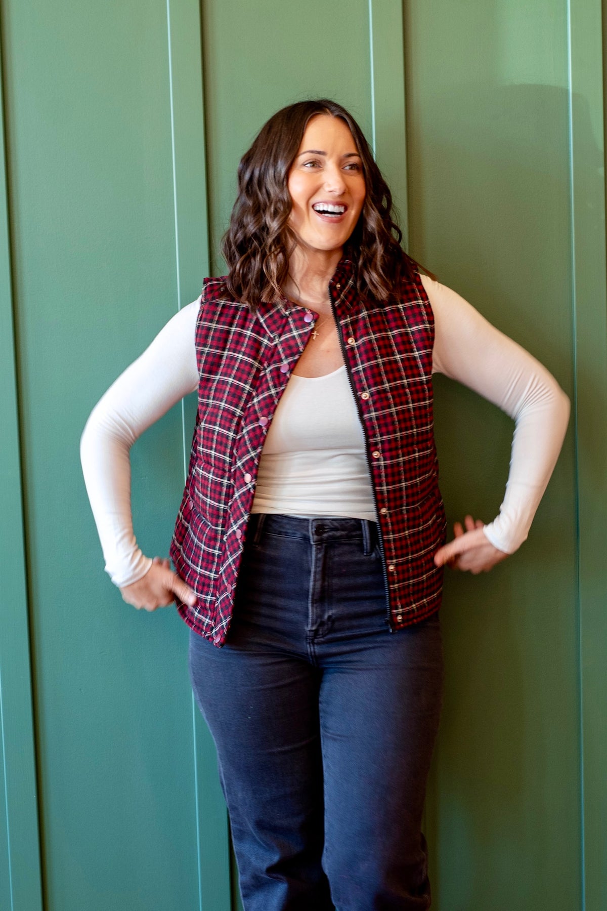Layer on the cozy. The Plaid Puffer Vest brings together classic plaid patterning with the warmth of a lightweight puffer. Designed with a snap-front closure for easy wear and versatility, this vest adds the perfect pop of print and comfort to any cool-weather look. Effortless to throw over sweaters or thermals, it’s the go-to layer for style that feels as good as it looks.