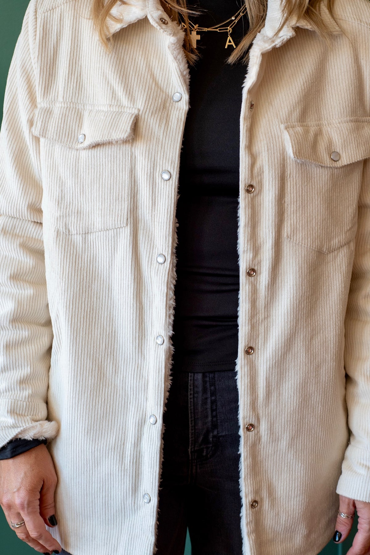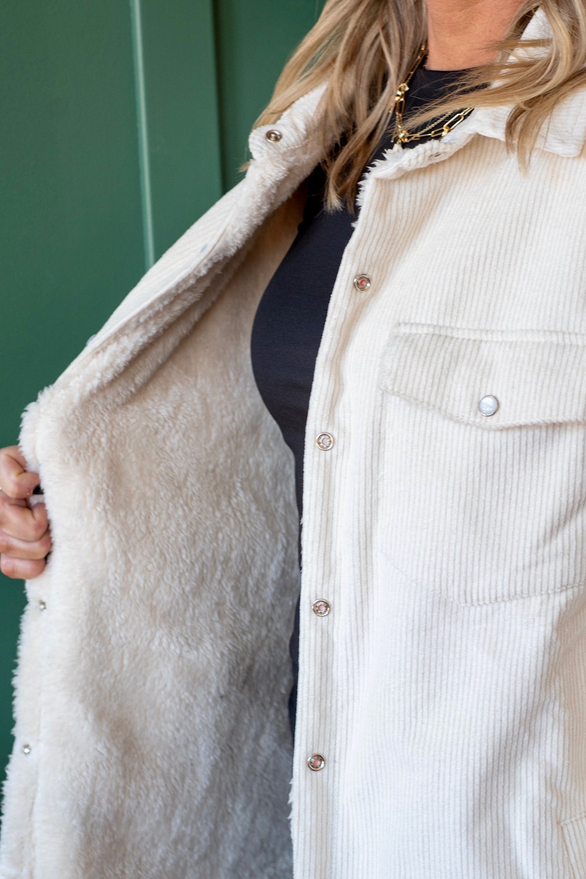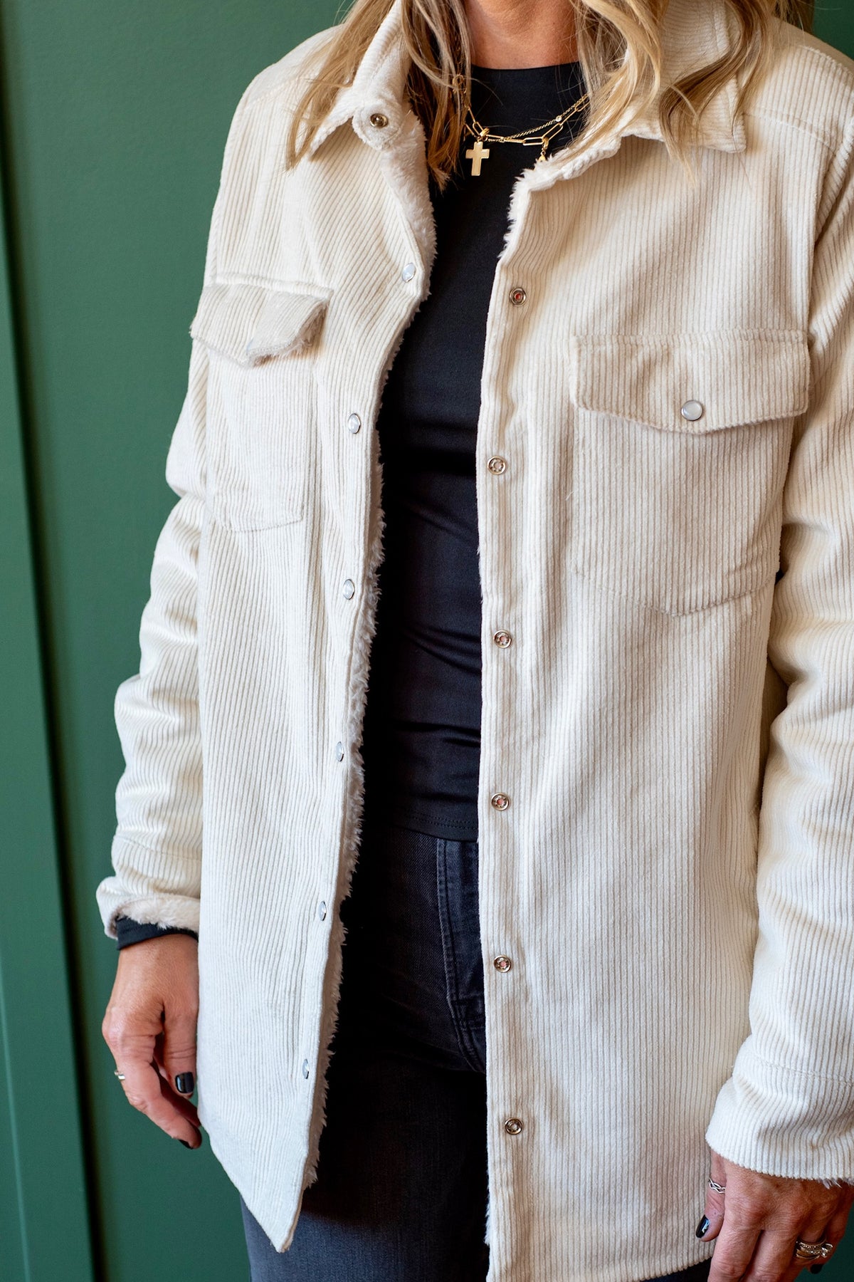 Cozy up in effortless style with the Sensational Sherpa — where classic corduroy meets next-level comfort. This cream-colored jacket features a luxuriously soft sherpa lining that wraps you in warmth from the inside out, while its structured collar and tailored fit keep things crisp and cool. Whether you're layering up for chilly mornings or adding a vintage-inspired edge to your weekend look, this jacket is your go-to for fall and beyond.