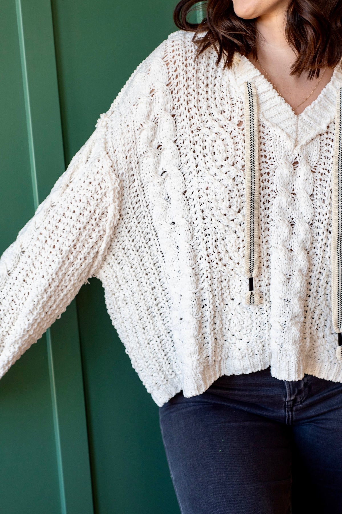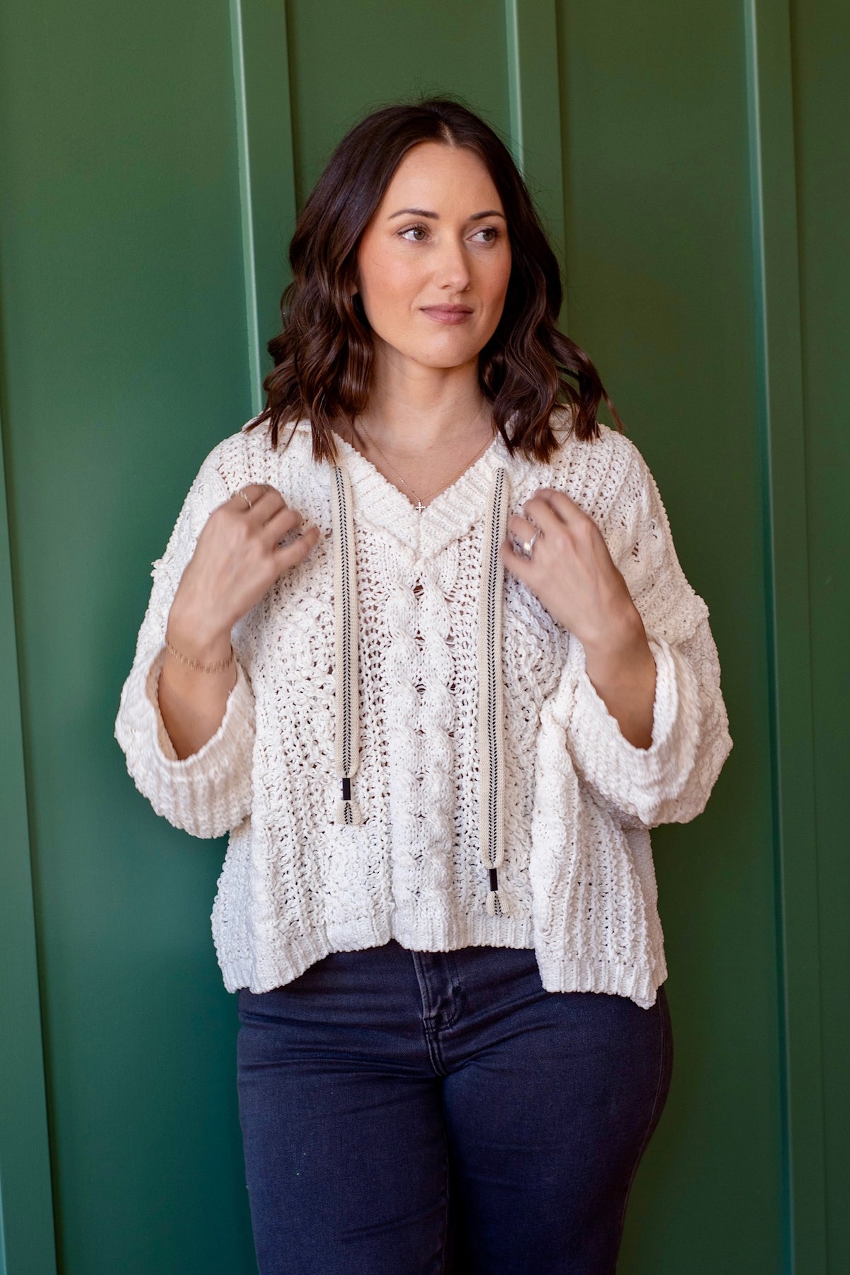 Cozy up in understated elegance with Vanilla Dusk. This V-neck hoodie sweater is crafted from ultra-soft chenille in a dreamy cream shade, blending comfort with a delicate, elevated feel. Long sleeves and a relaxed fit make it perfect for layering, while the charming front tie detail adds a gentle, feminine touch. Whether you're winding down or stepping out, Vanilla Dusk brings warmth and softness to every moment.