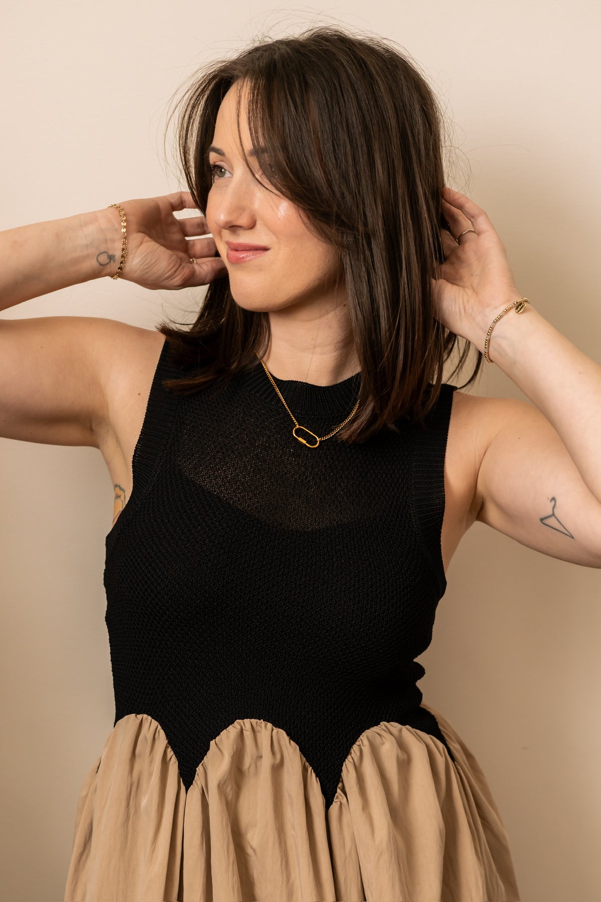 Falling Grace captures the essence of early autumn in a graceful midi silhouette. The wavy waist detail adds subtle movement and dimension, while the ribbed bodice provides a refined, structured fit that flatters effortlessly. Perfect for transitional weather, this dress transitions seamlessly from day to evening, offering understated elegance when you need it most. A timeless piece that celebrates the quiet beauty of the season. This dress has a sheer top and needs an under shirt.