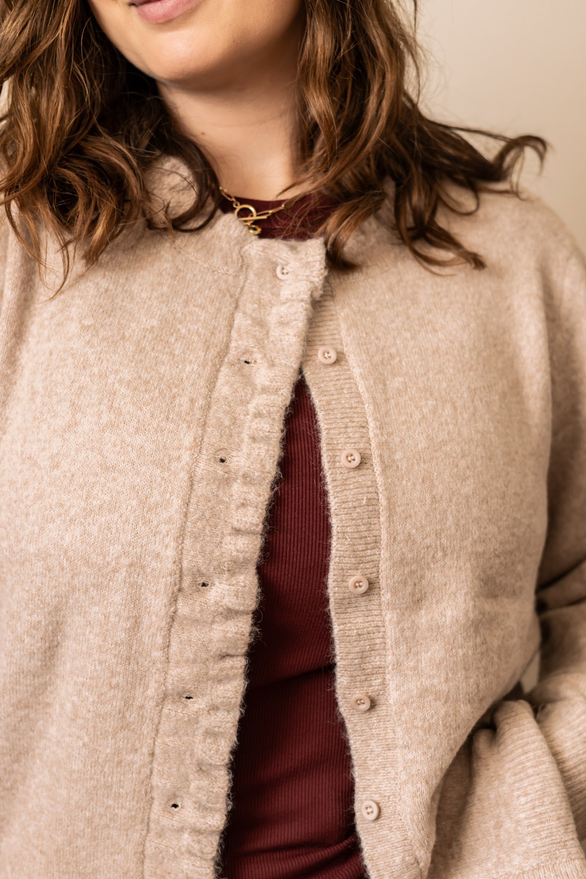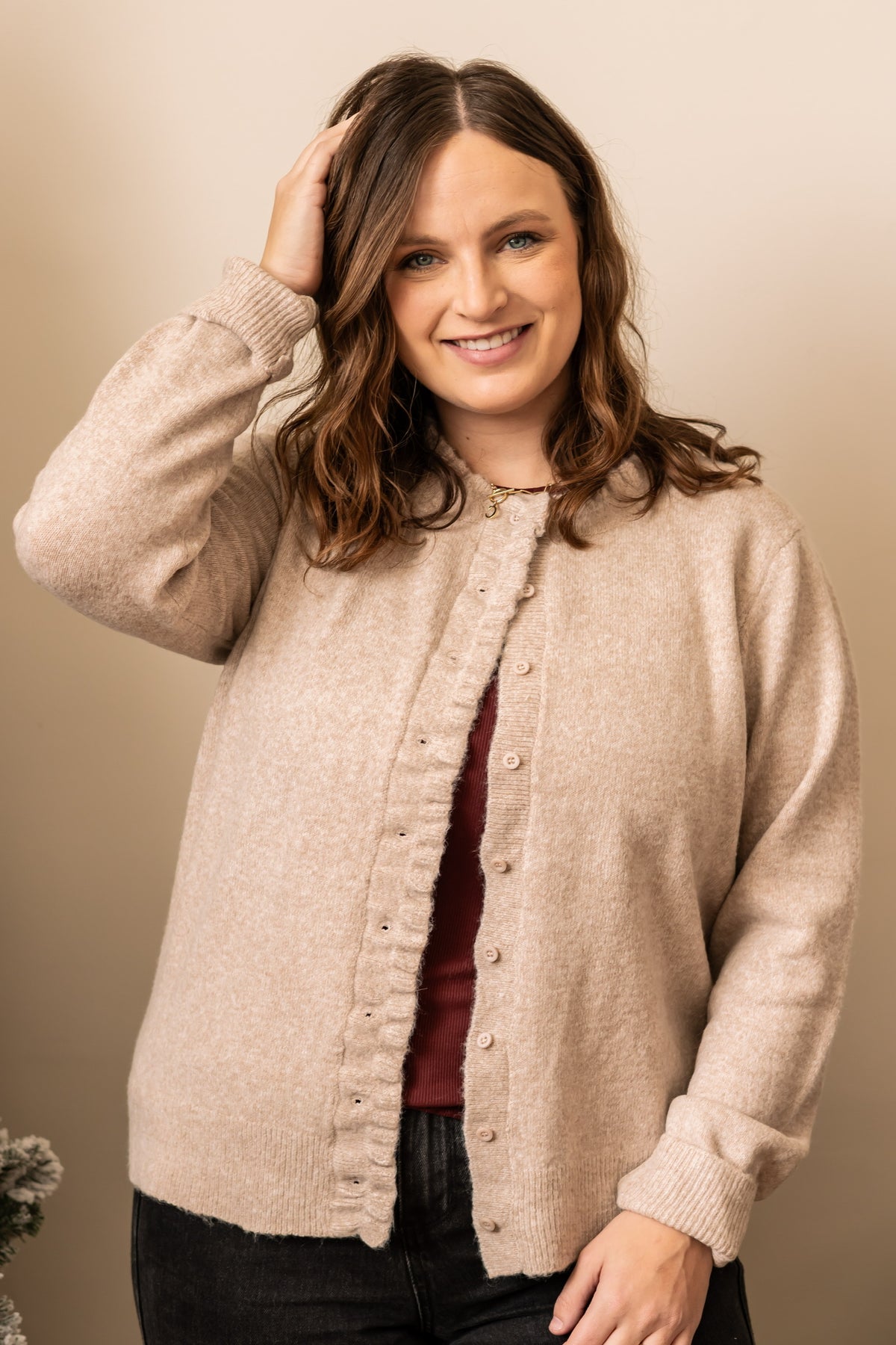 Honey Crumble — Sweet, cozy, and effortlessly charming. This oatmeal button-down cardigan features delicate ruffle detailing along the neckline and placket, adding a touch of feminine elegance to its classic crew neck silhouette. Soft, versatile, and perfect for layering, Honey Crumble is a warm, stylish staple for every wardrobe.