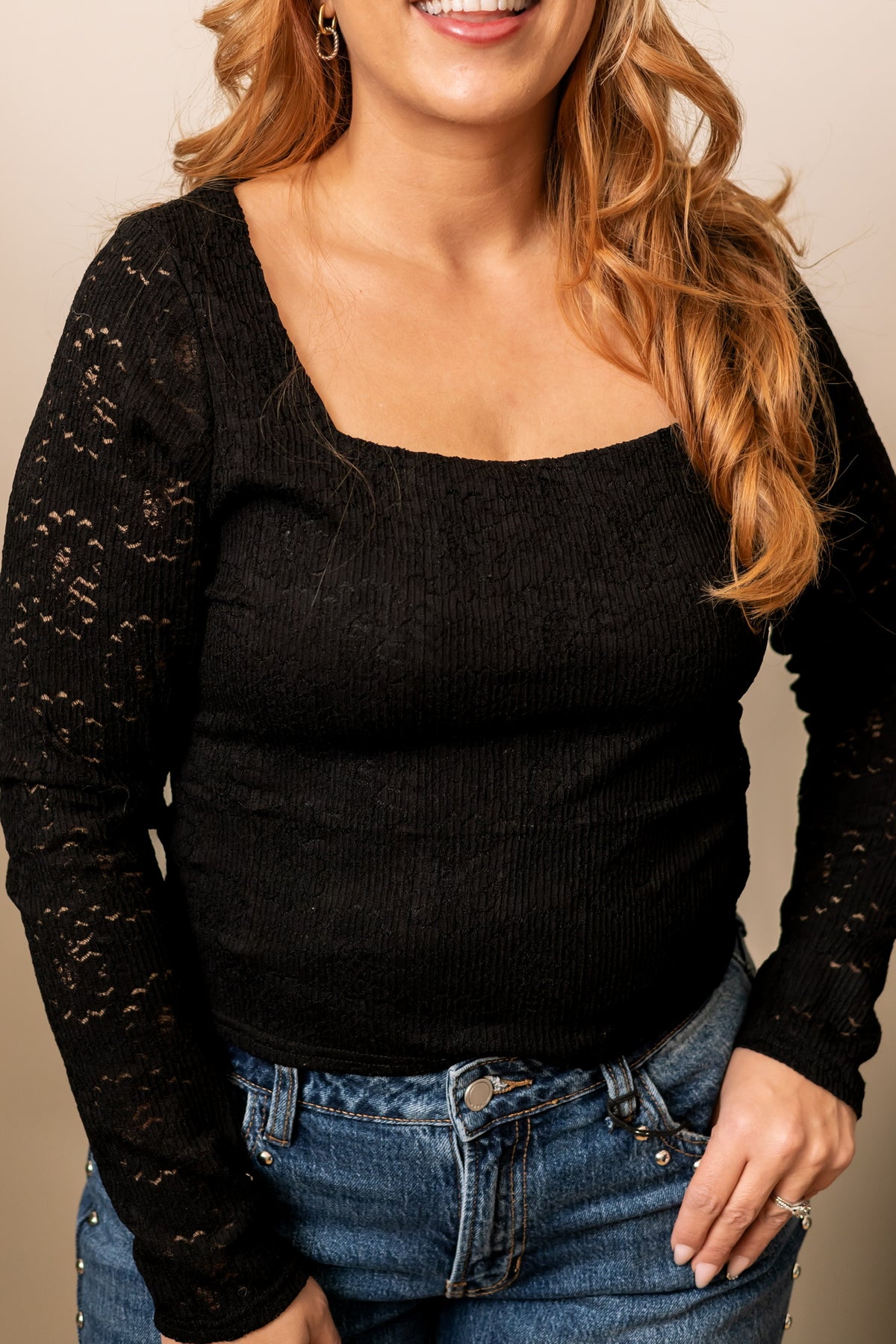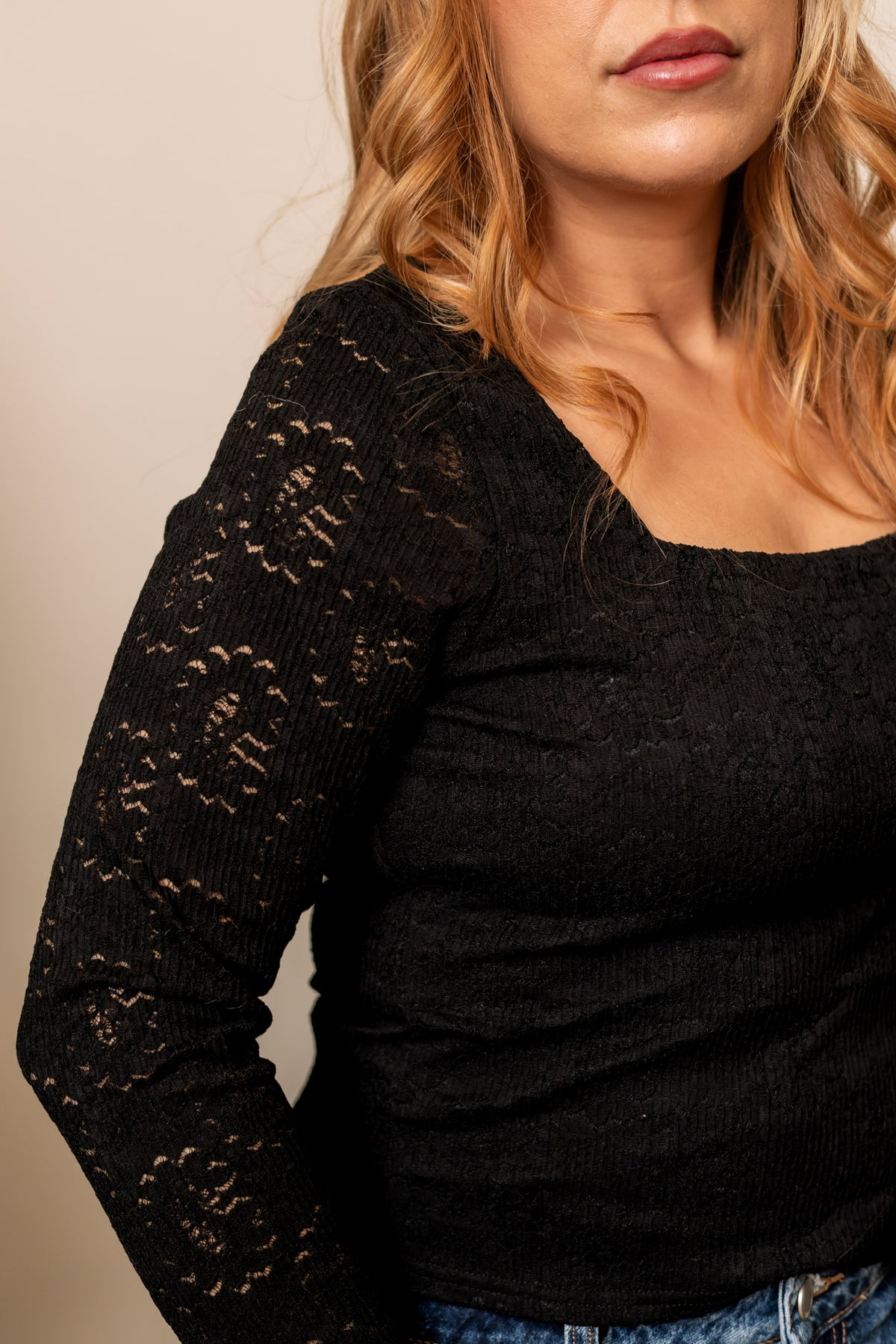The Enchanted Lace top is a romantic wardrobe staple. Crafted from soft knit fabric with delicate embroidered lace, it features a flattering square neckline and long sleeves for a timeless, feminine look. Perfect for layering or wearing on its own, this top brings an air of elegance and enchantment to any outfit.
