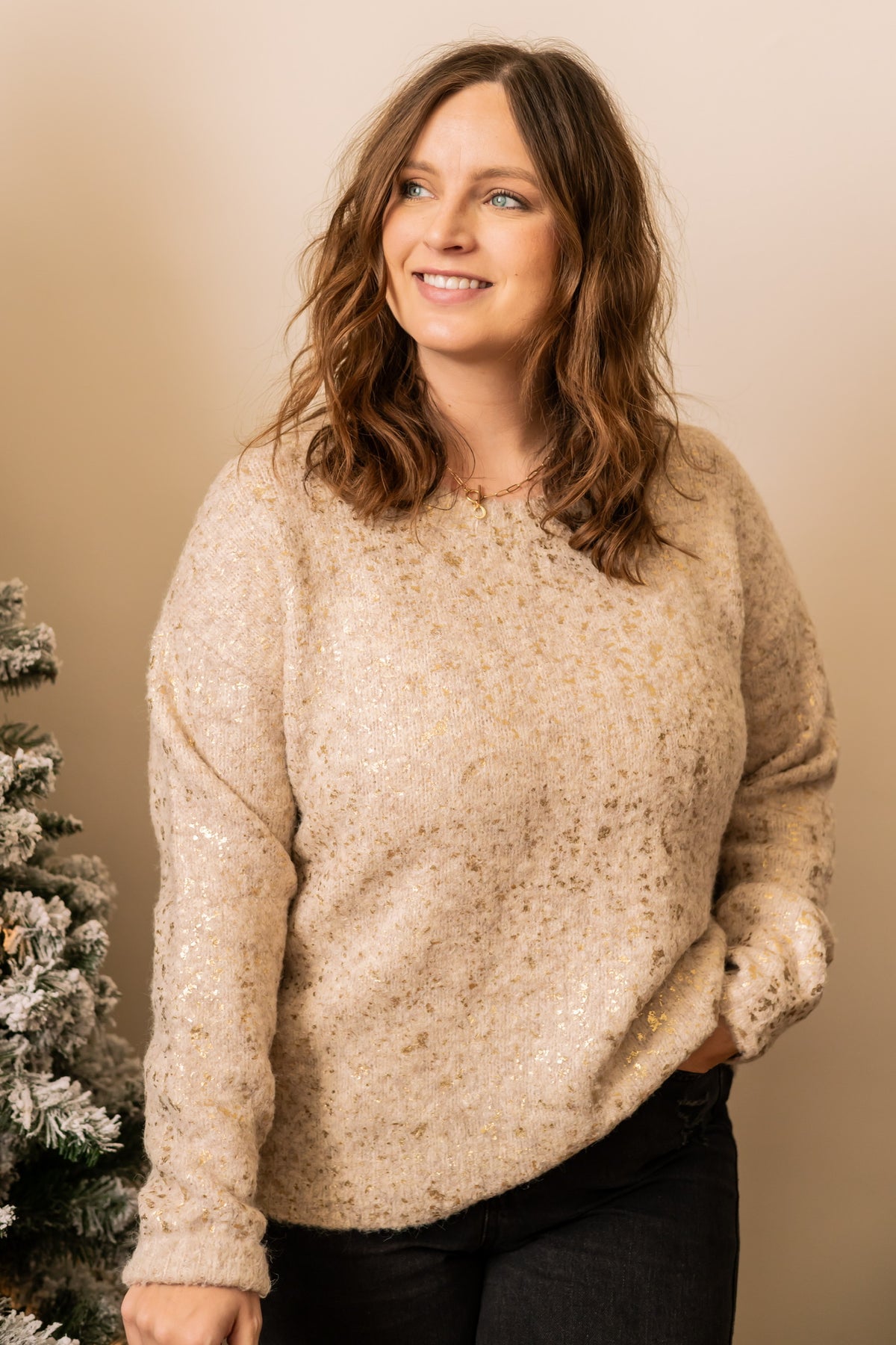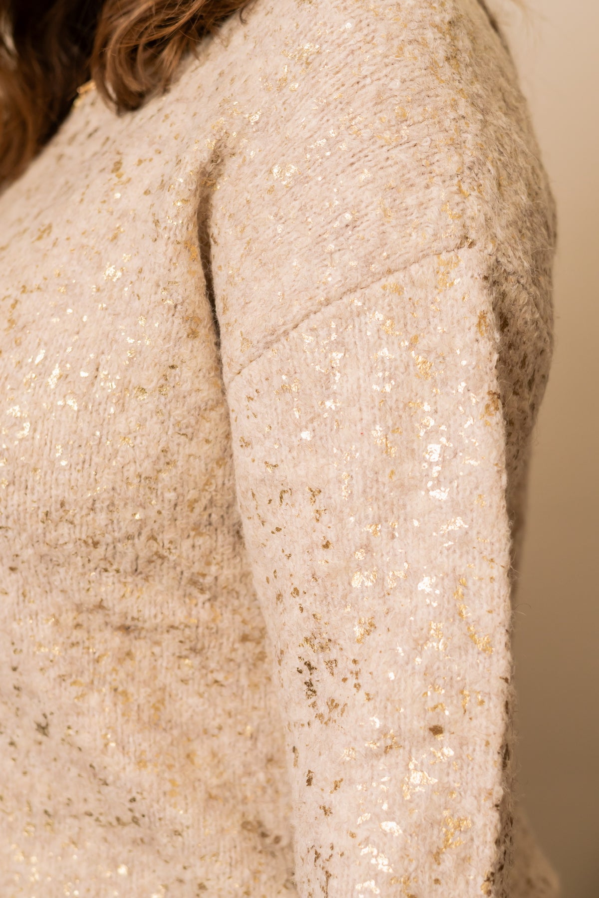 Gold Foils – Add a little sparkle to your sweater game. This crew neck knit is sprinkled with subtle speckled foil detailing, giving it just the right amount of shimmer without being over the top. Cozy and chic, it’s the perfect balance of everyday comfort and standout style. Dress it up with tailored pants or keep it casual with denim—either way, this sweater shines in every setting.