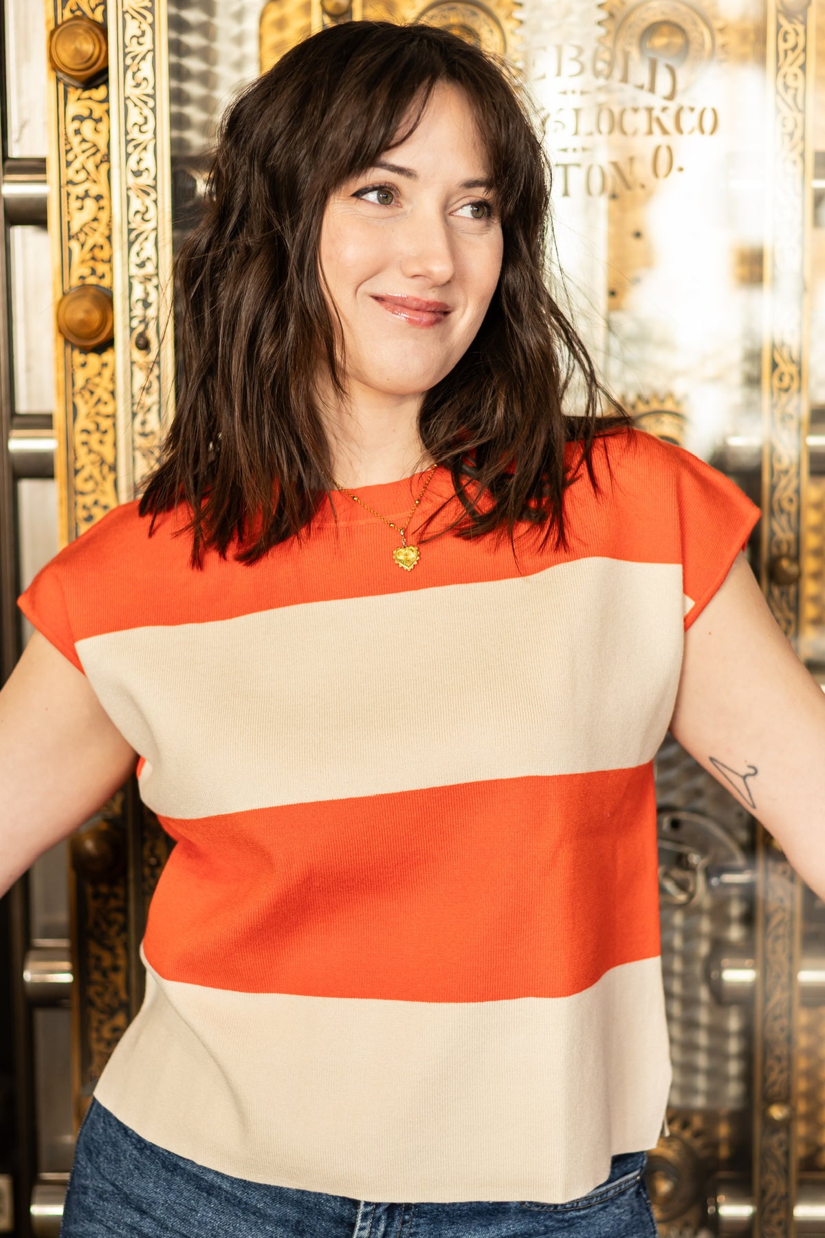 This striped muscle tank combines understated elegance with everyday wearability. Bright poppy and natural hues create a balanced, harmonious look, while the shorter cap sleeves provide gentle coverage without constraint. The semi-flowy cut skims the body gracefully, offering comfort that moves with you. A timeless piece that pairs effortlessly with your favorite bottoms for a relaxed, put-together aesthetic.