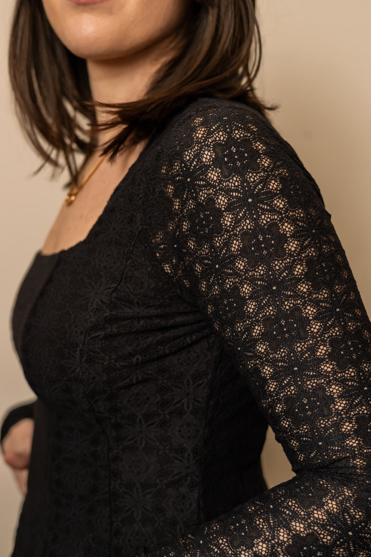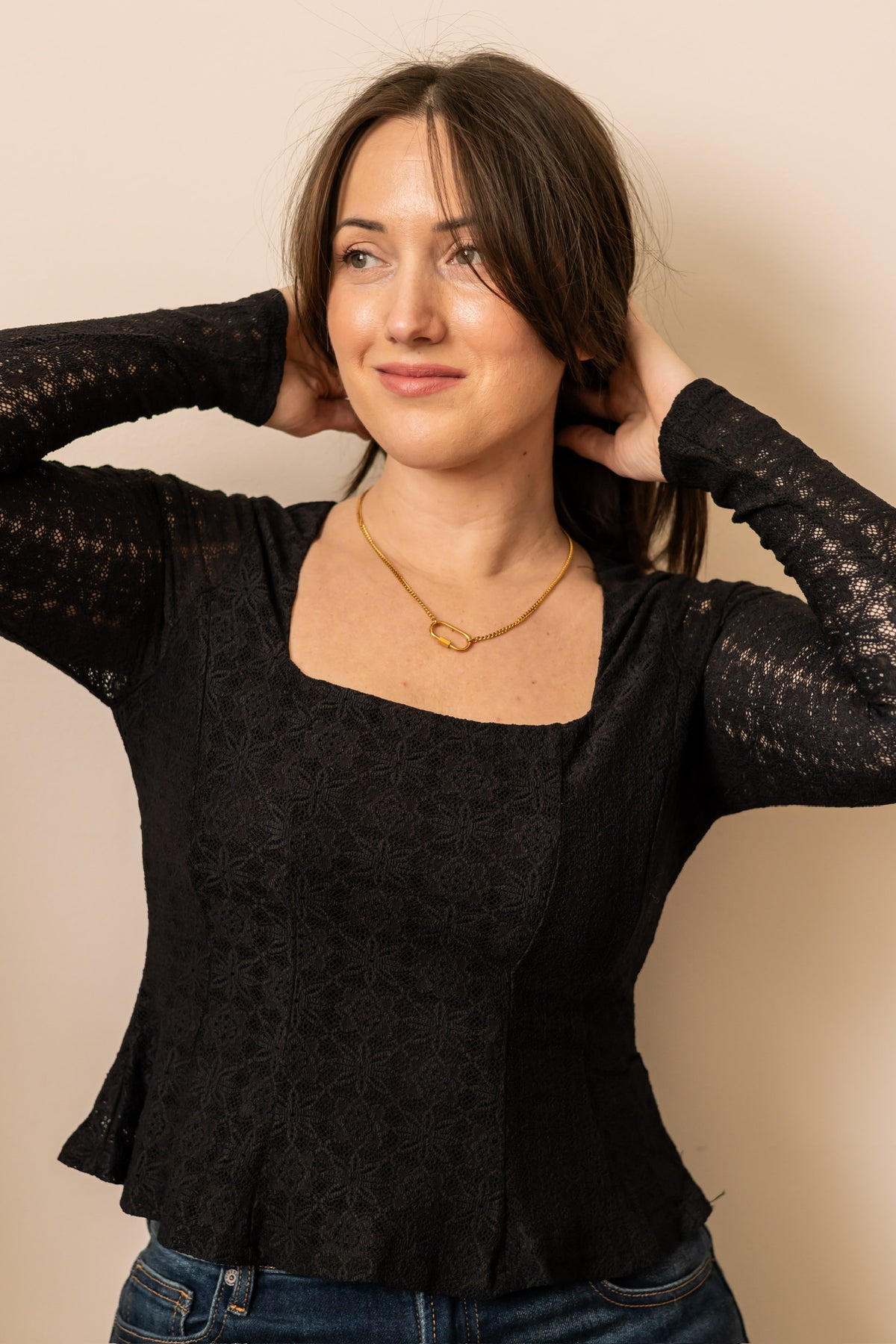 The Princess Peplum top is a delicate blend of elegance and structure. Crafted from a soft knit lace, it features a flattering square neckline, long sleeves, and princess seams that shape the silhouette beautifully. A subtle peplum hem adds a feminine flare, making this top perfect for dressing up or adding a romantic touch to everyday outfits.