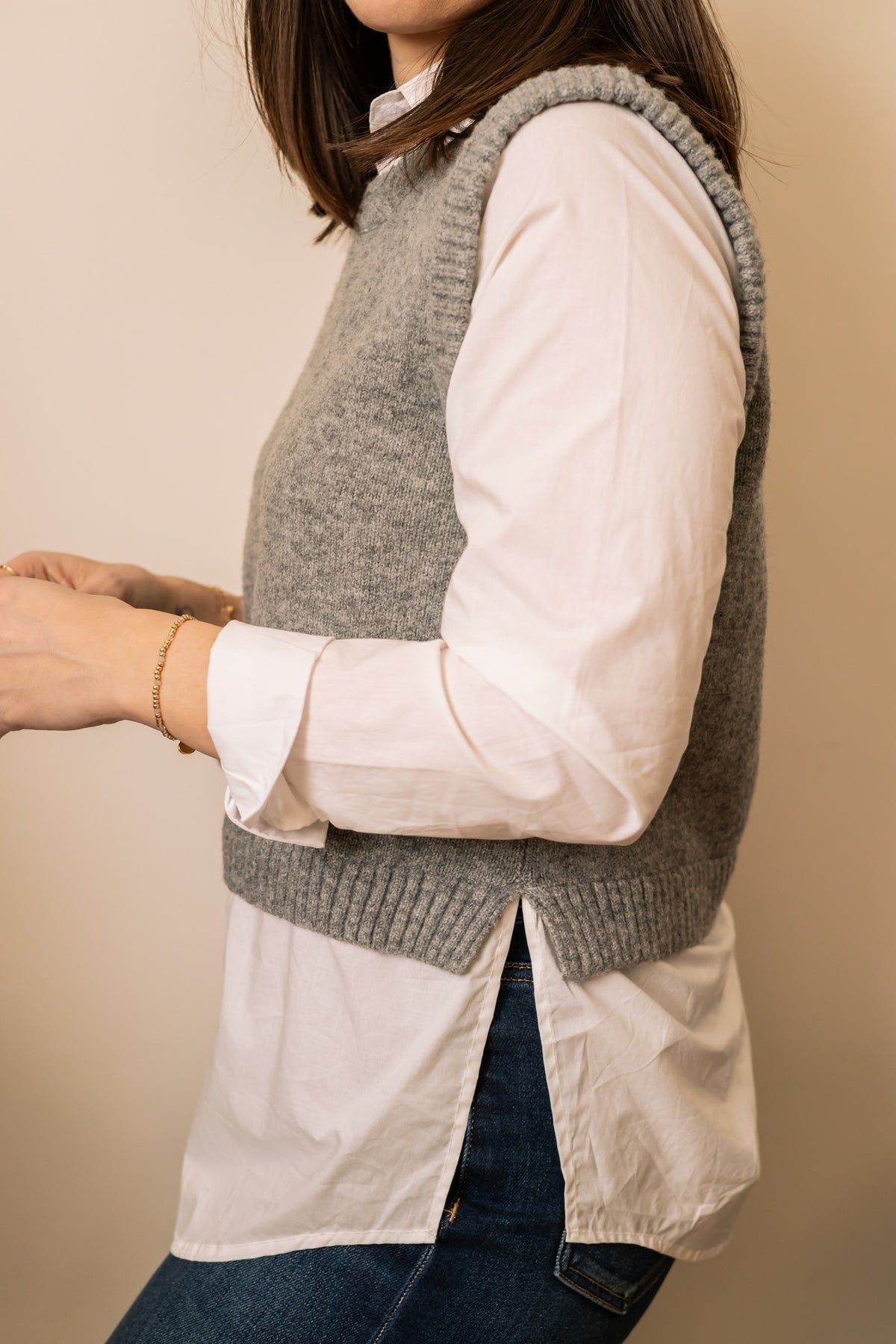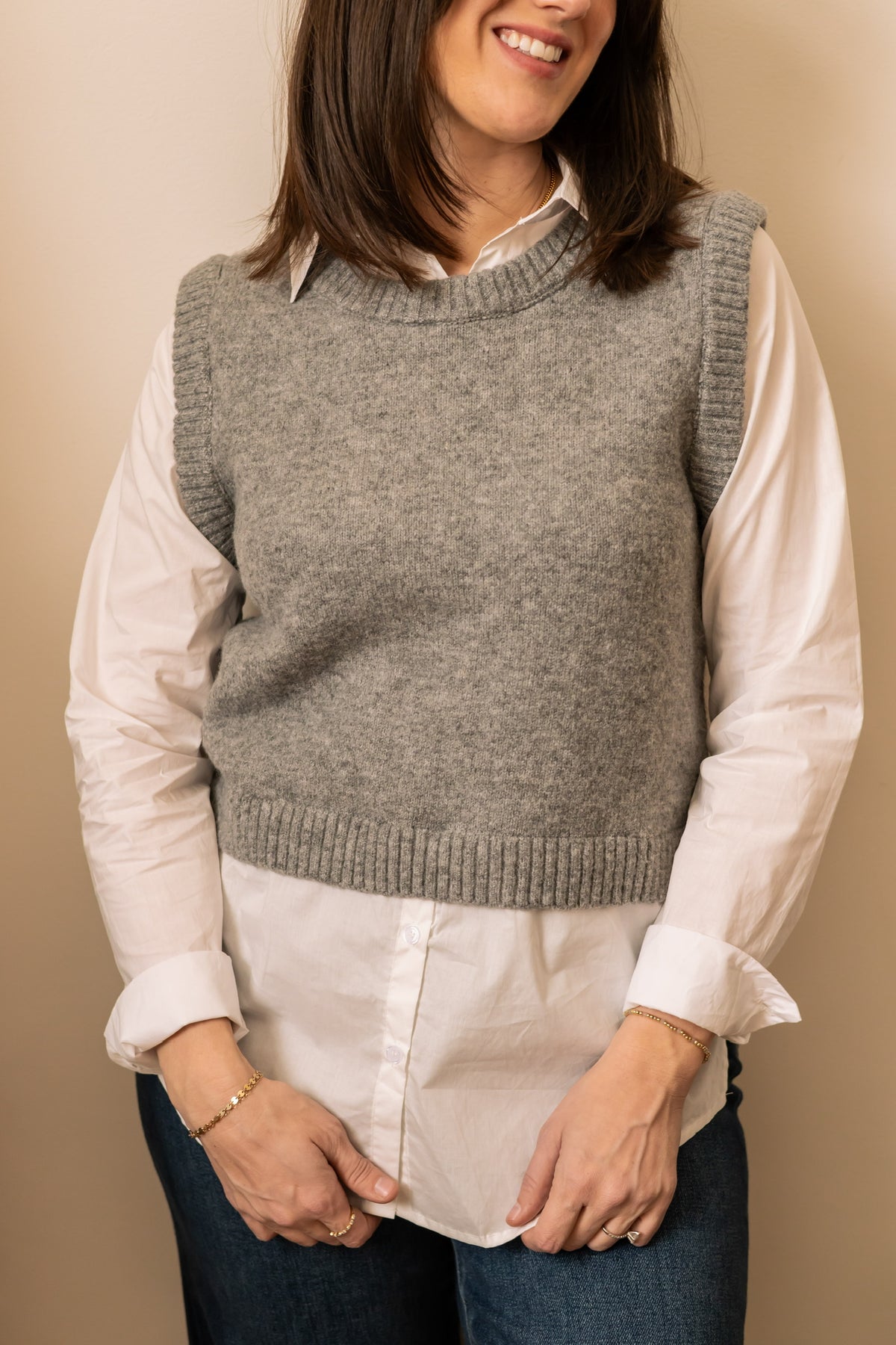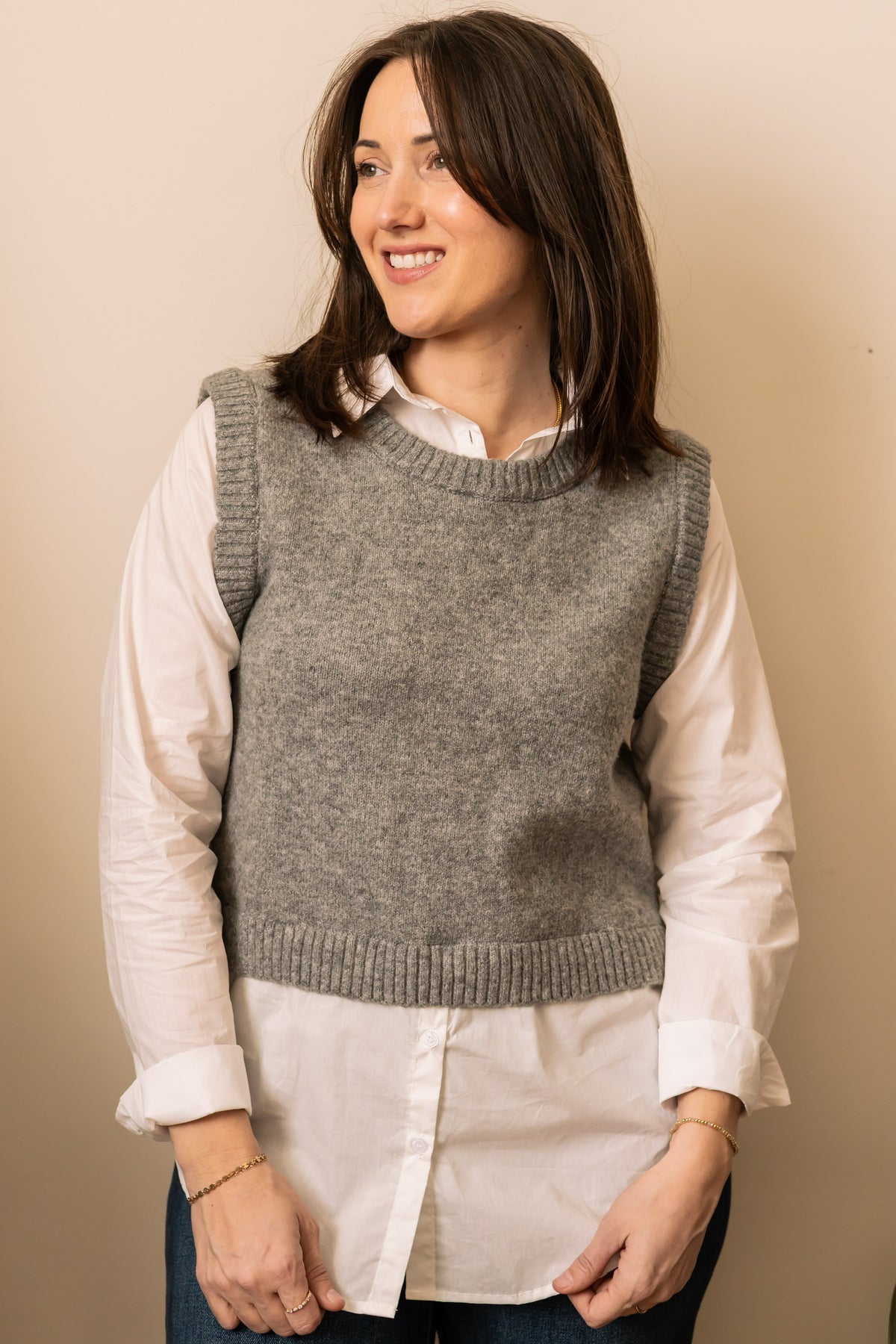 This Scholar Top combines a crisp white button-up long sleeve shirt with an attached grey vest, creating a polished, layered look without the bulk. Designed for a refined, professional appearance, it offers the convenience of a single garment while maintaining sharp tailoring. Ideal for office settings or formal occasions, this top delivers both style and practicality with its integrated design.