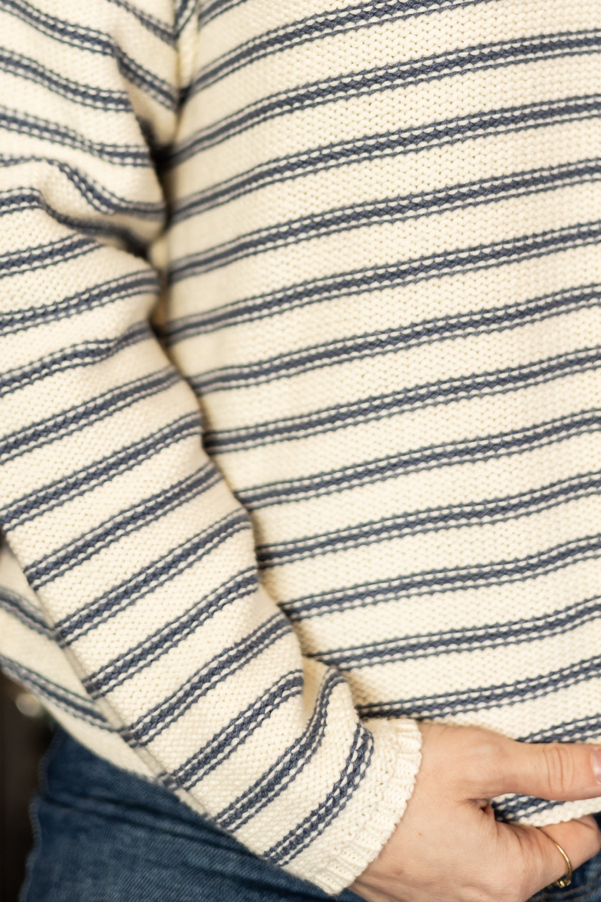 The Soft Tide sweater bridges seasons with understated elegance. Crafted in a breathable, lightweight knit, this piece features timeless navy and natural stripes with a graceful V-neckline and long sleeves. Designed for layering without weight, it transitions seamlessly from spring warmth to summer evenings. Its relaxed sophistication makes it a wardrobe essential that works with nearly everything you own.