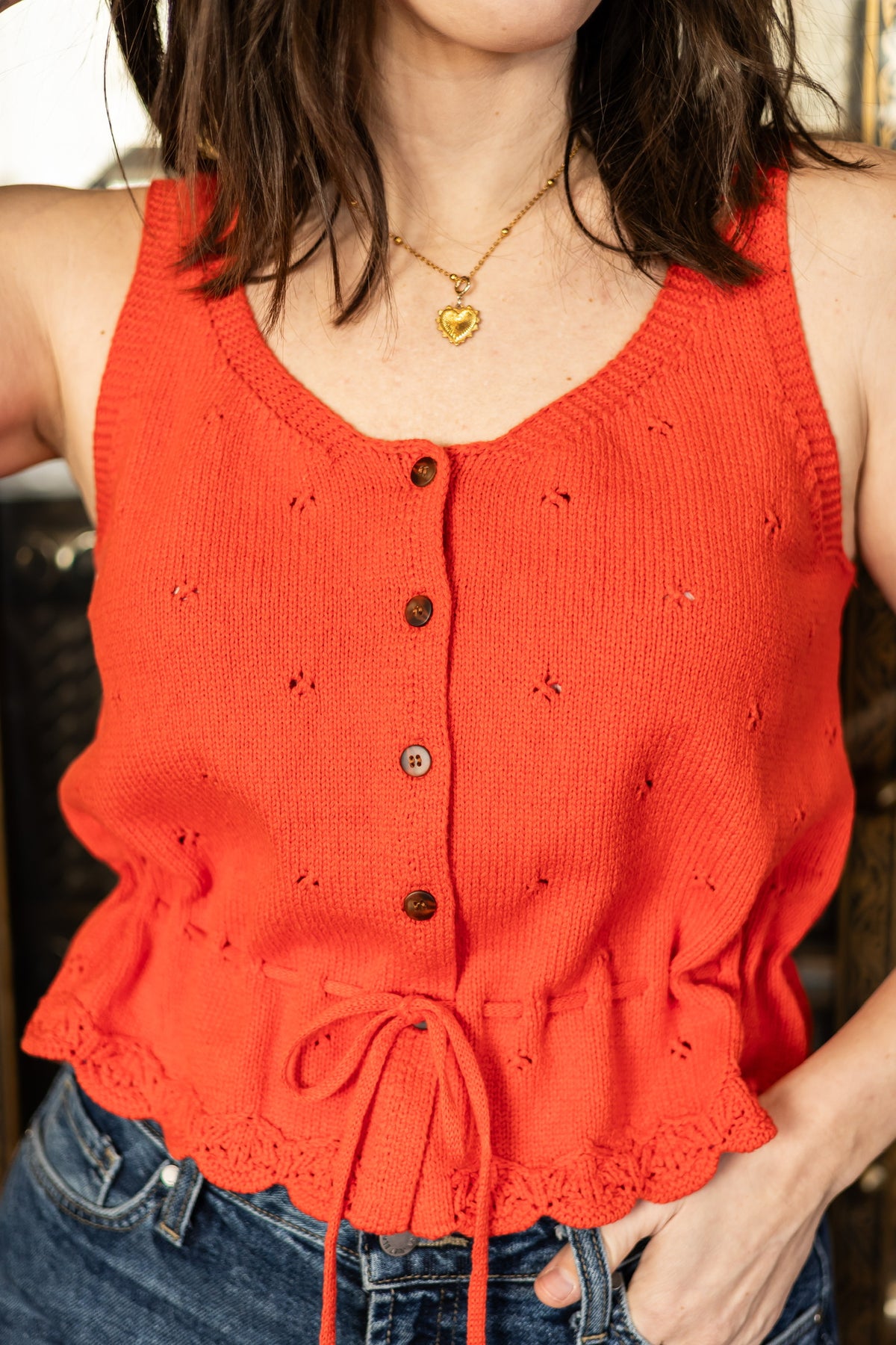 Settle into comfort with this papaya sweater tank, designed for moments of ease and grace. The scallop hem adds a refined finishing touch that speaks to thoughtful craftsmanship, while button accents provide understated charm. An adjustable waist tie lets you customize your silhouette, adapting to your needs with gentle flexibility. Lightweight yet cozy, this versatile piece becomes an anchor in your wardrobe—perfect for layering or standing alone as a serene everyday staple.