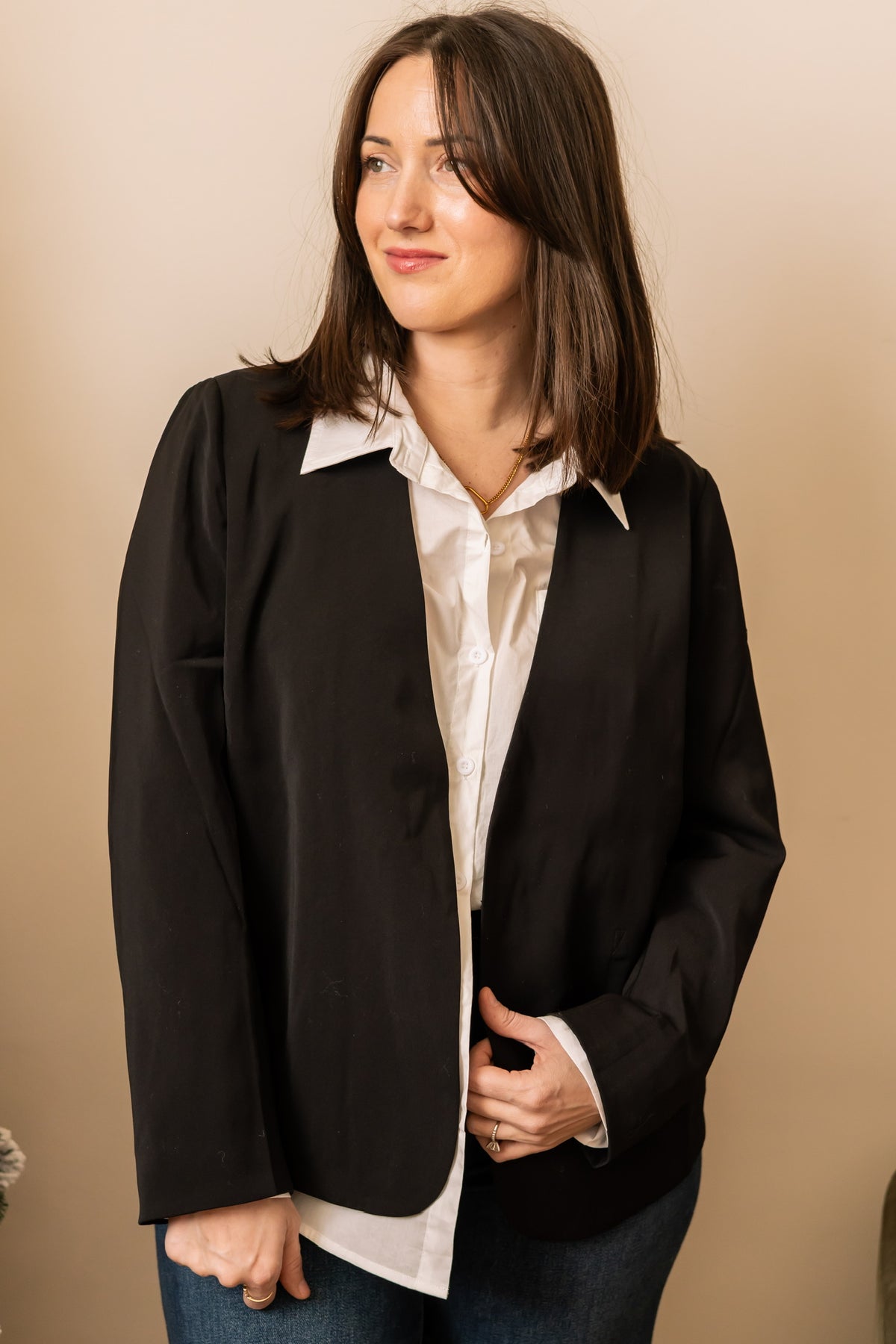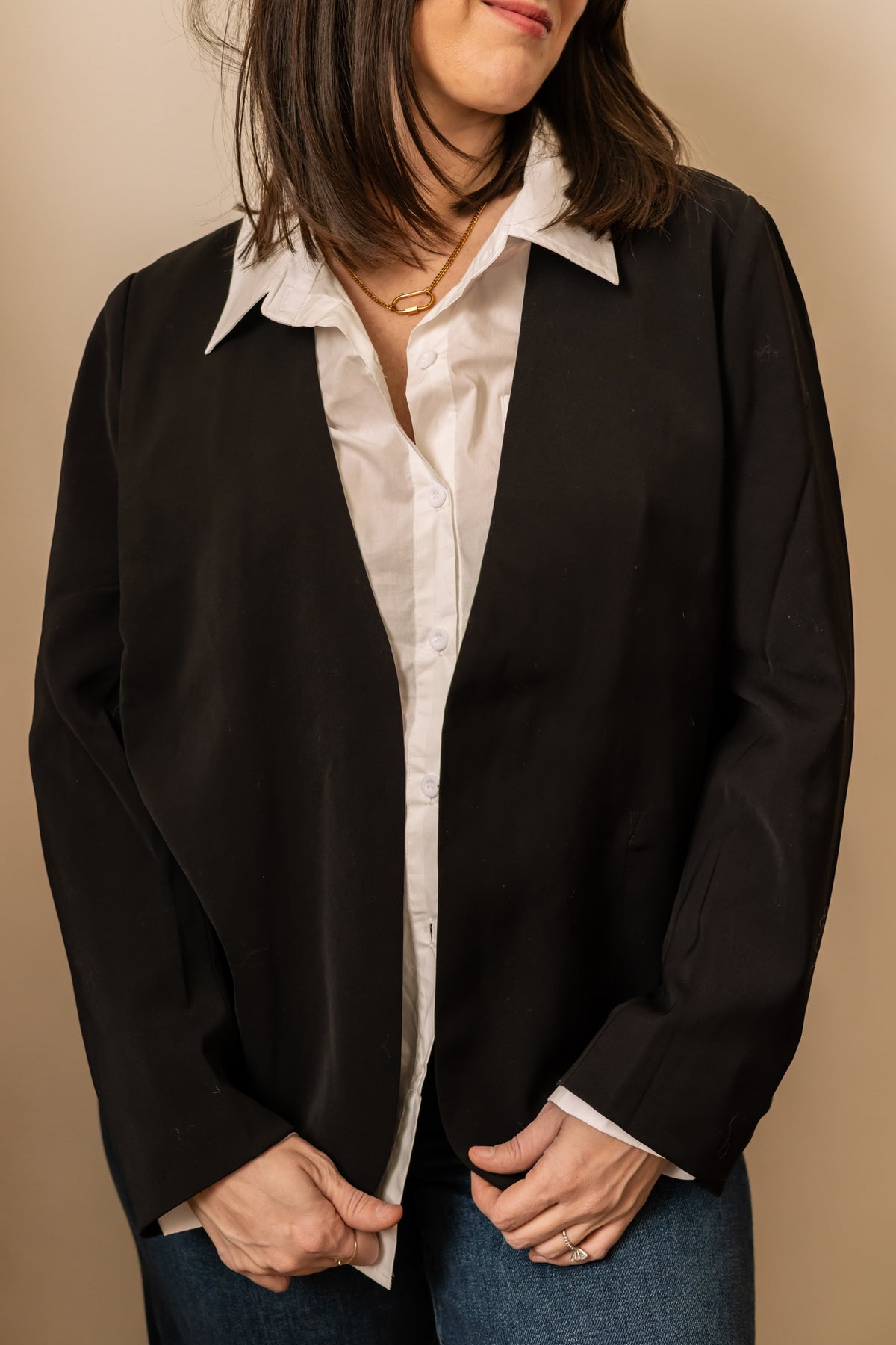 Sophisticated and effortlessly versatile, The Anya Blazer is a wardrobe essential. Its sleek black finish and tailored silhouette create a polished, flattering fit, perfect for dressing up or adding a sharp edge to casual looks. Whether layered over a dress or paired with jeans, this blazer brings timeless elegance to every outfit.
